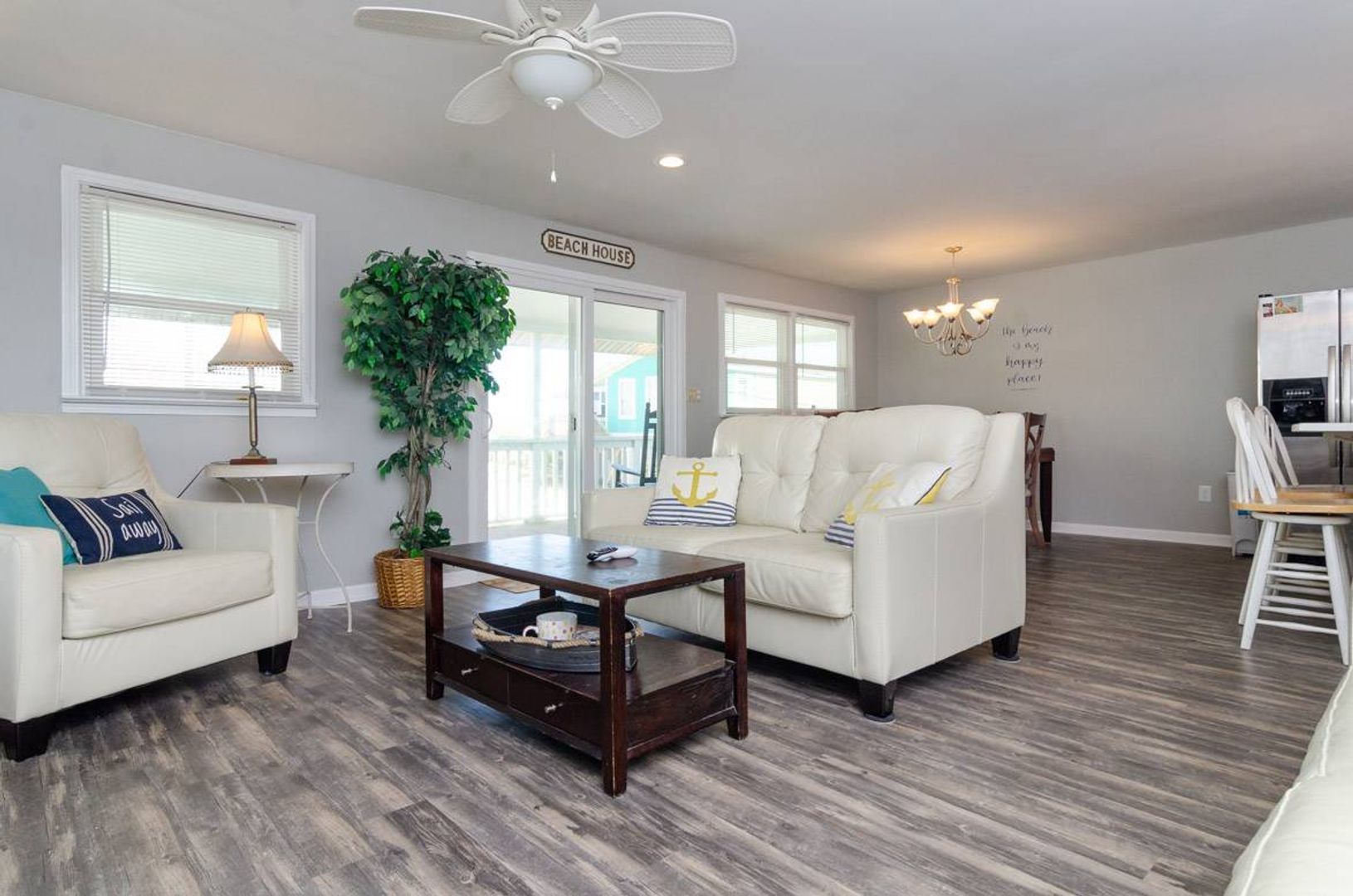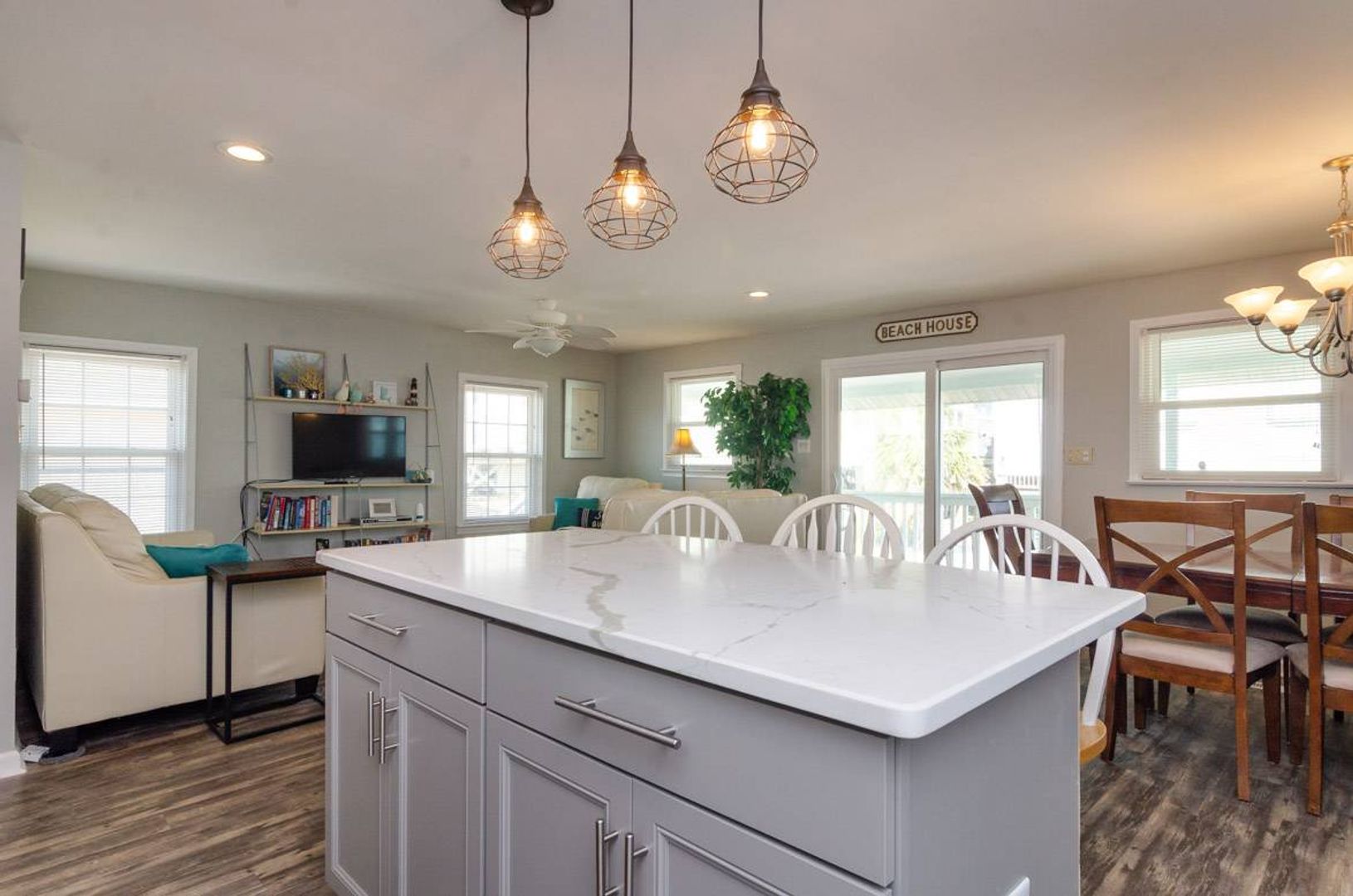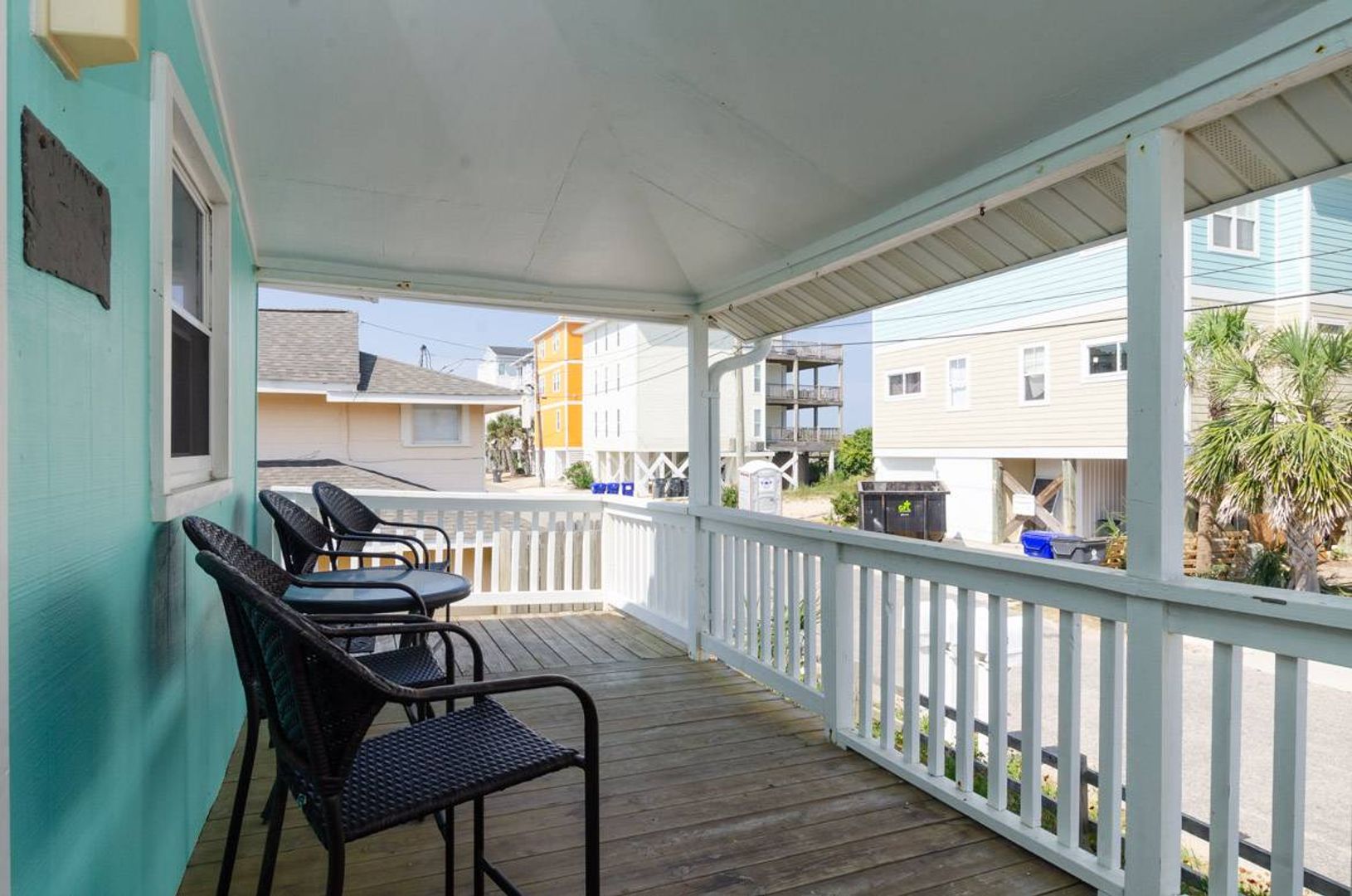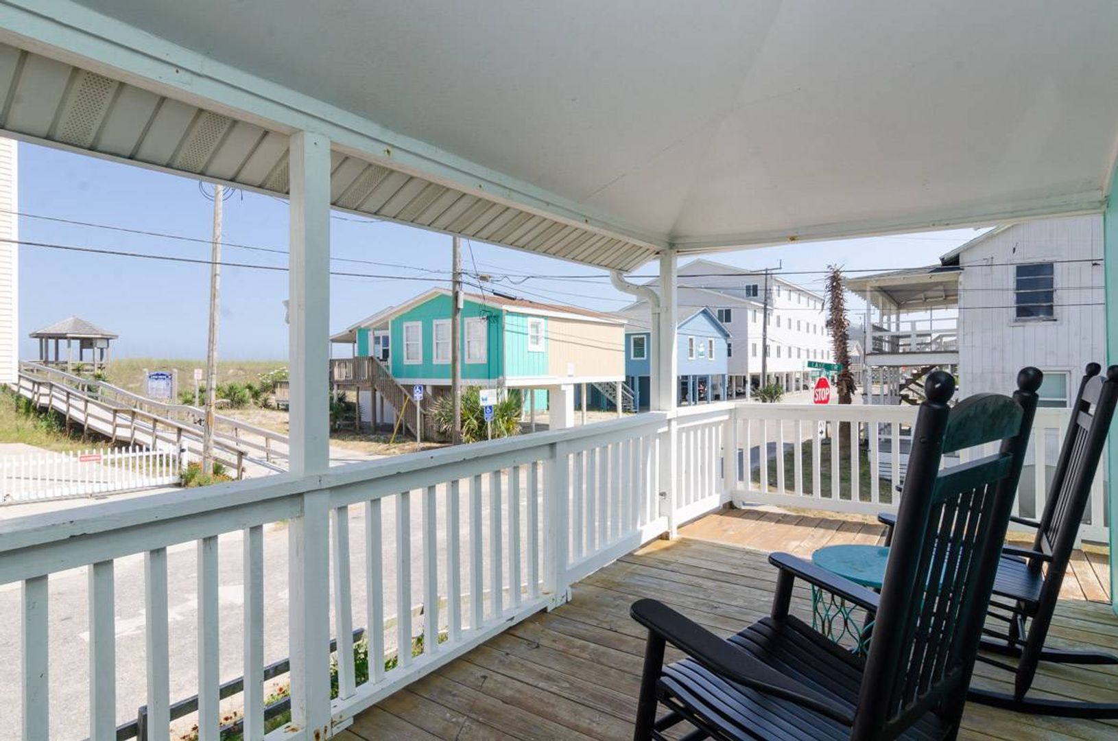 Recently updated, "Atlantis" is a cozy upper ocean view home and the public beach access is directly across the street. The upper-level unit of this home features of 3-bedrooms and 2-bathrooms. The renovated kitchen boasts stainless steel appliances, quartz counter tops, and a spacious island with bar seating. The kitchen table seats six people and adjoins to the open living room which offers plenty of space to enjoy. There is a Full-size sofa bed that allows the living room to double as an additional sleeping area. There is a covered, street-side porch complete with chairs, side tables, and rockers. The primary bedroom features a comfortable King-size bed and private bathroom. There are two additional guest bedrooms that are furnished with Queen beds. Each bedroom has a TV.