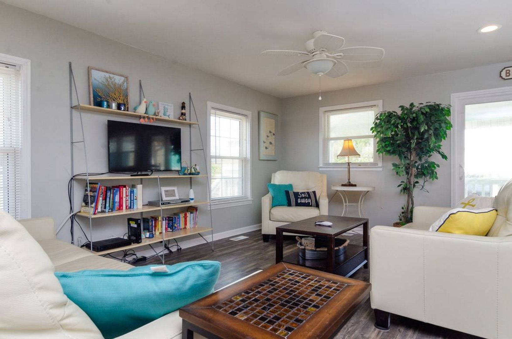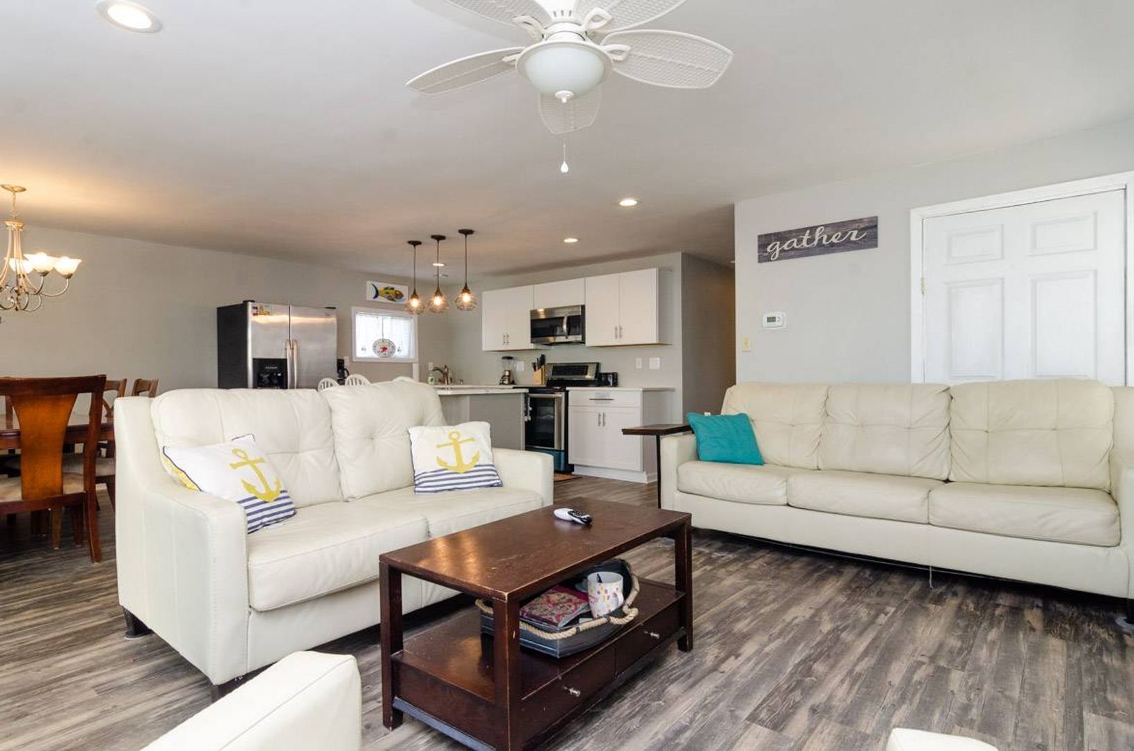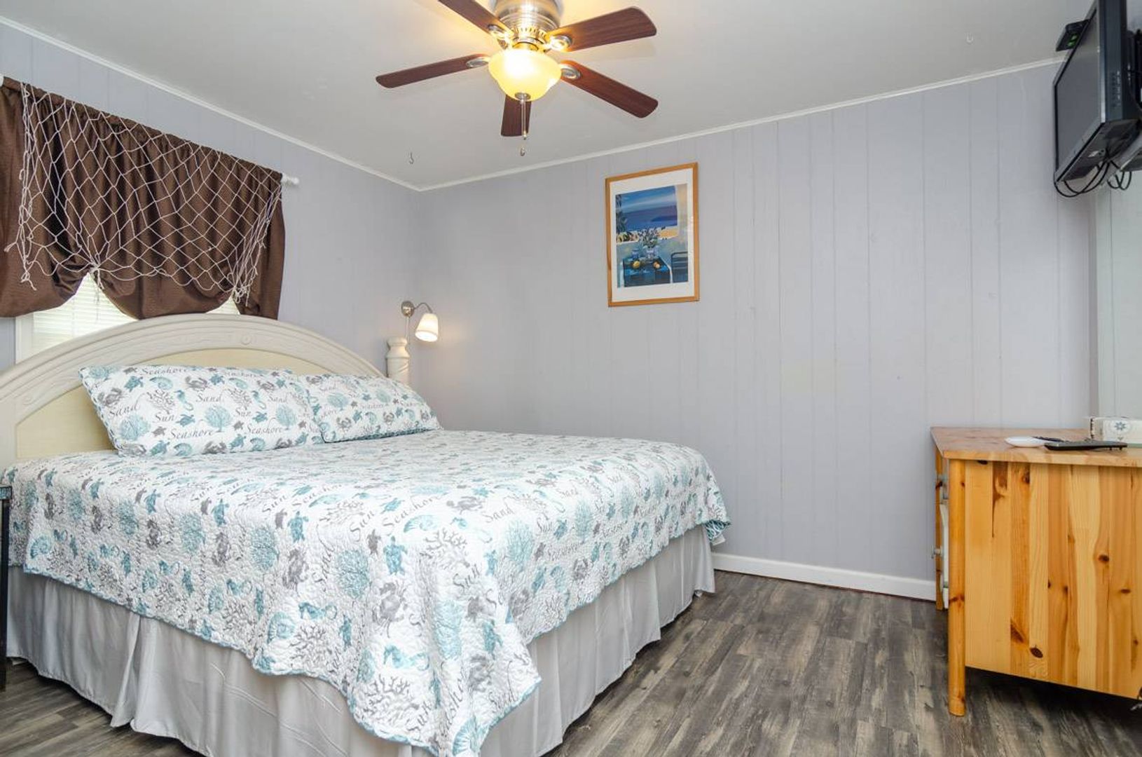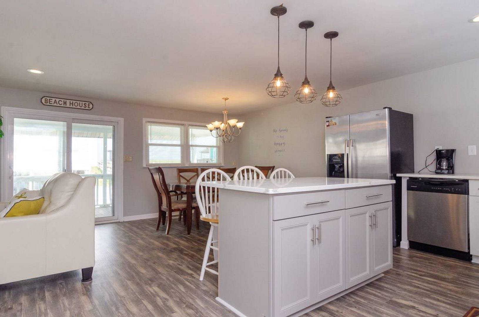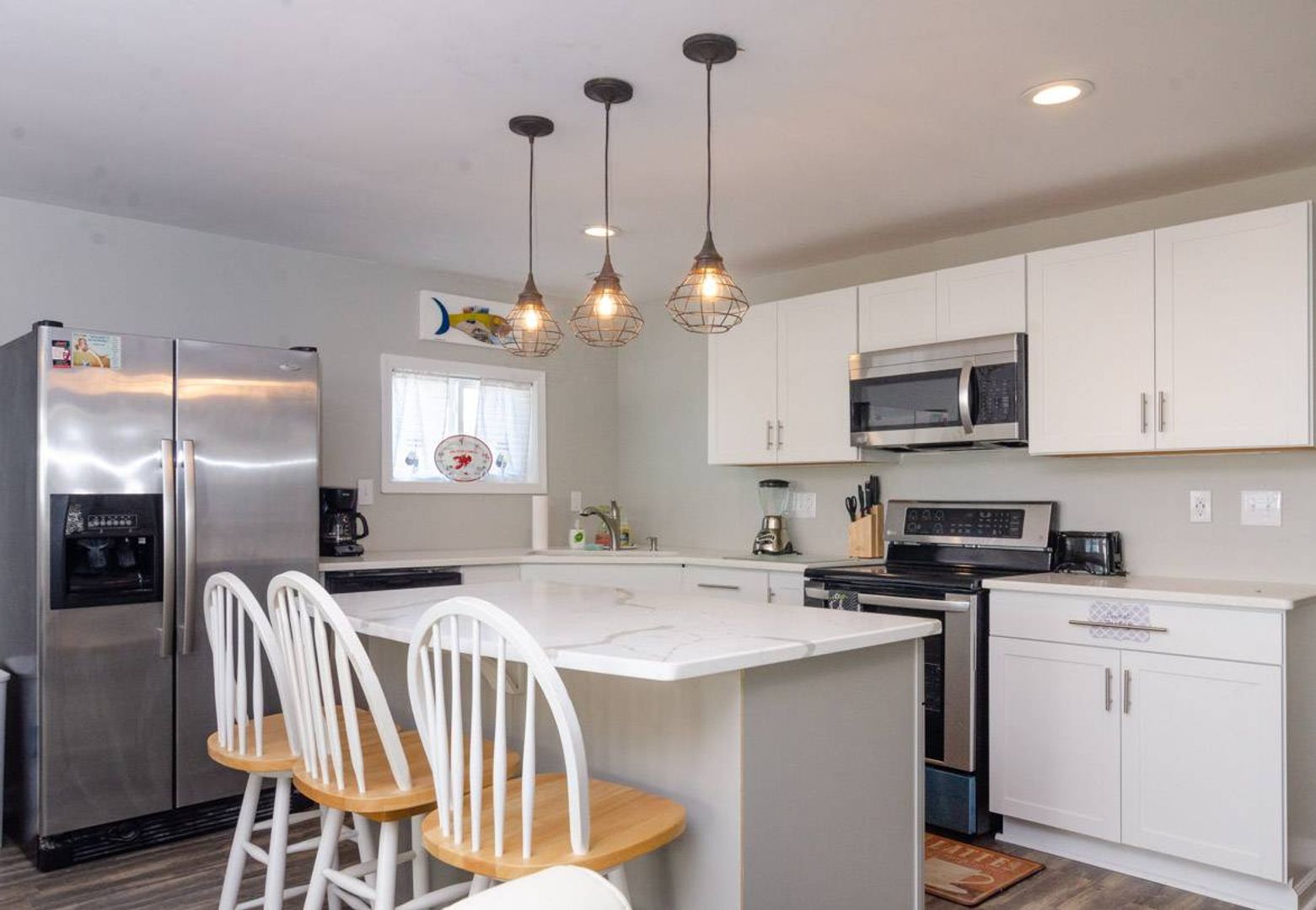 Recently updated, "Atlantis" is a cozy upper ocean view home and the public beach access is directly across the street. The upper-level unit of this home features of 3-bedrooms and 2-bathrooms. The renovated kitchen boasts stainless steel appliances, quartz counter tops, and a spacious island with bar seating. The kitchen table seats six people and adjoins to the open living room which offers plenty of space to enjoy. There is a Full-size sofa bed that allows the living room to double as an additional sleeping area. There is a covered, street-side porch complete with chairs, side tables, and rockers. The primary bedroom features a comfortable King-size bed and private bathroom. There are two additional guest bedrooms that are furnished with Queen beds. Each bedroom has a TV.
