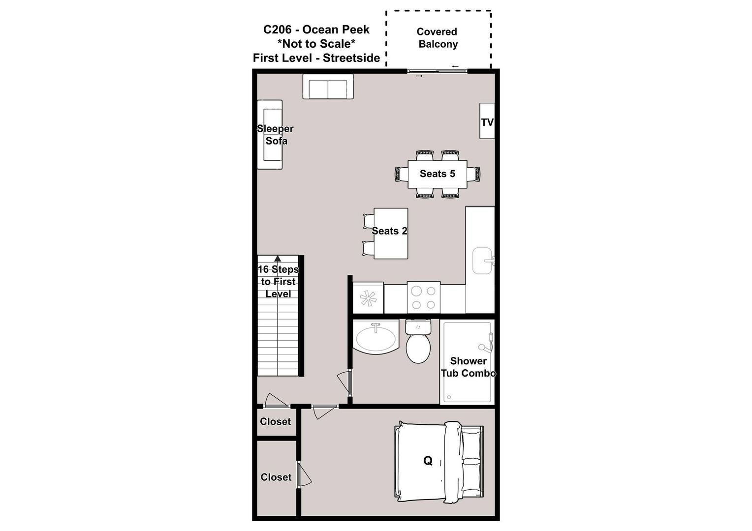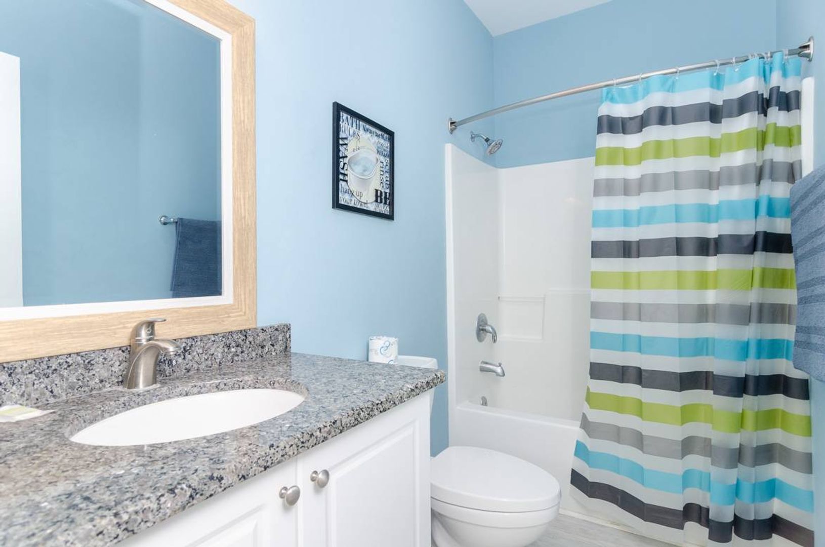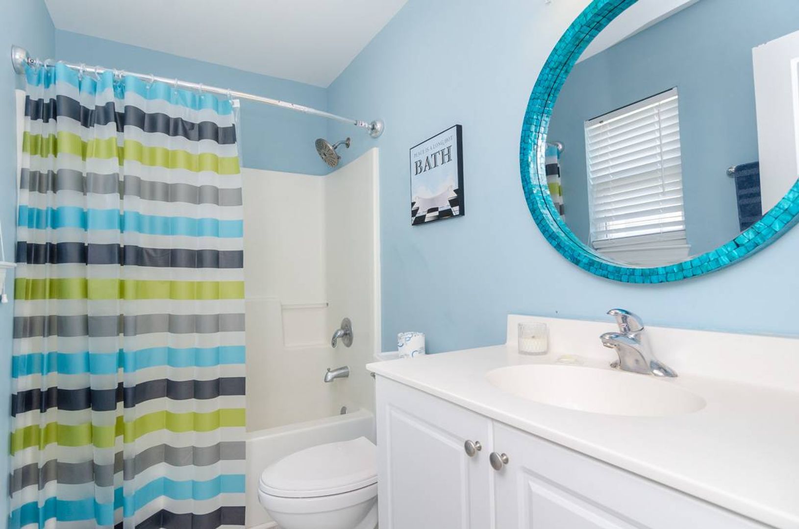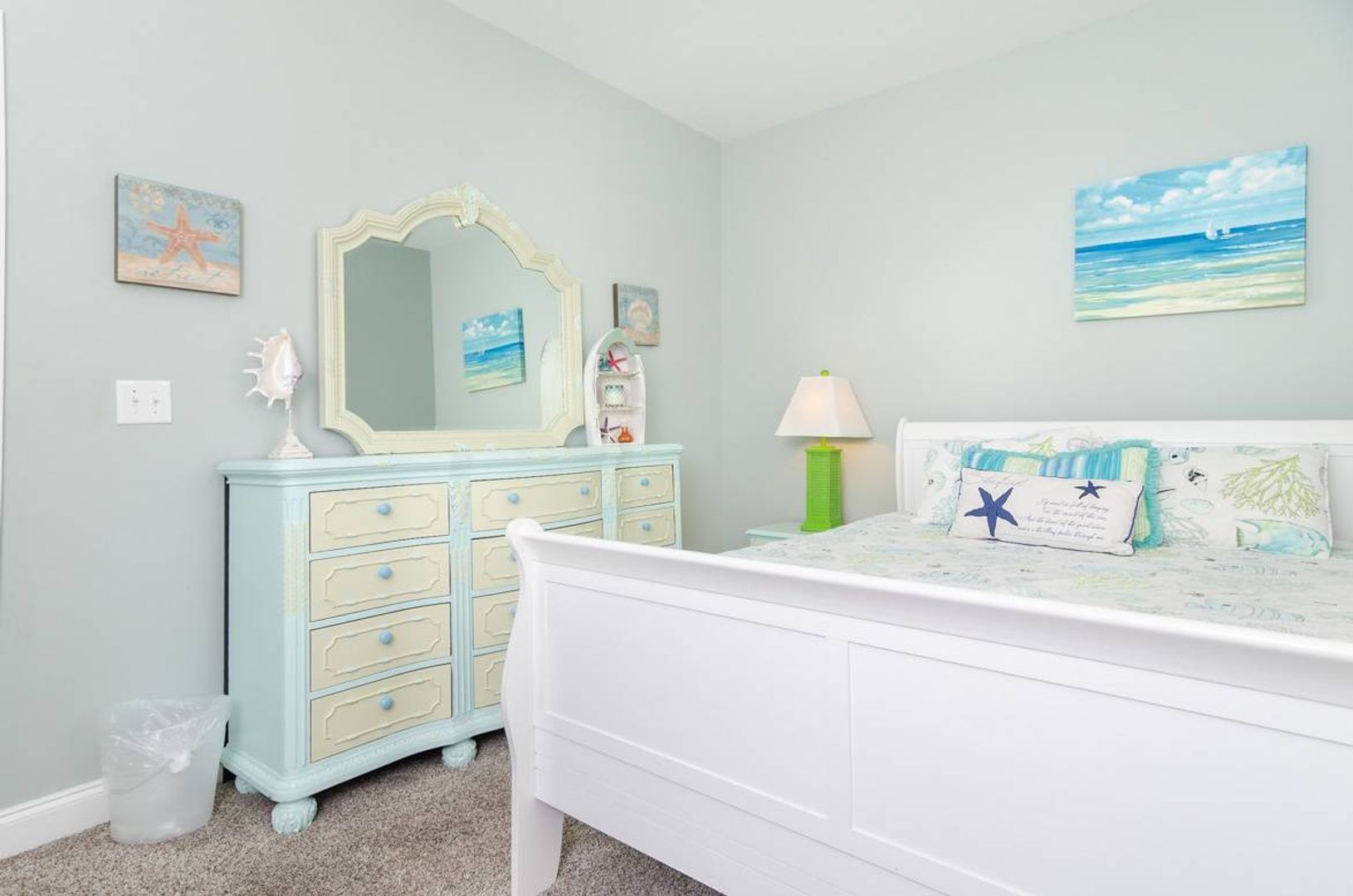 Upon entering the home, you are immediately whisked upstairs to the spacious main living area. The great room features lovely high ceilings and beachy hues that complement the open floor plan of this coastal retreat. Gather around the television for family movie night on the plush sofas or indulge in a wholesome board game. The dining area flows seamlessly into the kitchen which offers an eat in island for additional seating and plenty of space for meal prep. There is full bathroom on this living level that serves visitors and the nearby guest bedroom. The nearby guest bedroom is furnished with cheerful tones and tasteful beach décor, a queen-sized bed, and generous flat screen tv.