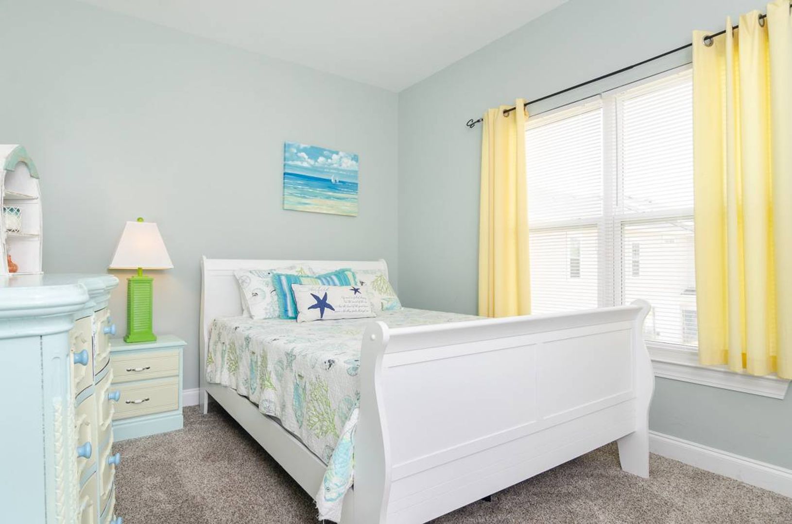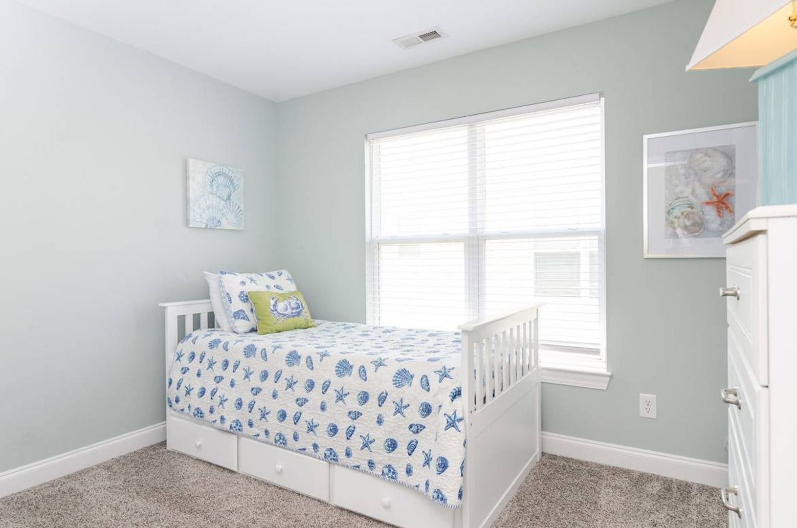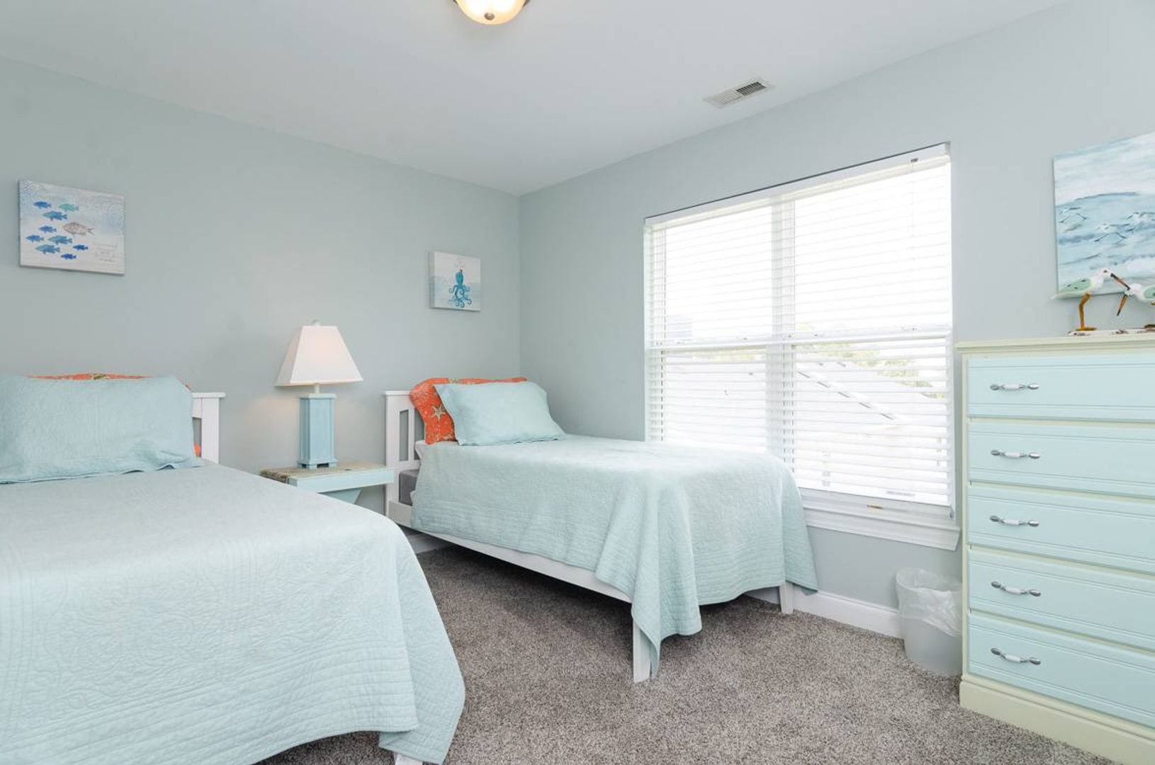 Upstairs, the second living level of “Ocean Peek” has three additional bedrooms. The primary suite offers a cozy queen-sized bed, sizable closet, on suite bathroom, and access to a private covered deck. Retreat at the end of the day to unwind in your private oasis or wake up slowly on your private deck with the sunrise, sea birds, and soft breezes. The next bedroom on this level is a twin bedroom that offers a twin trundle to help accommodate groups and families of all configurations. The versatility of this room helps it cater to occupants of all ages and there is a television for added comfort. A full bathroom separates the two guest rooms, and the fourth guest room is outfitted with two twin beds and a television.