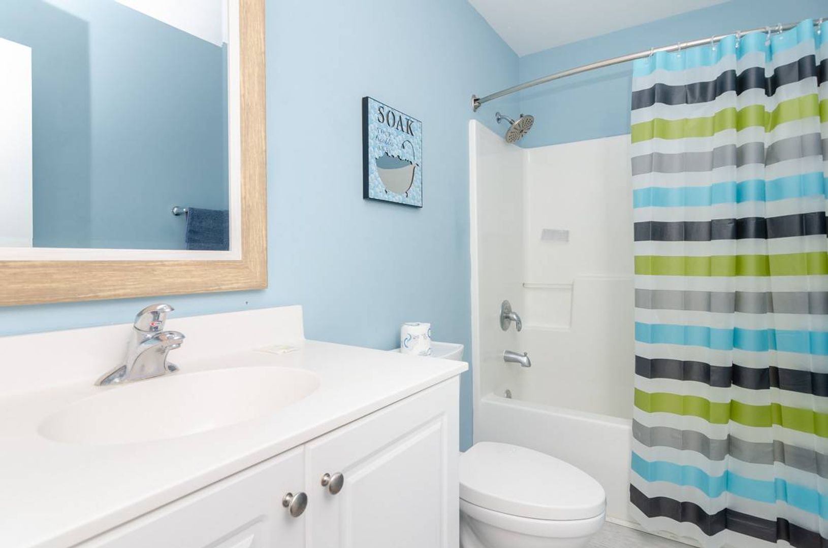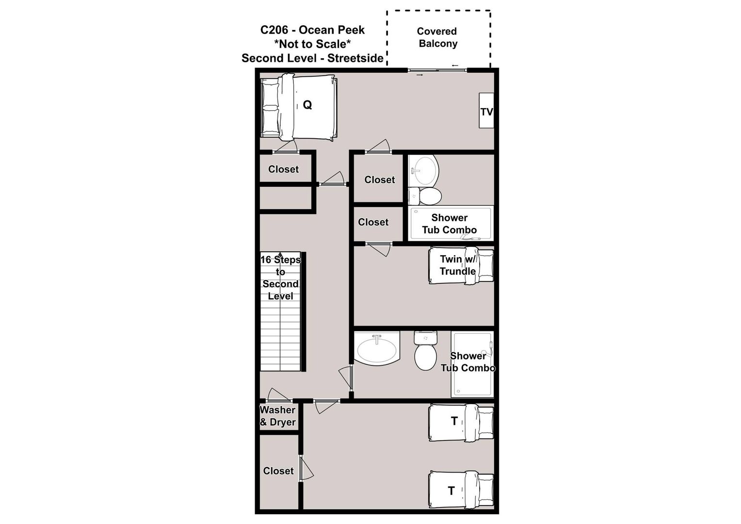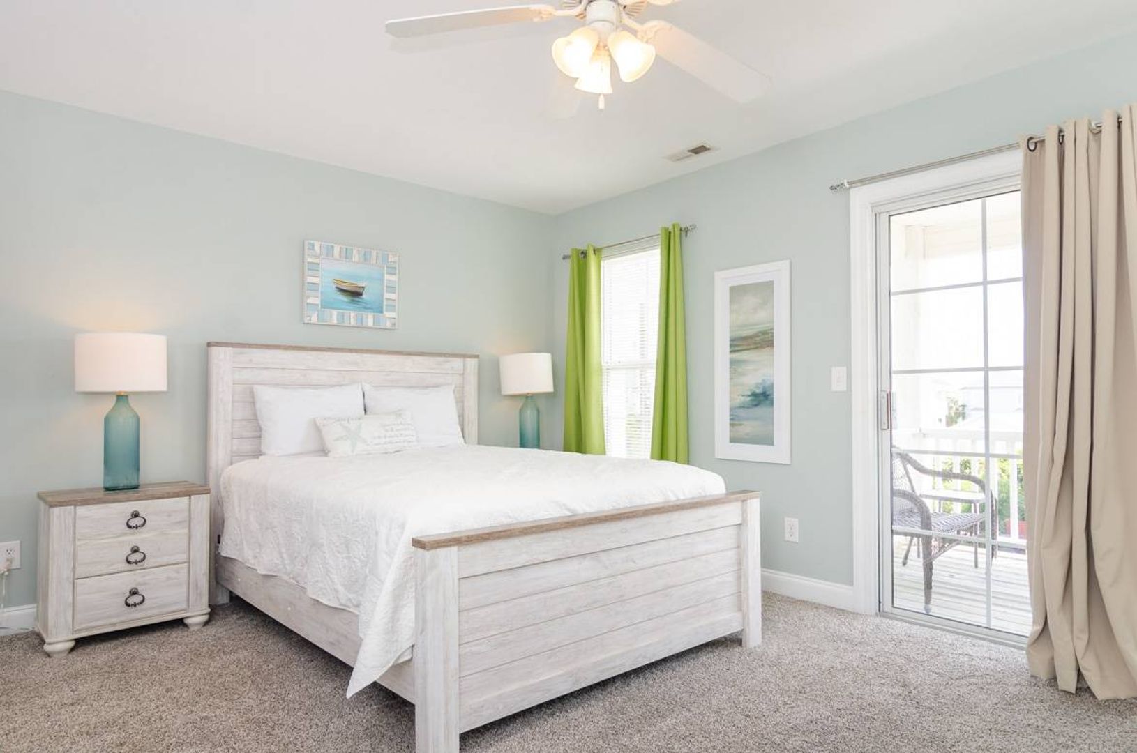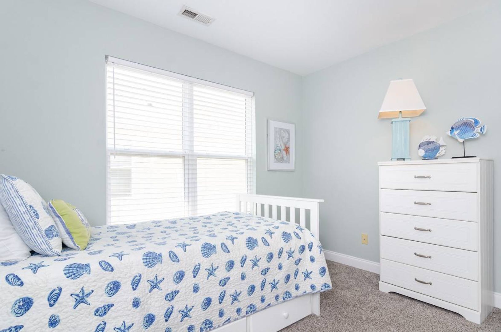 Upstairs, the second living level of “Ocean Peek” has three additional bedrooms. The primary suite offers a cozy queen-sized bed, sizable closet, on suite bathroom, and access to a private covered deck. Retreat at the end of the day to unwind in your private oasis or wake up slowly on your private deck with the sunrise, sea birds, and soft breezes. The next bedroom on this level is a twin bedroom that offers a twin trundle to help accommodate groups and families of all configurations. The versatility of this room helps it cater to occupants of all ages and there is a television for added comfort. A full bathroom separates the two guest rooms, and the fourth guest room is outfitted with two twin beds and a television.