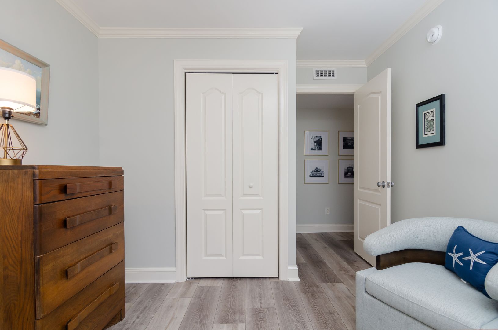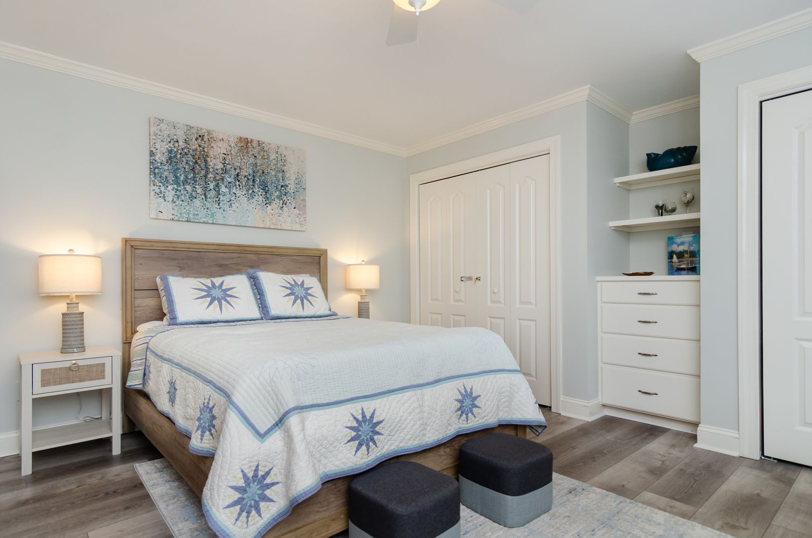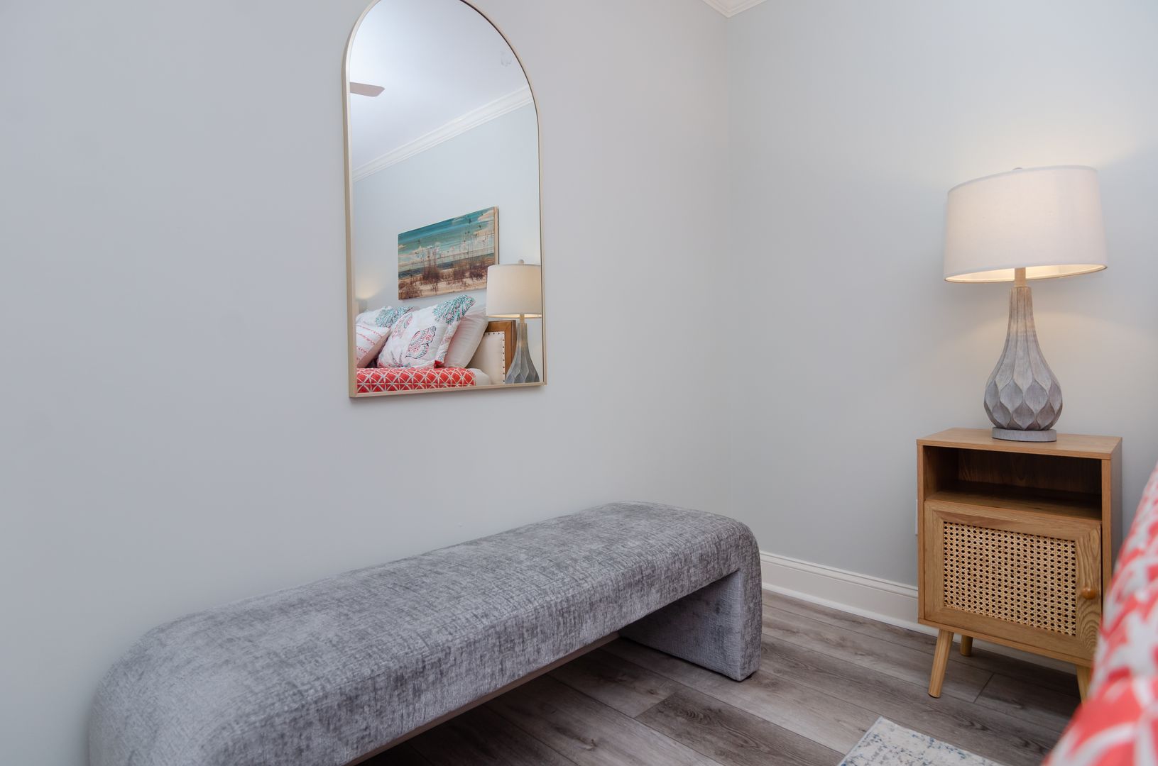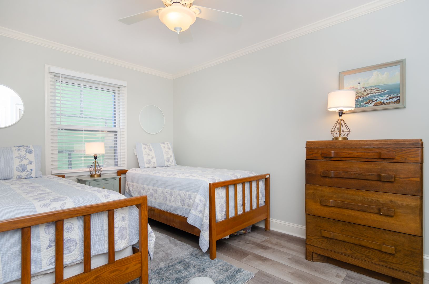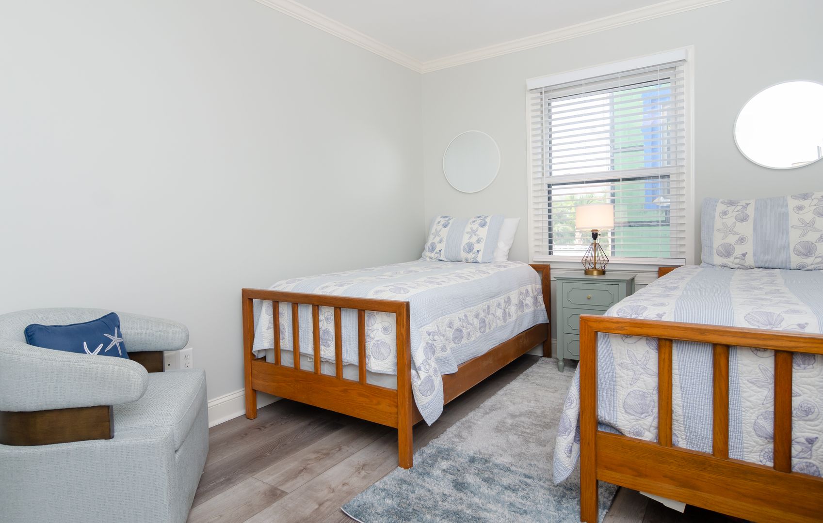 As you enter the apartment you are welcomed by gorgeous plank flooring and local artwork that gently nods to the history of this family home. The first guest bedroom will be immediately to your left as you walk through the hall and feature a plush queen-sized bed. A secondary hallway to the right leads you to a laundry closet and then to the primary bedroom. The spacious primary bedroom has two closets and is furnished with a queen-sized bed. The private primary bathroom includes a walk-in shower and sizable vanity. Further down the main hallway, the third guest bedroom will be on the left and provides two twin beds. A full bathroom in the hallway lends itself to the two guest bedrooms as well as visitors.