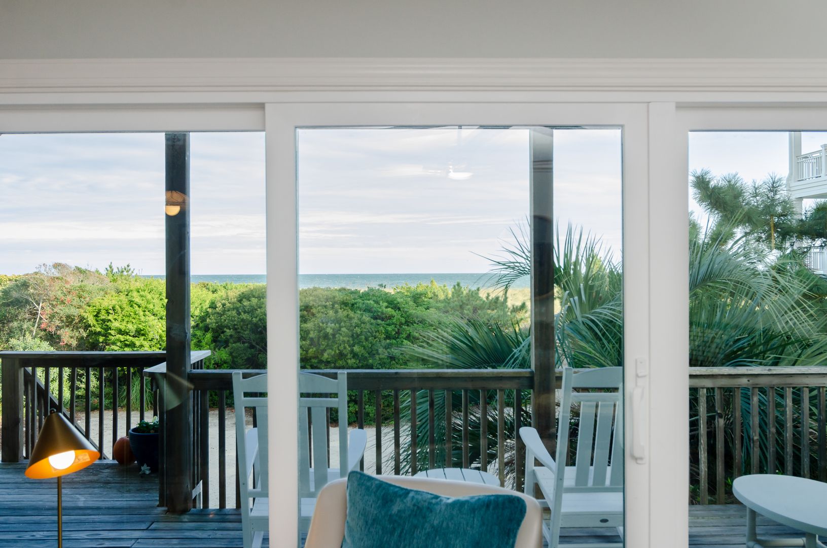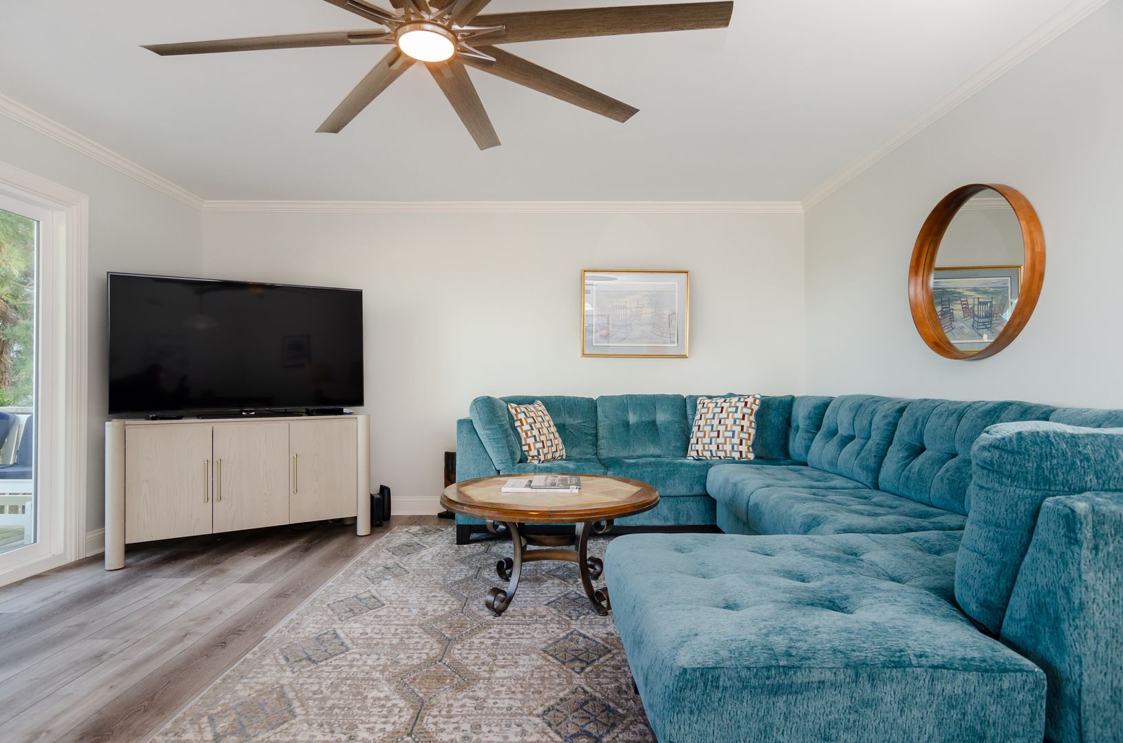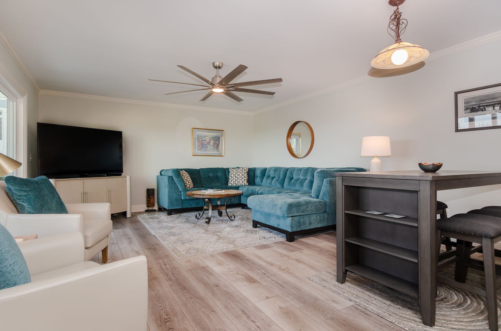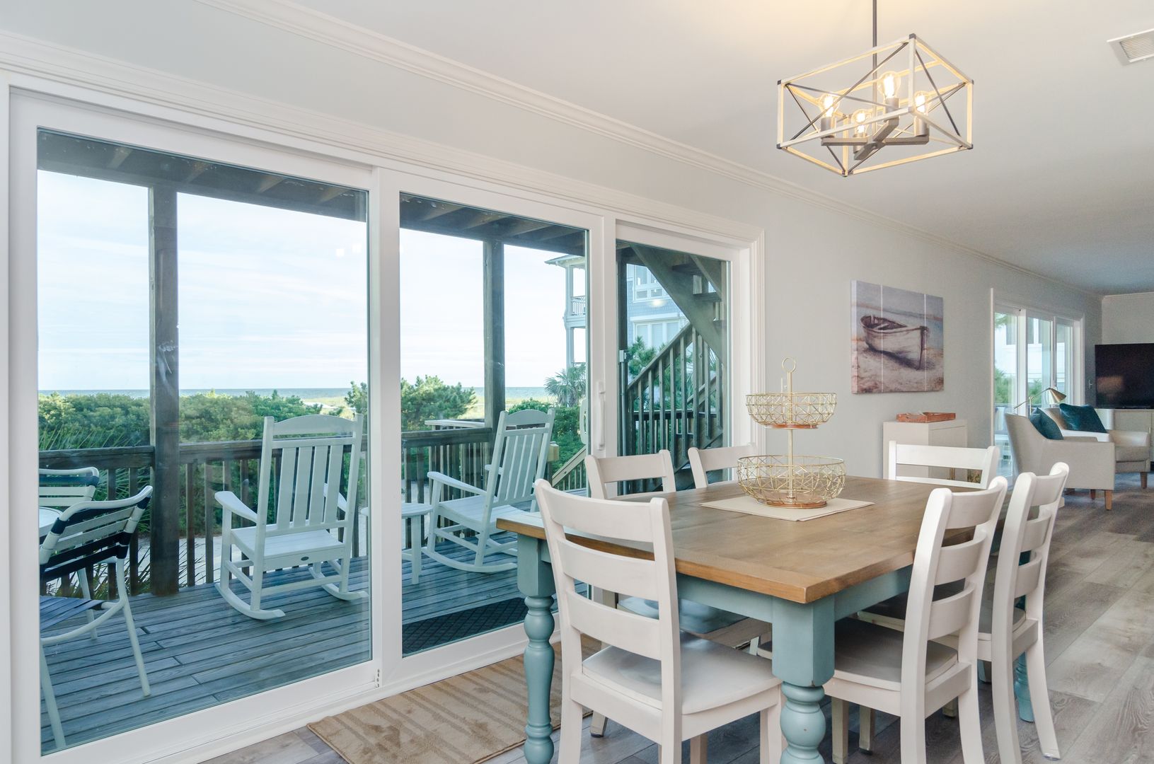 At the end of the hall, you are welcomed to the main living space that features two large sliding glass doors that flood the room with natural light and showcase the fabulous views. This great room includes a kitchen, two dining tables, a coffee bar, and spacious living area. With ample storage space, the well-equipped offers all the space you could need for preparing home cooked meals. Snuggle up on the sectional sofa after dinner and catch up on your favorite shows on the smart TV, a family board game, and step out onto the covered deck and rock for hours in the soft sea breezes as the waves crash on the beach.