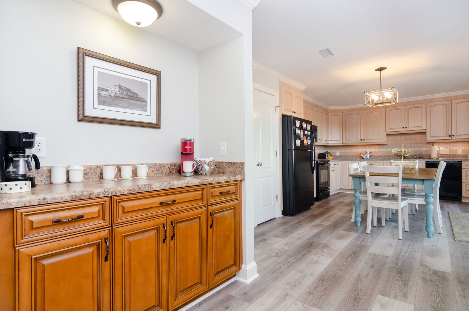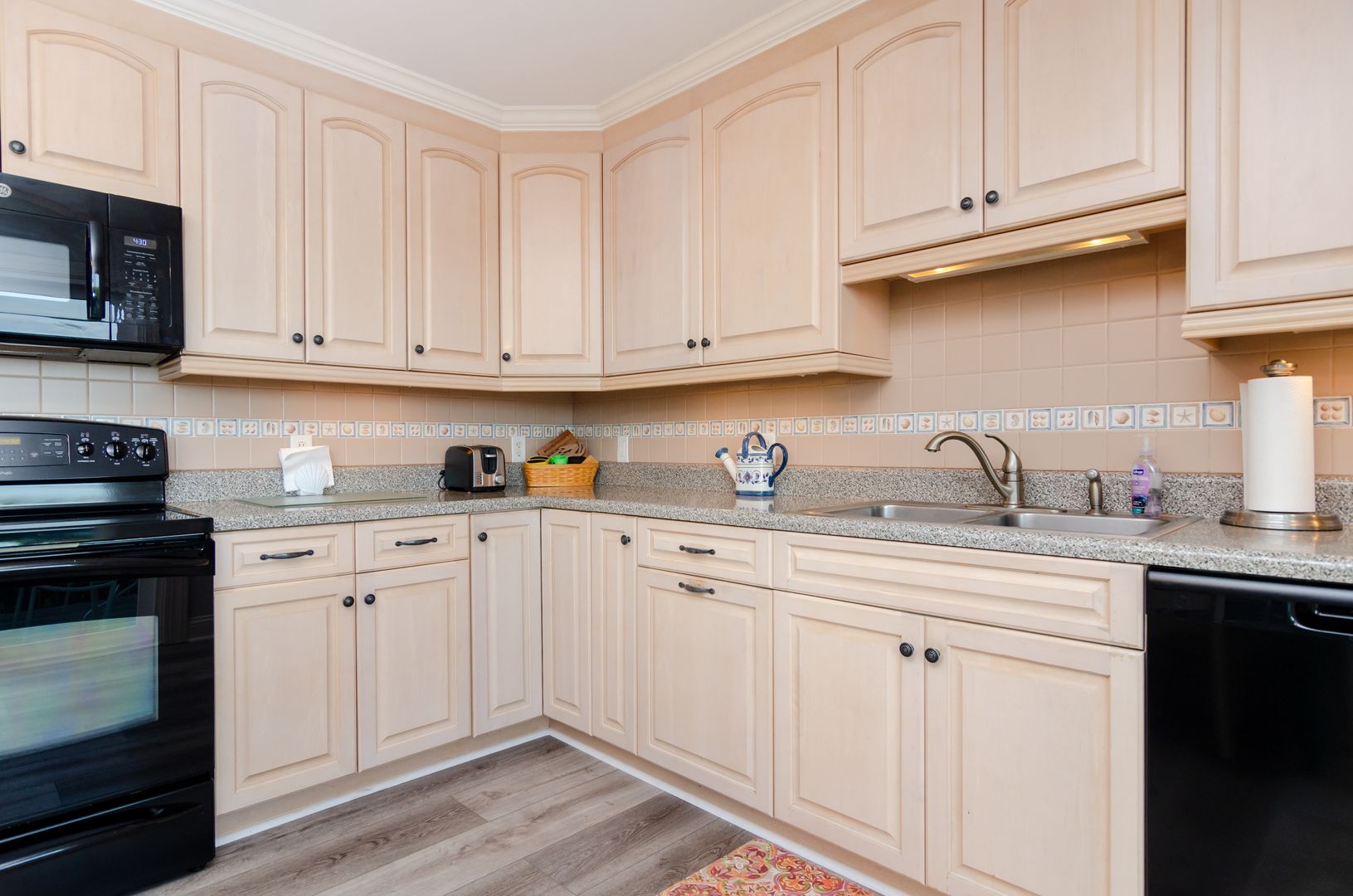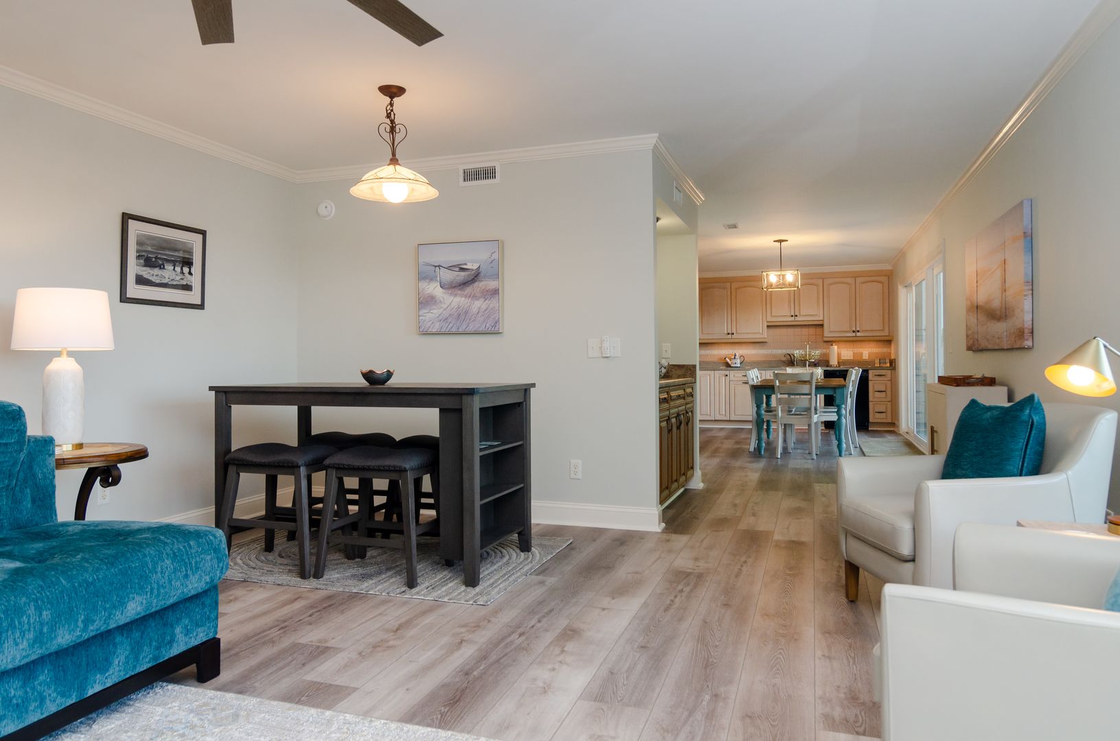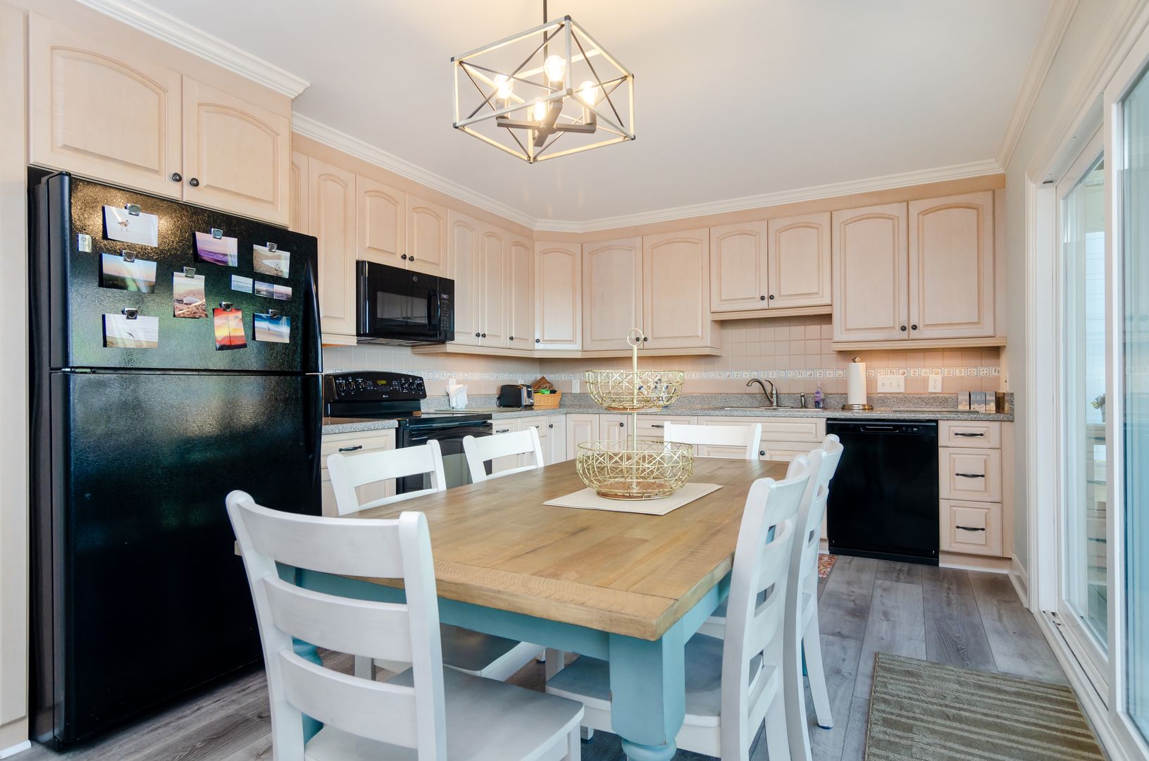 At the end of the hall, you are welcomed to the main living space that features two large sliding glass doors that flood the room with natural light and showcase the fabulous views. This great room includes a kitchen, two dining tables, a coffee bar, and spacious living area. With ample storage space, the well-equipped offers all the space you could need for preparing home cooked meals. Snuggle up on the sectional sofa after dinner and catch up on your favorite shows on the smart TV, a family board game, and step out onto the covered deck and rock for hours in the soft sea breezes as the waves crash on the beach.