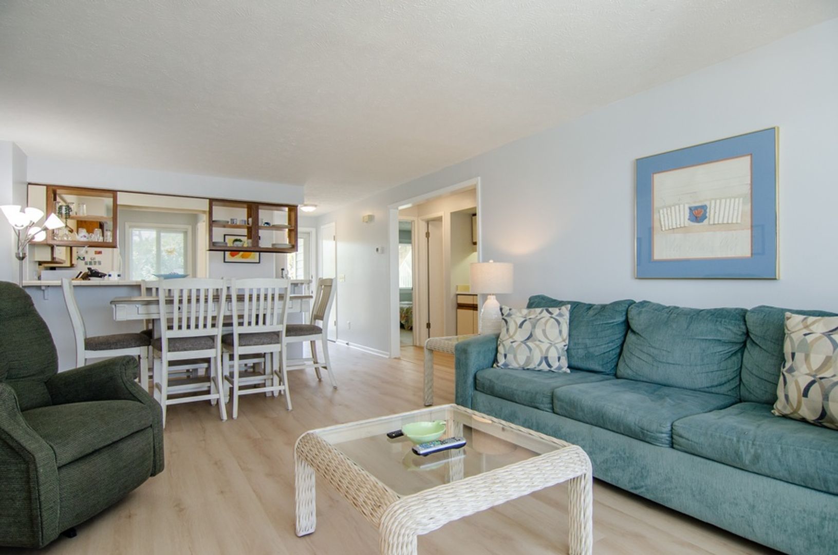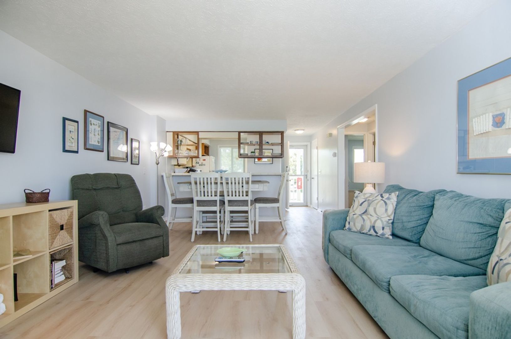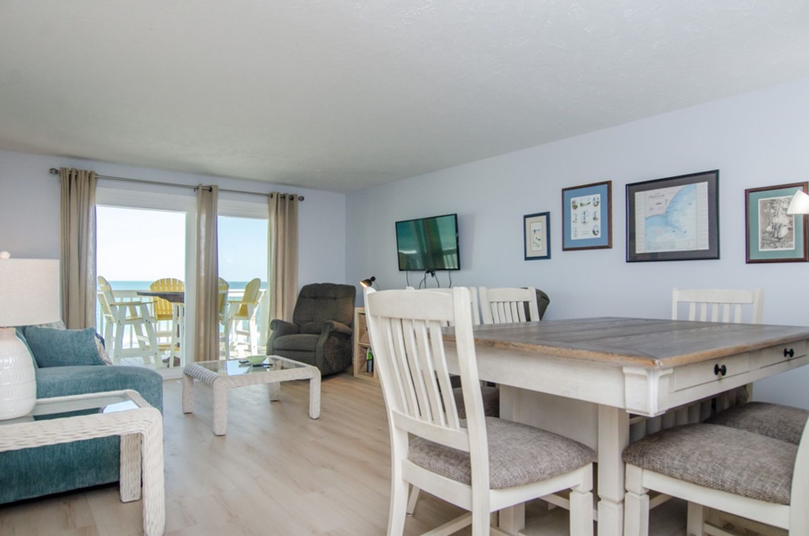 This 2 bedroom 1st floor oceanfront condo is in the Ocean Dunes complex in Kure Beach. The open design of the living room, dining area, and well equipped kitchen has breath taking views of the Atlantic. Relax in the living room with the comfortable layout and furniture (the sofas is a pullout bed) and flat screen TV. The main bedroom features a Queen bed, mounted TV, private en suite bathroom, and access to the oceanfront deck. The 2nd bedroom has 2 Twin beds, utilizing the additional full bathroom in the hallway.