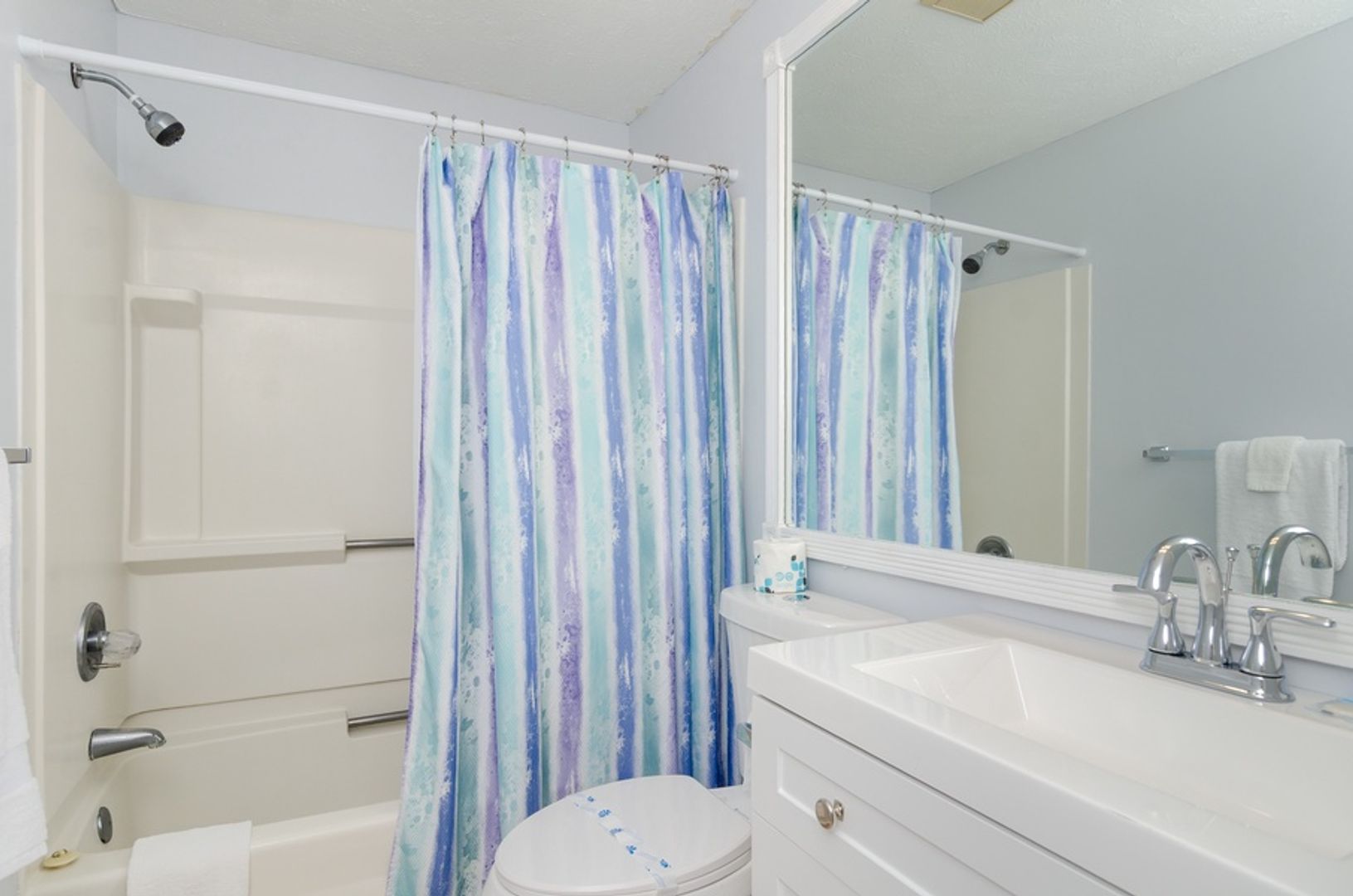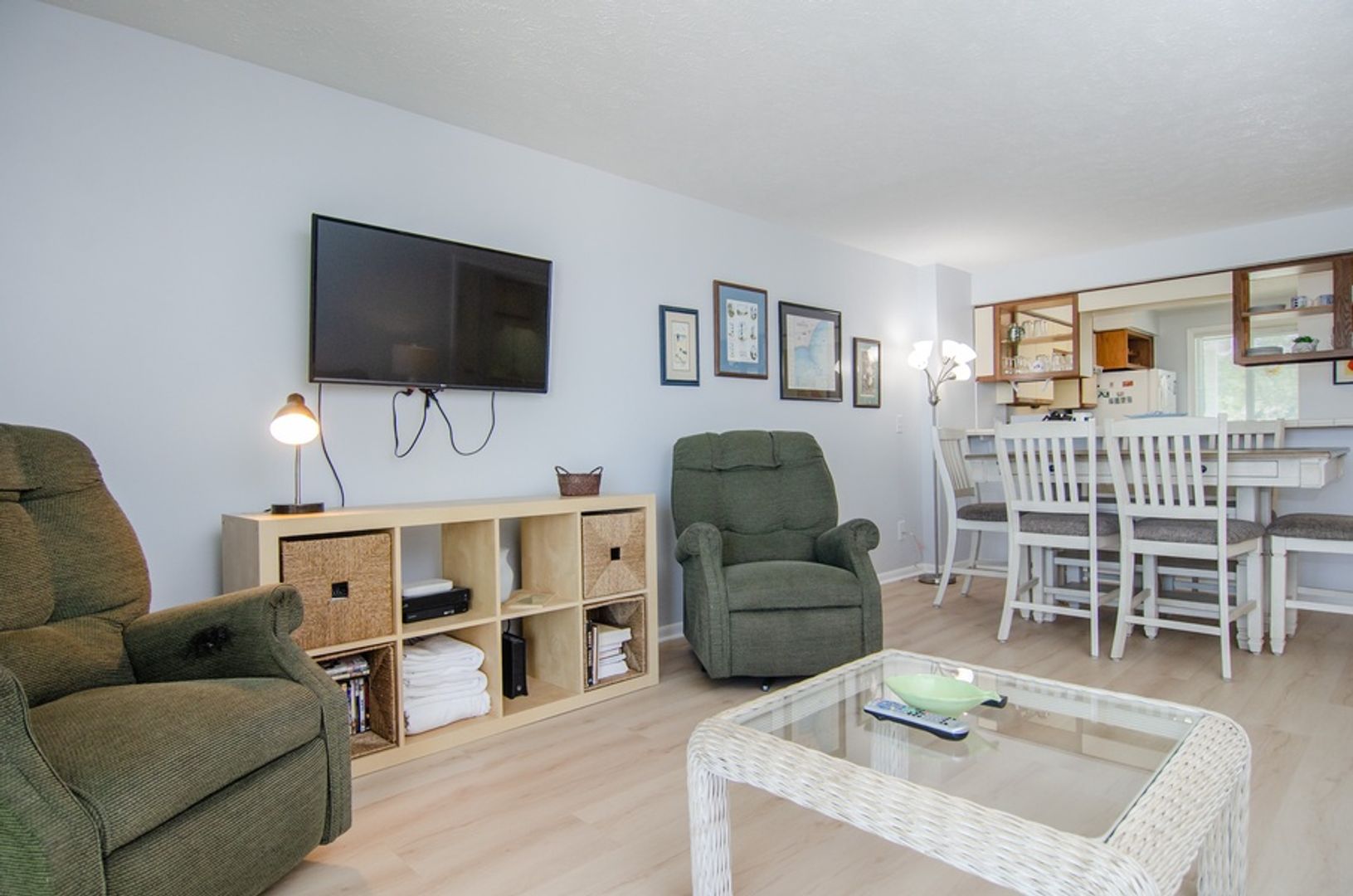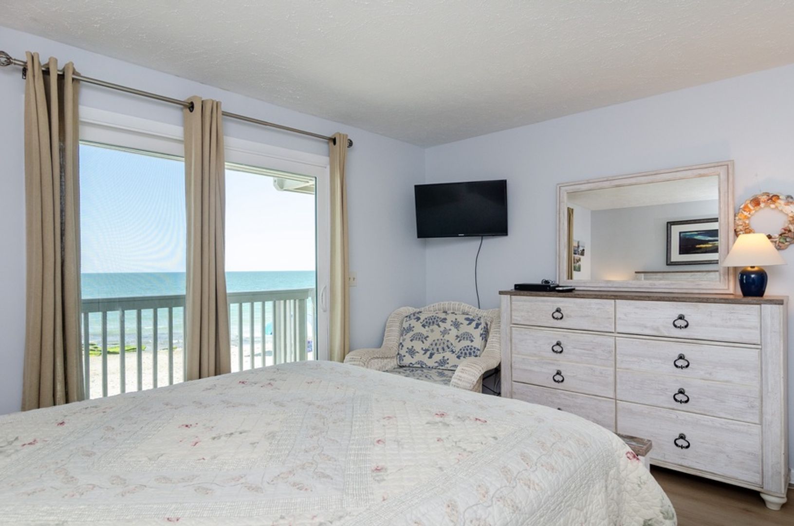 This 2 bedroom 1st floor oceanfront condo is in the Ocean Dunes complex in Kure Beach. The open design of the living room, dining area, and well equipped kitchen has breath taking views of the Atlantic. Relax in the living room with the comfortable layout and furniture (the sofas is a pullout bed) and flat screen TV. The main bedroom features a Queen bed, mounted TV, private en suite bathroom, and access to the oceanfront deck. The 2nd bedroom has 2 Twin beds, utilizing the additional full bathroom in the hallway.