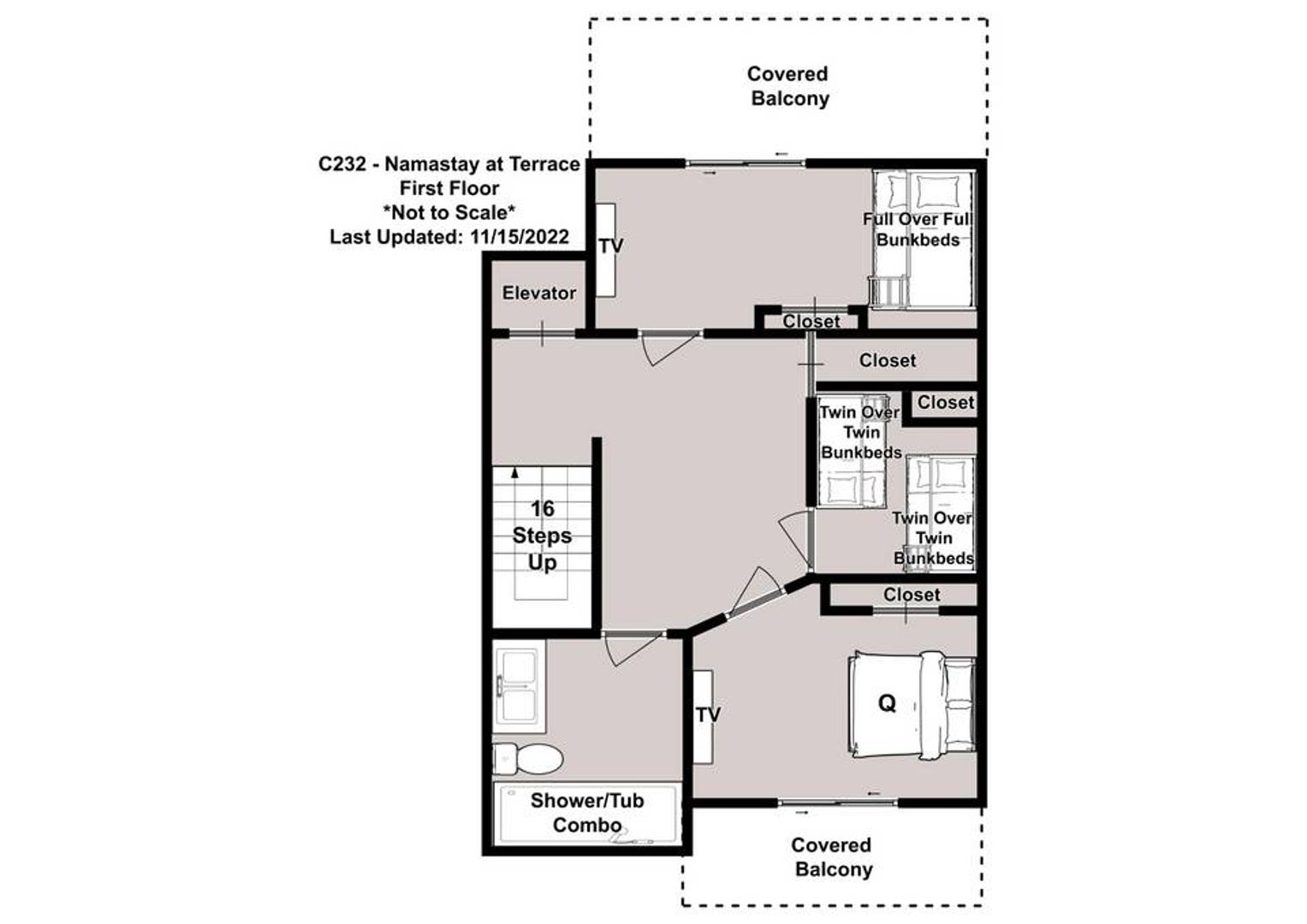 Bedding Configuration: 1 King, 2 Queen, 1 Full Bunk Bed (suitable for 2 guests only, upper bunk for child), 2 Twin Bunk Beds