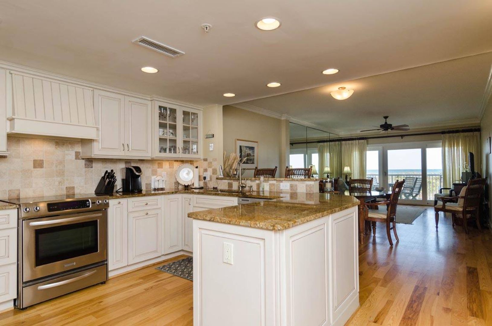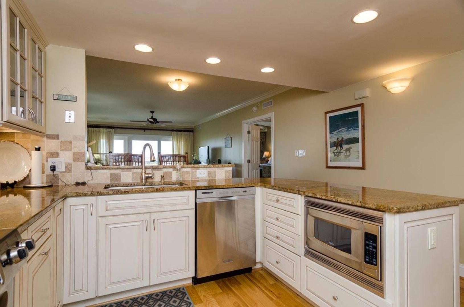 “Kroger” is an immaculate first floor condo in the Wrightsville Dunes complex and is a Sterling Edition building which includes an exterior security entrance. This condo features 3-bedrooms, 3-bathrooms, and spectacular ocean views. The beautifully remodeled kitchen boasts granite countertops, tile backsplash, stainless steel appliances, and a wine chiller. The ocean front covered balcony can be accessed from both the living area and primary bedroom. A spacious primary suite overlooks the ocean and provides access to the ocean front deck. The ensuite bathroom features dual sinks, a walk-in shower, a private water closet, and large garden tub. A queen bedroom overlooks the sound and has direct access to a full bathroom that has shared entry with the main hall. The twin guest room also has sound views and a private bathroom. The complex offers ground level storage for all your beach equipment and the beach is conveniently accessed by private walkways.