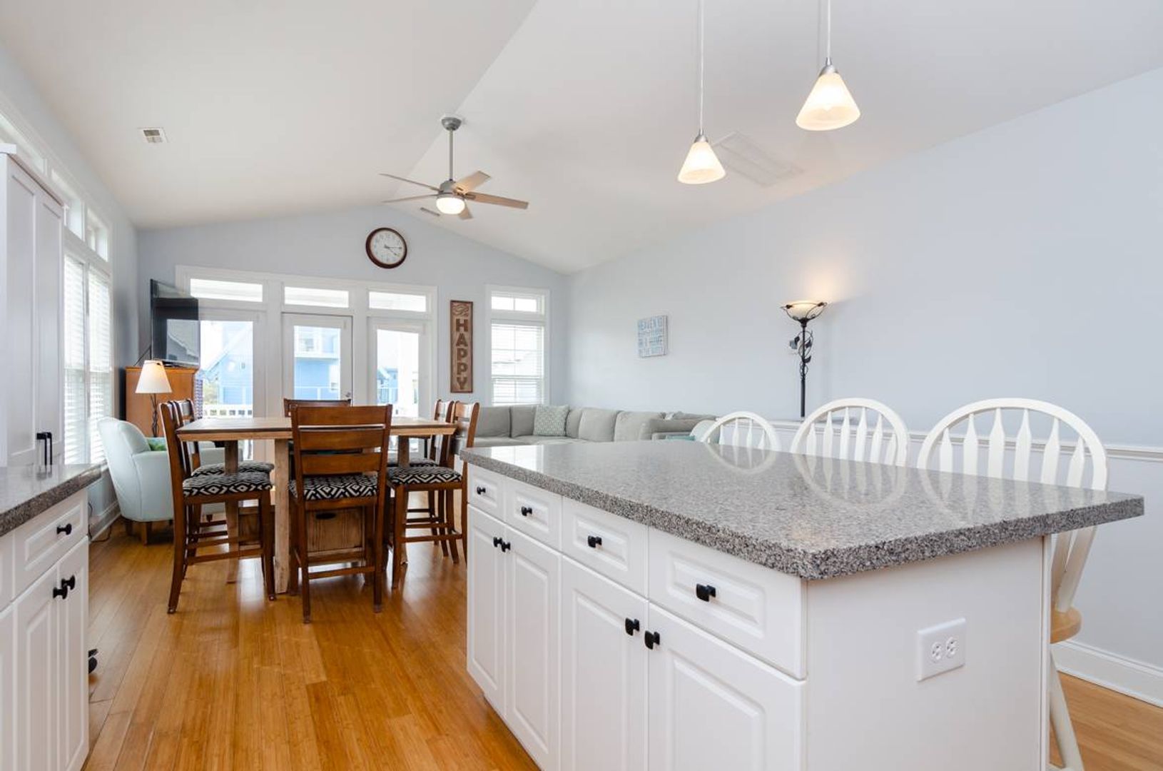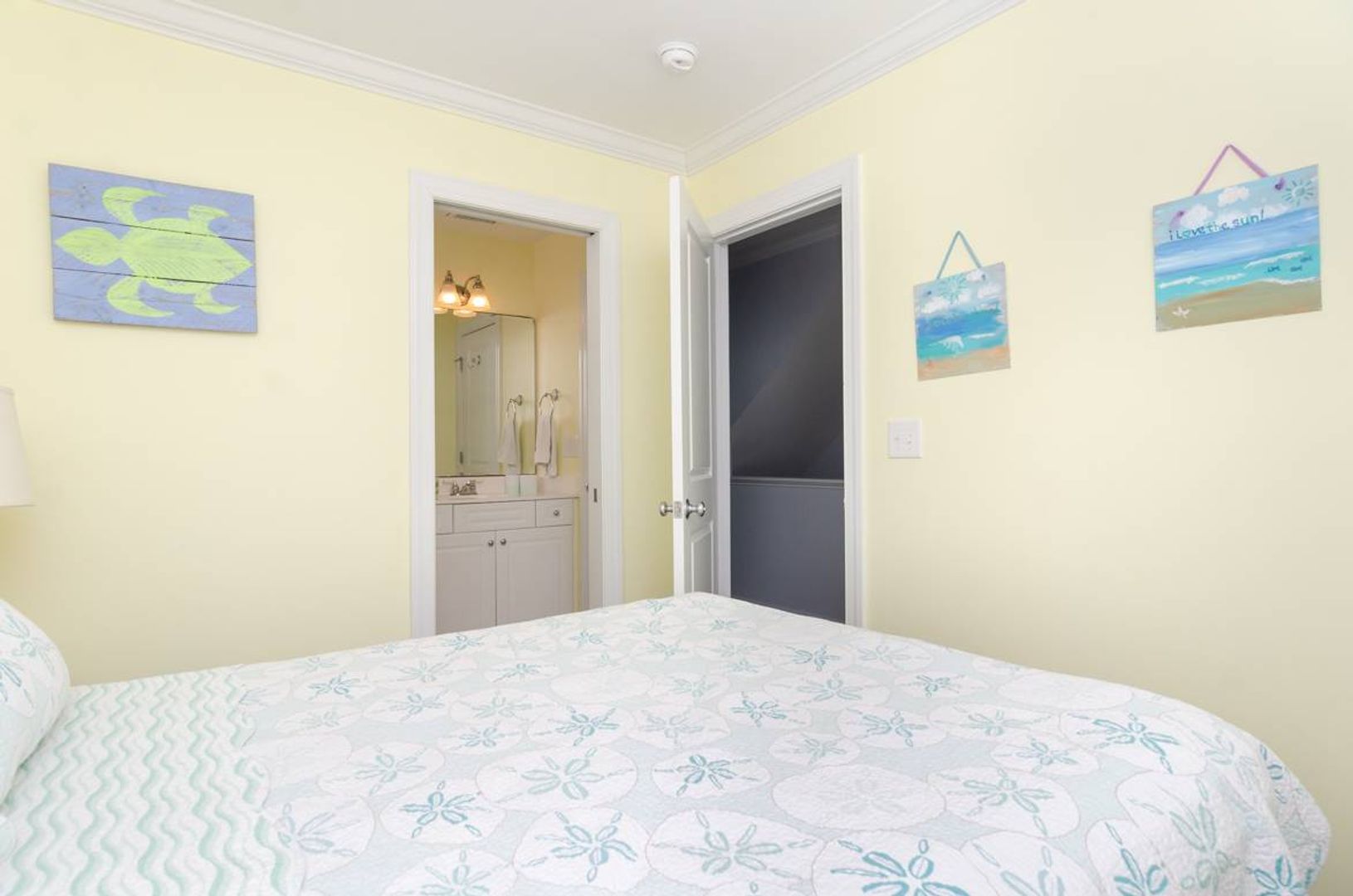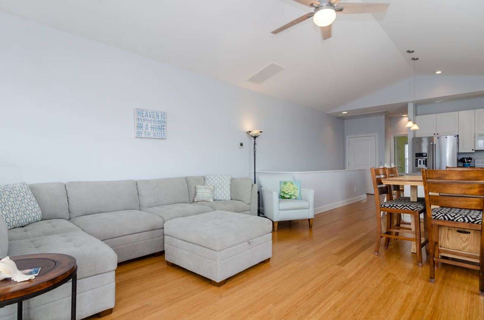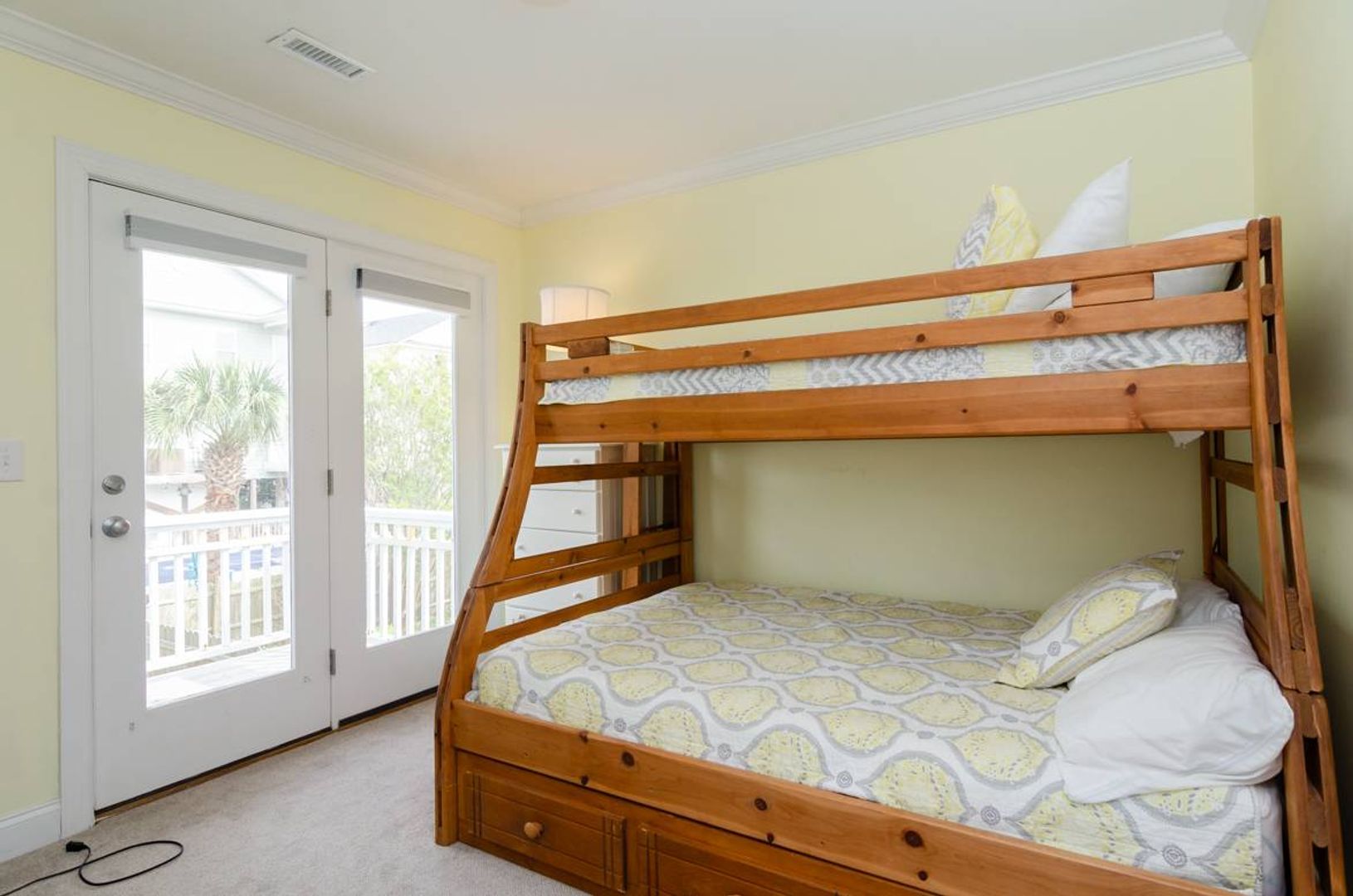 With 4-bedrooms, 3-bathrooms, and fabulous outdoor entertaining area that includes a wood burning fire pit make this townhome the perfect setting. This home is 1 block away from the beach access and has multiple covered decks and an outdoor entertaining space. As you enter the home through the foyer you are led to the first living level where the sleeping quarters are found. The back bedroom is furnished with a pyramid bunk bed that is a twin bed over a full bed. The second bedroom is a quaint guest bedroom that offers a cozy queen-sized bed and shares direct access to the hall bathroom. A junior primary suite with a plush king bed is located down the hall and is complete with a private on-site bathroom and deck. The upstairs has an open floor plan with a living area, kitchen, and full bathroom that is shared with the primary suite furnished with a king bed and private deck overlooking the back yard. Spend evenings grilling under the pergola, soaking in the salt air, and roasting marshmallows by the fireside. Tasteful string lighting sets the mood and provides ambient light in the evenings. There is a small outdoor refrigerator for added convenience. Ample outdoor seating and a built-in wood burning fire pit make this the best hangout spot in the house!