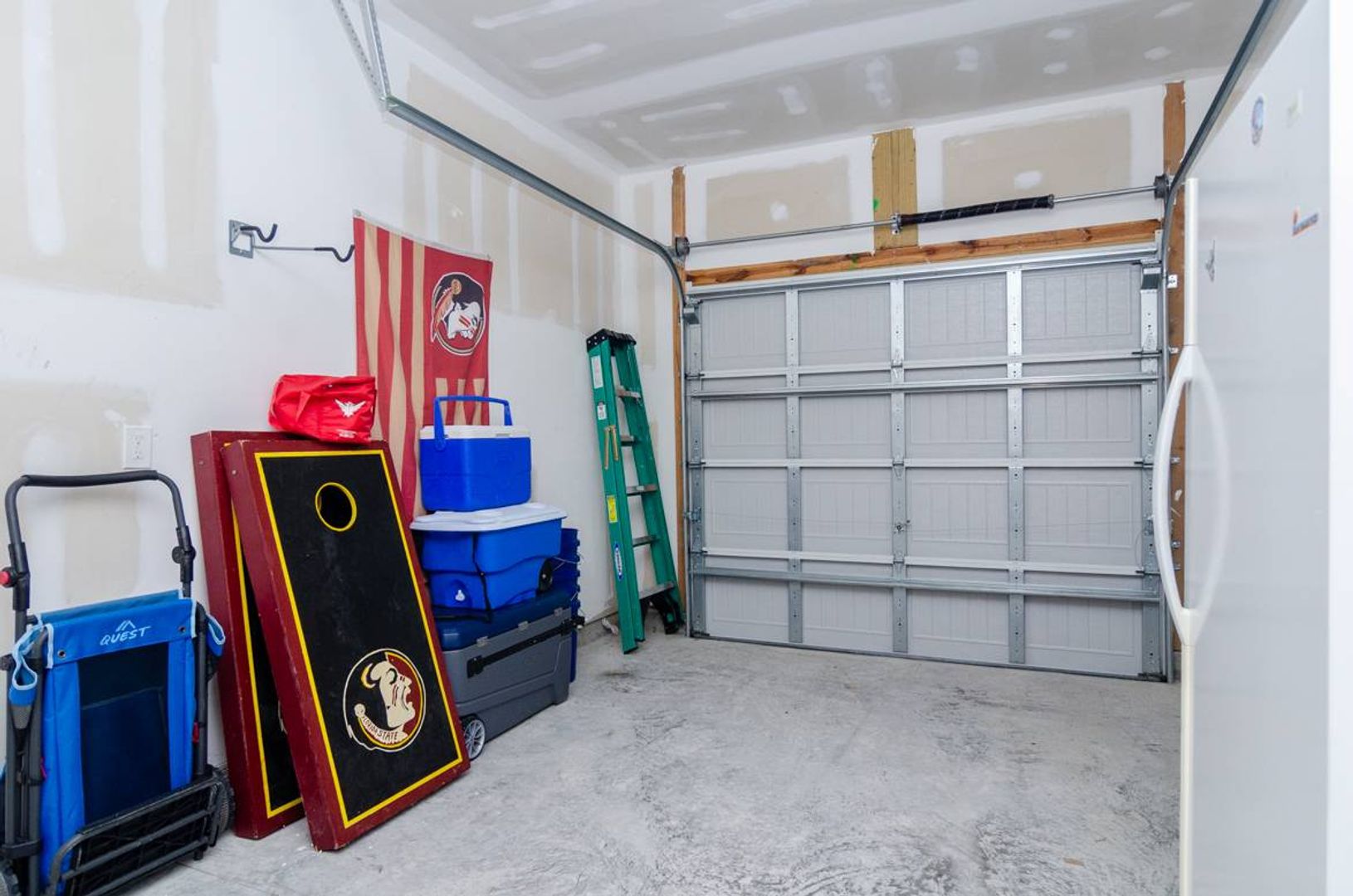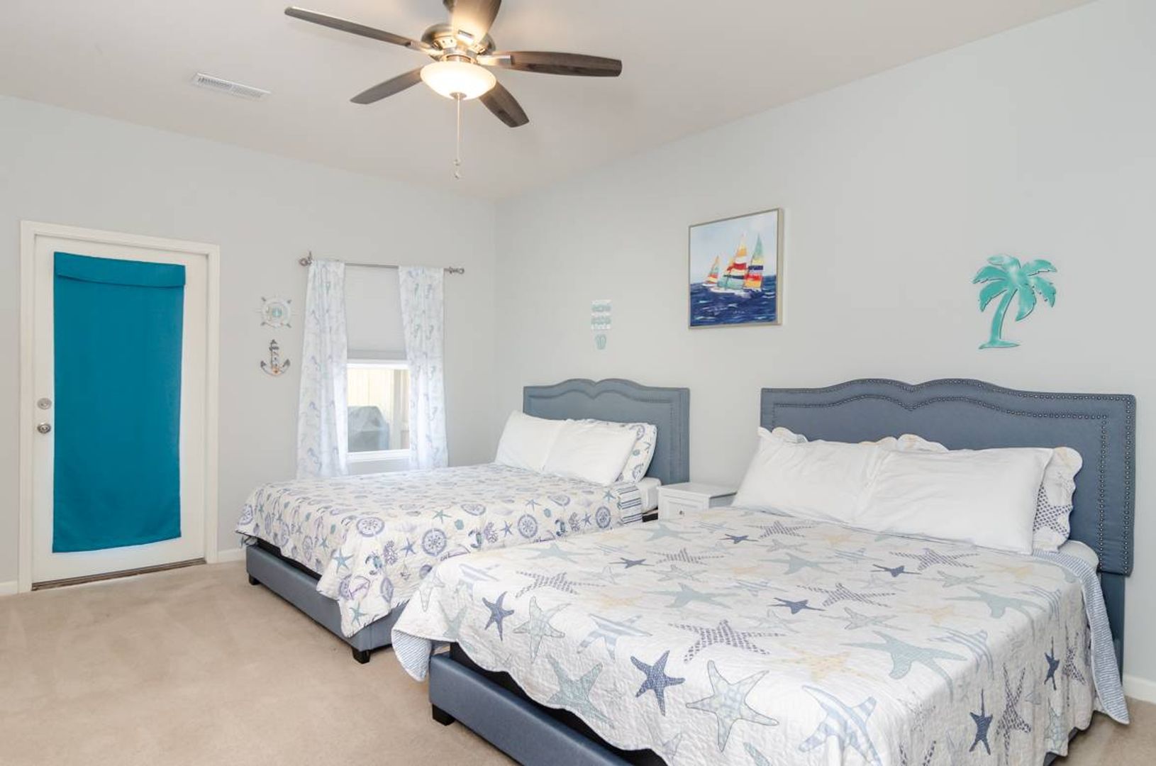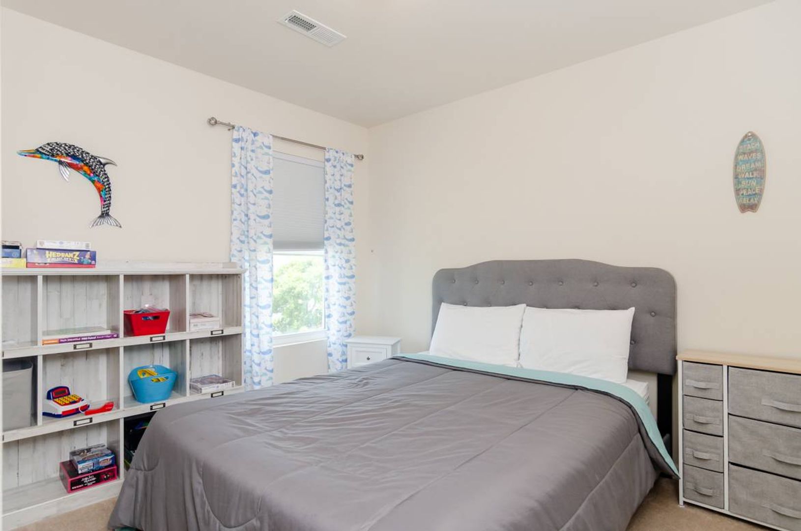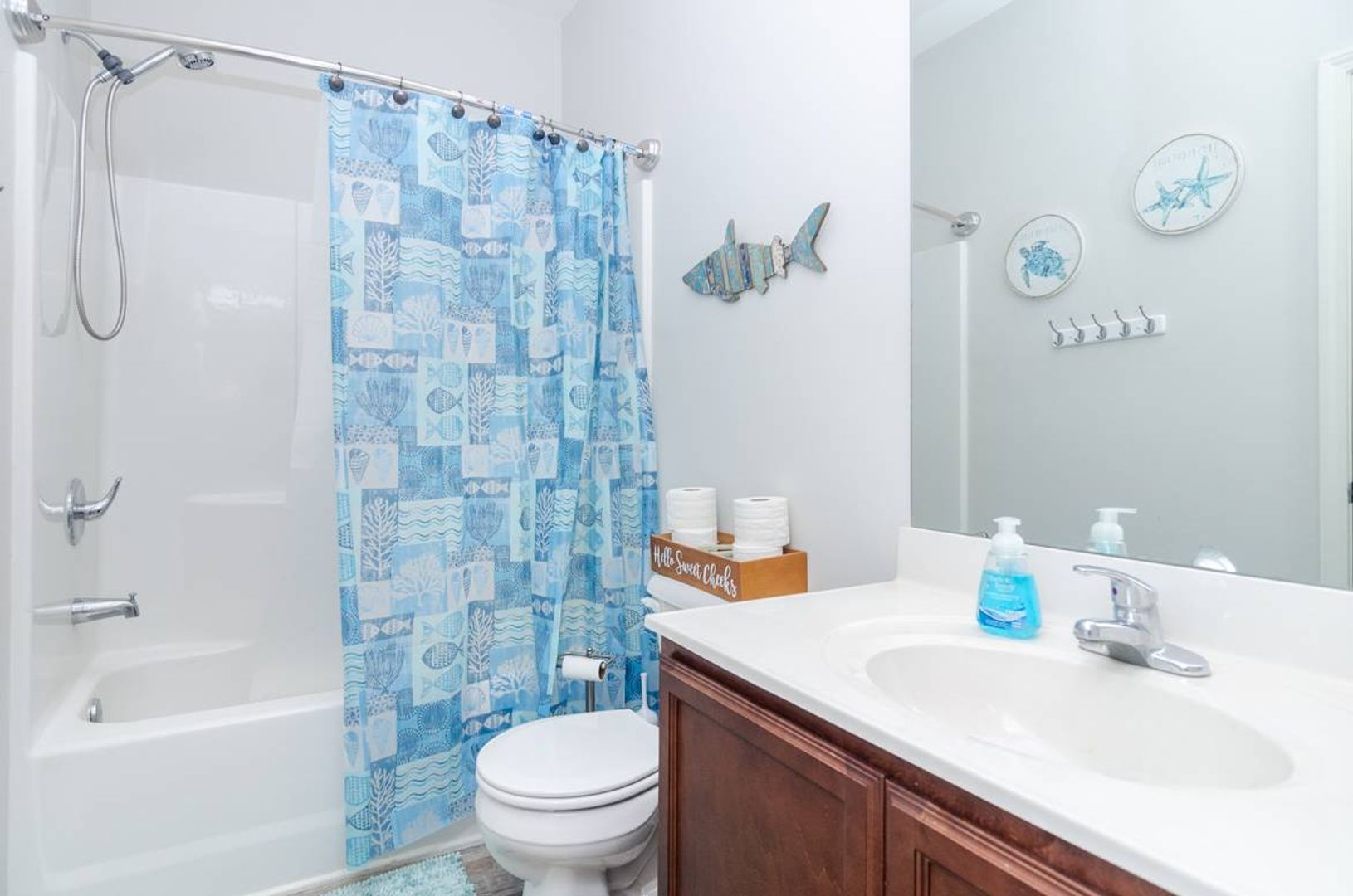 As you enter into the foyer of the property, garage access for storage is located on the right. There is one bedroom with a two queen beds and a full bathroom with a shower/ tub combo. This room also has access to an outside patio and fenced in yard. The second floor of the property is comprised of the kitchen, dining, and living areas with a half bathroom. The third level has the remaining two bedrooms. The first bedroom you arrive at has a Queen bed. There is a hall bathroom with a shower/ tub combo. The hallway to the primary bedroom houses the laundry closet. Once in the primary bedroom, you will find a King bed, TV, and en suite bathroom. The en suite has a double vanity, single shower, and soaking tub.