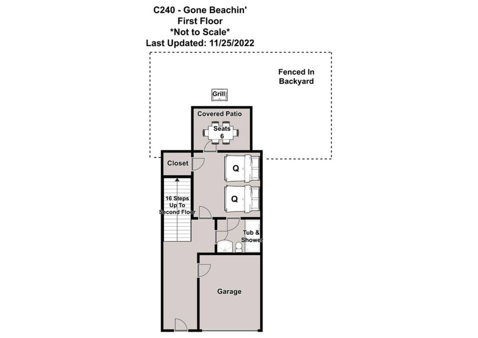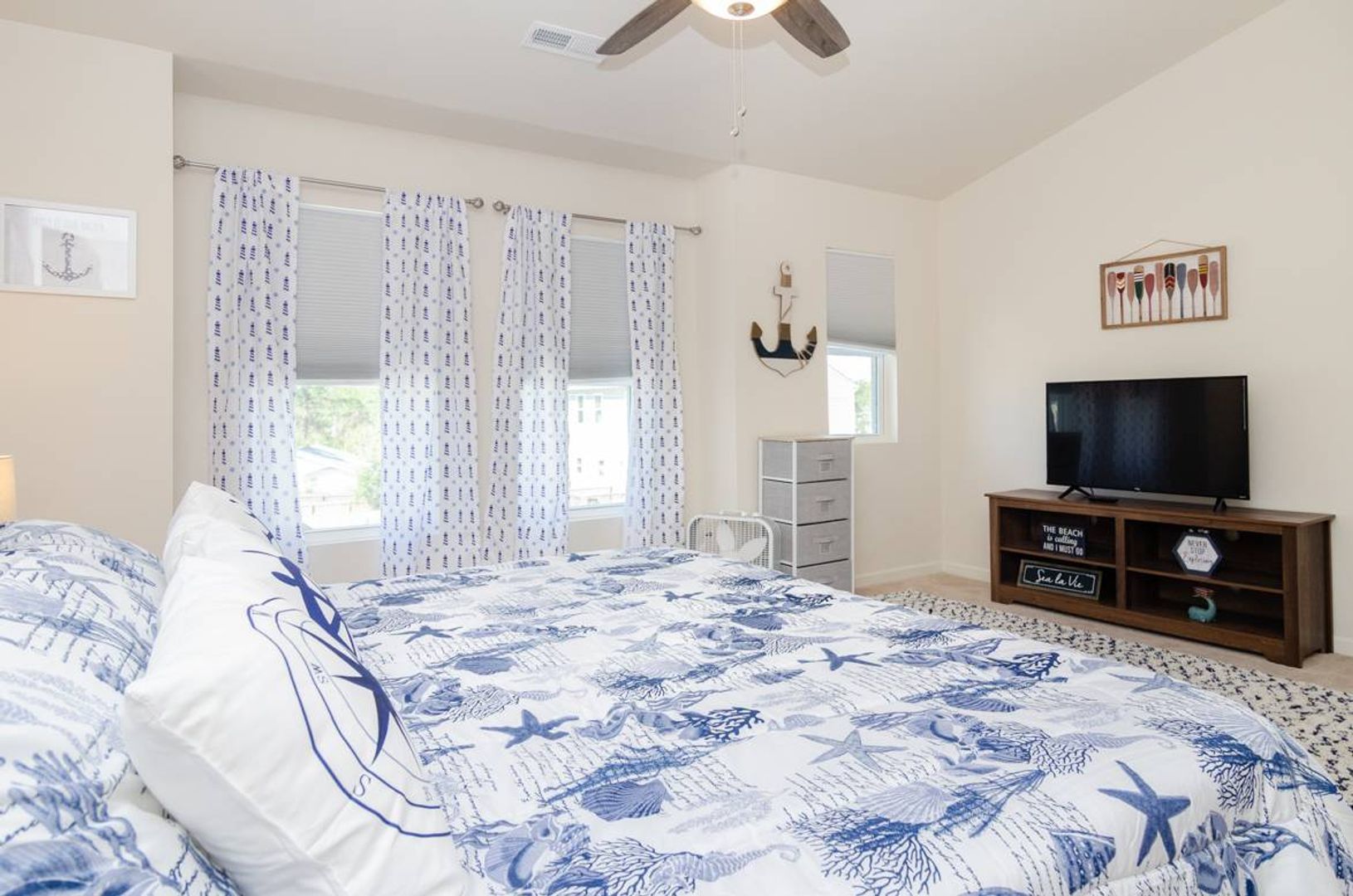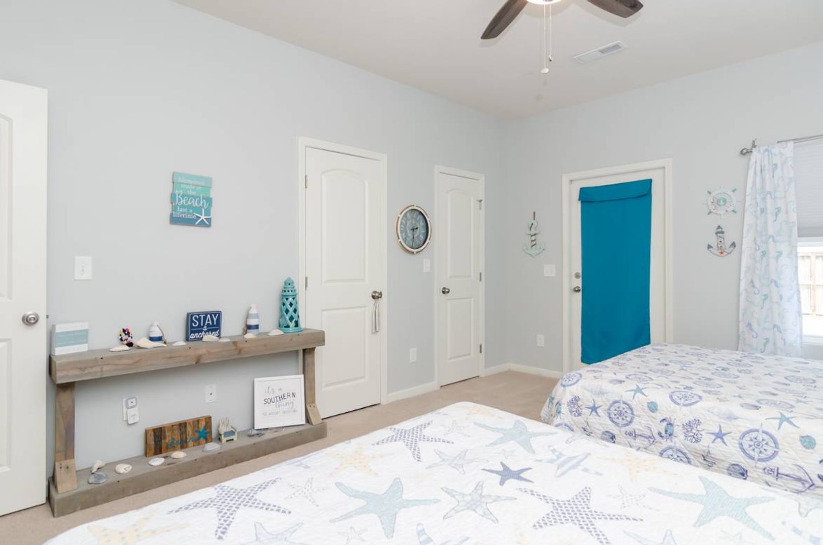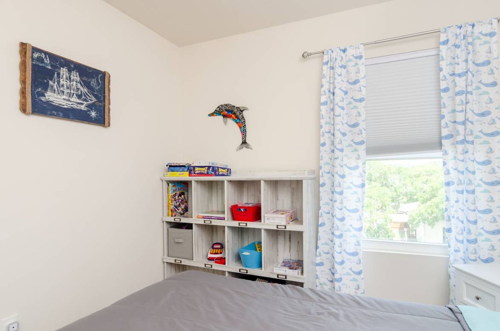 As you enter into the foyer of the property, garage access for storage is located on the right. There is one bedroom with a two queen beds and a full bathroom with a shower/ tub combo. This room also has access to an outside patio and fenced in yard. The second floor of the property is comprised of the kitchen, dining, and living areas with a half bathroom. The third level has the remaining two bedrooms. The first bedroom you arrive at has a Queen bed. There is a hall bathroom with a shower/ tub combo. The hallway to the primary bedroom houses the laundry closet. Once in the primary bedroom, you will find a King bed, TV, and en suite bathroom. The en suite has a double vanity, single shower, and soaking tub.