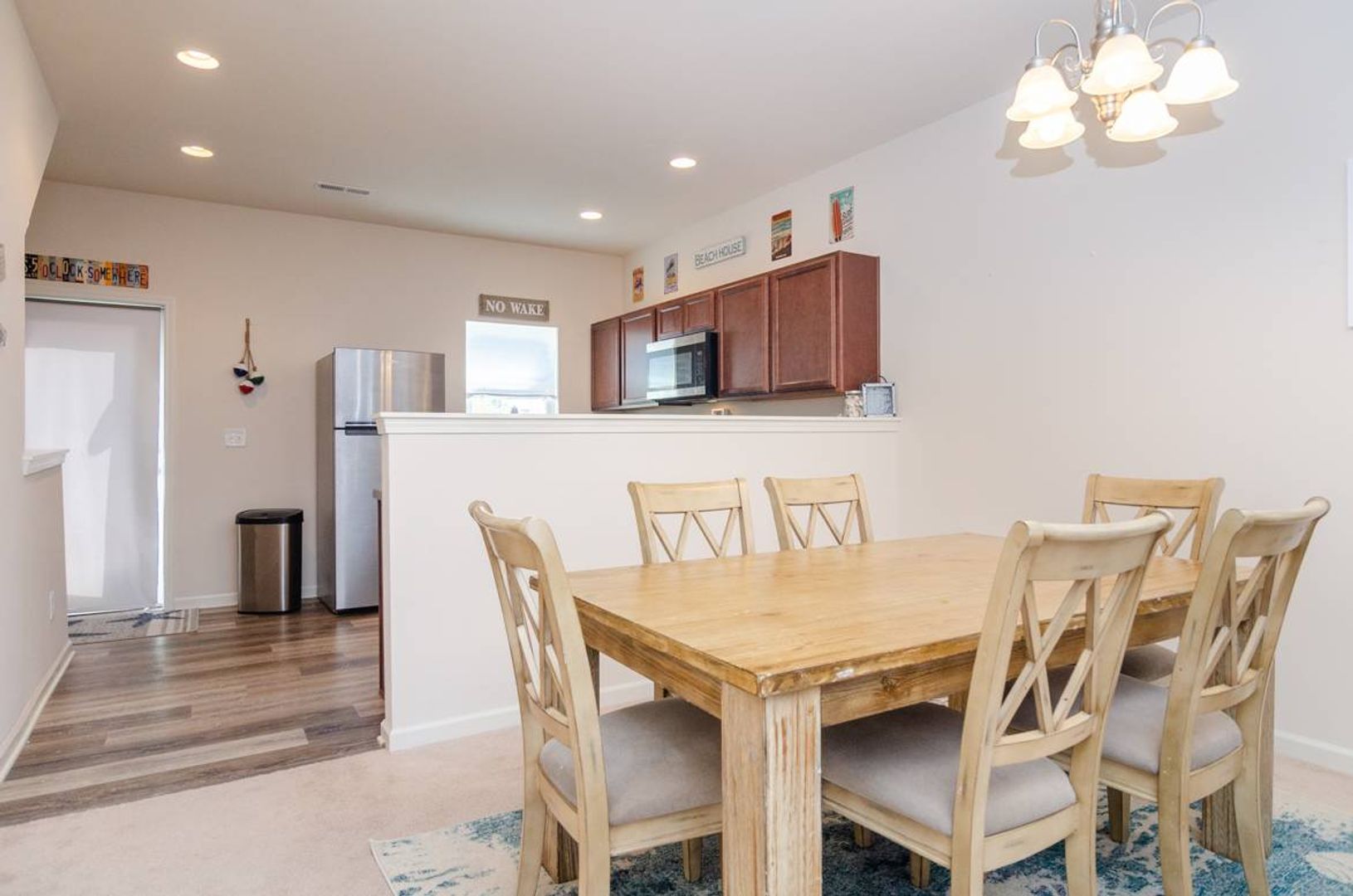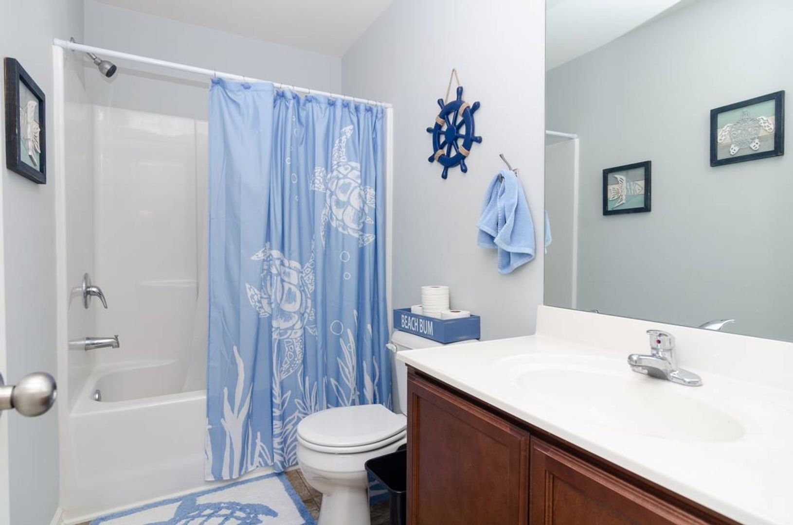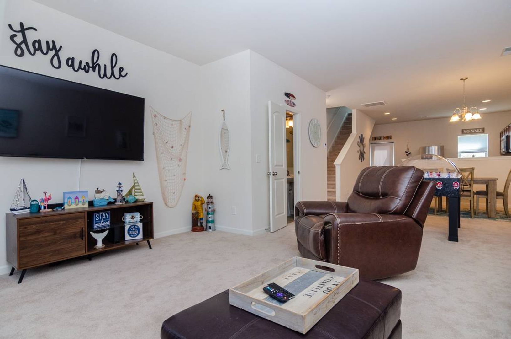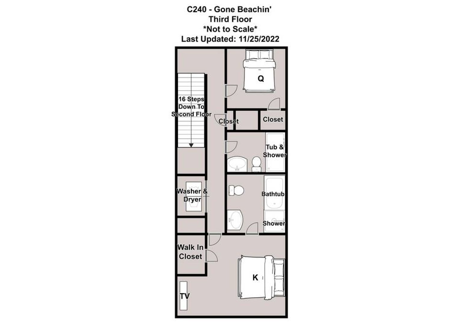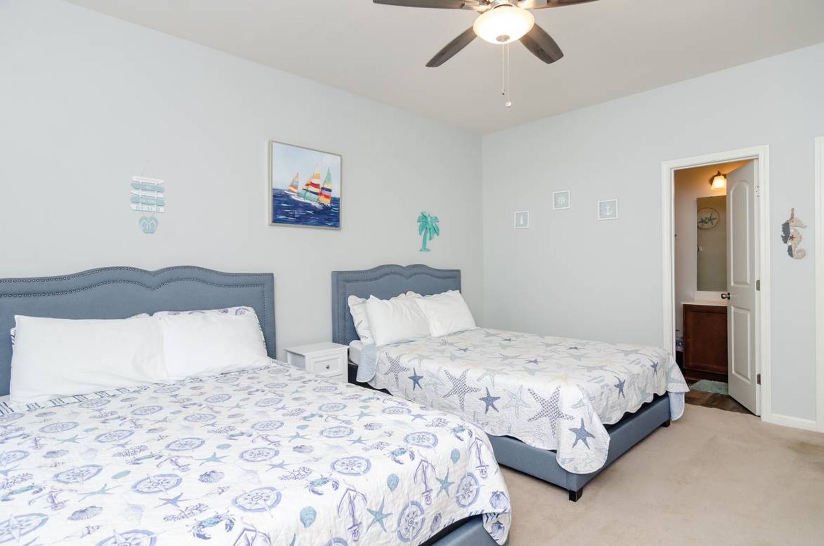 As you enter into the foyer of the property, garage access for storage is located on the right. There is one bedroom with a two queen beds and a full bathroom with a shower/ tub combo. This room also has access to an outside patio and fenced in yard. The second floor of the property is comprised of the kitchen, dining, and living areas with a half bathroom. The third level has the remaining two bedrooms. The first bedroom you arrive at has a Queen bed. There is a hall bathroom with a shower/ tub combo. The hallway to the primary bedroom houses the laundry closet. Once in the primary bedroom, you will find a King bed, TV, and en suite bathroom. The en suite has a double vanity, single shower, and soaking tub.