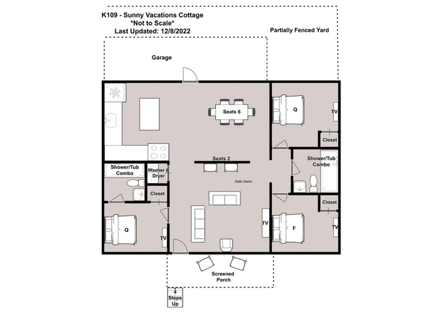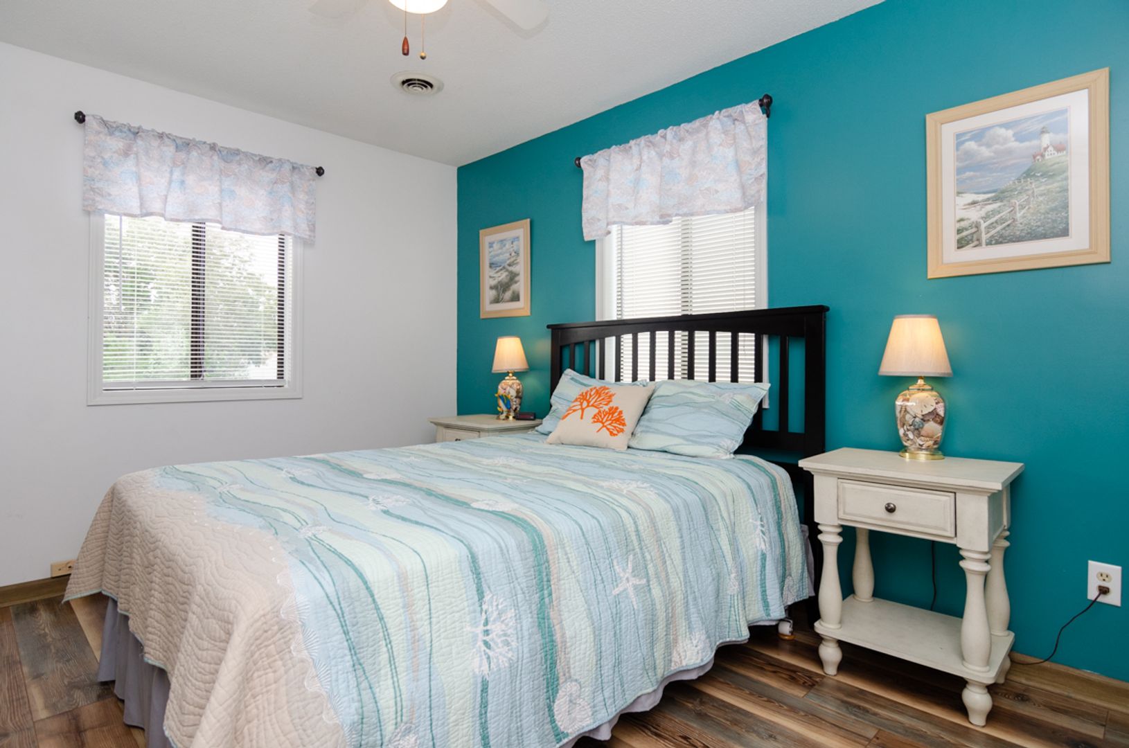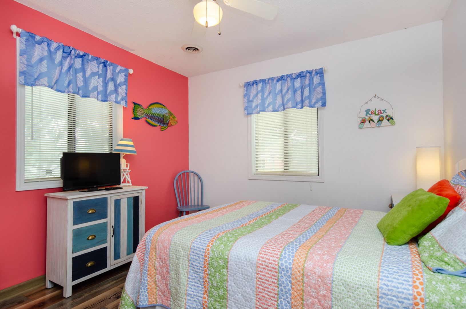 At "Sunny Vacations Cottage", there are 2 Queen beds and 1 Full bed and a lovely screened porch. High speed internet is complimentary, and you'll find Smart TVs with streaming by Chromecast in the bedrooms. There is also a DVD player if you want to bring along some favorite movies. Please note that Cable TV is not provided.