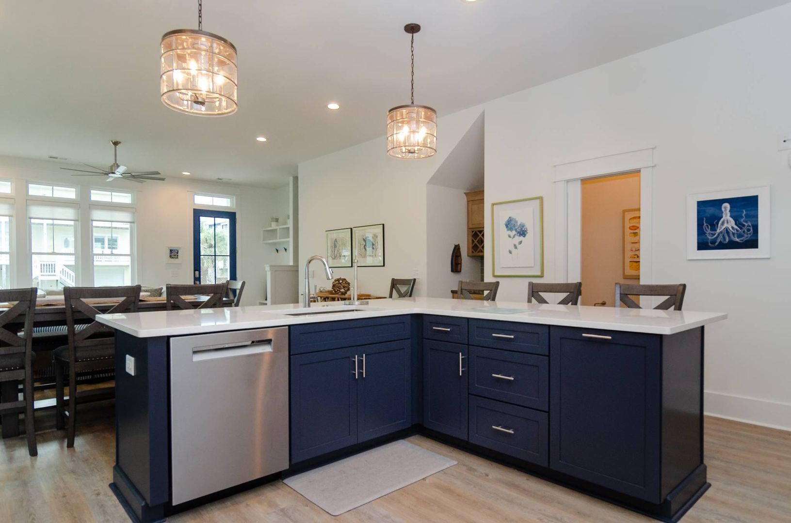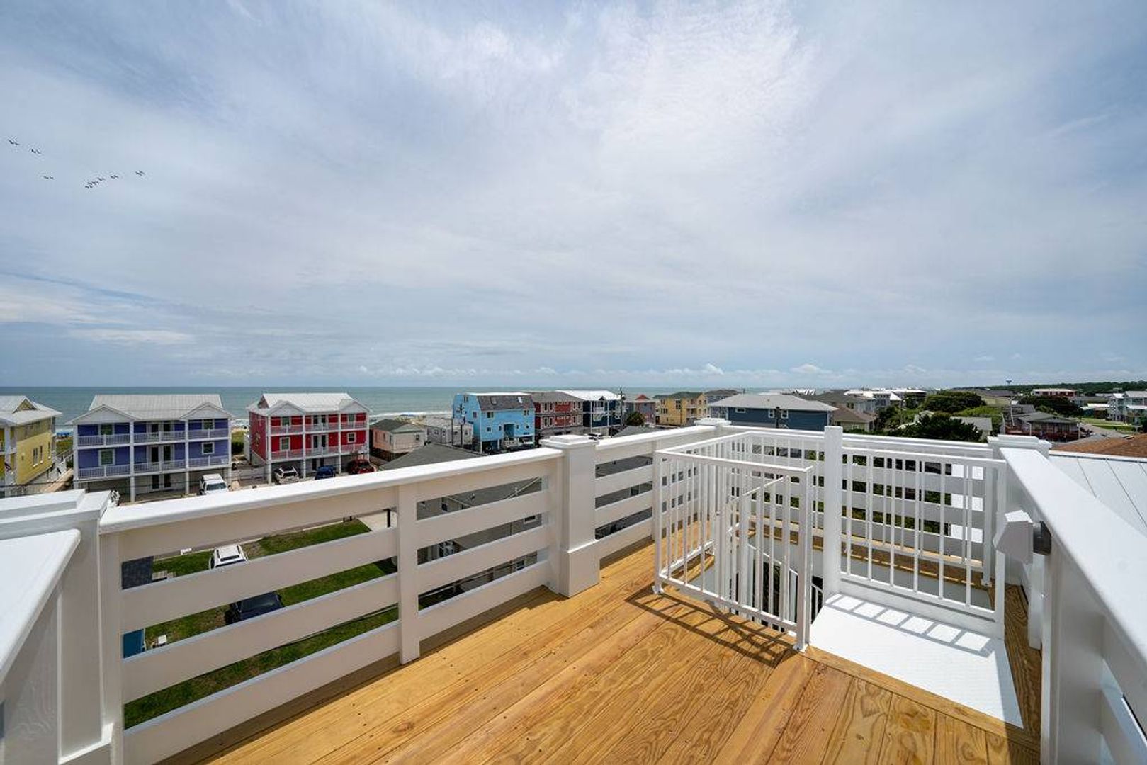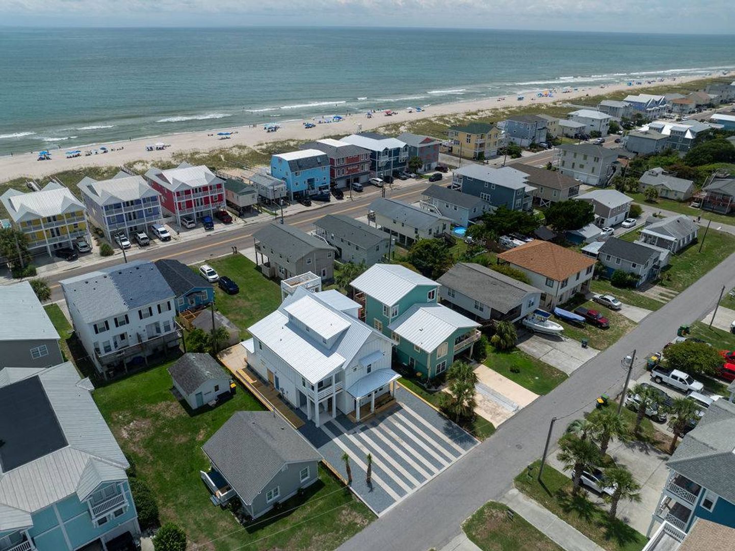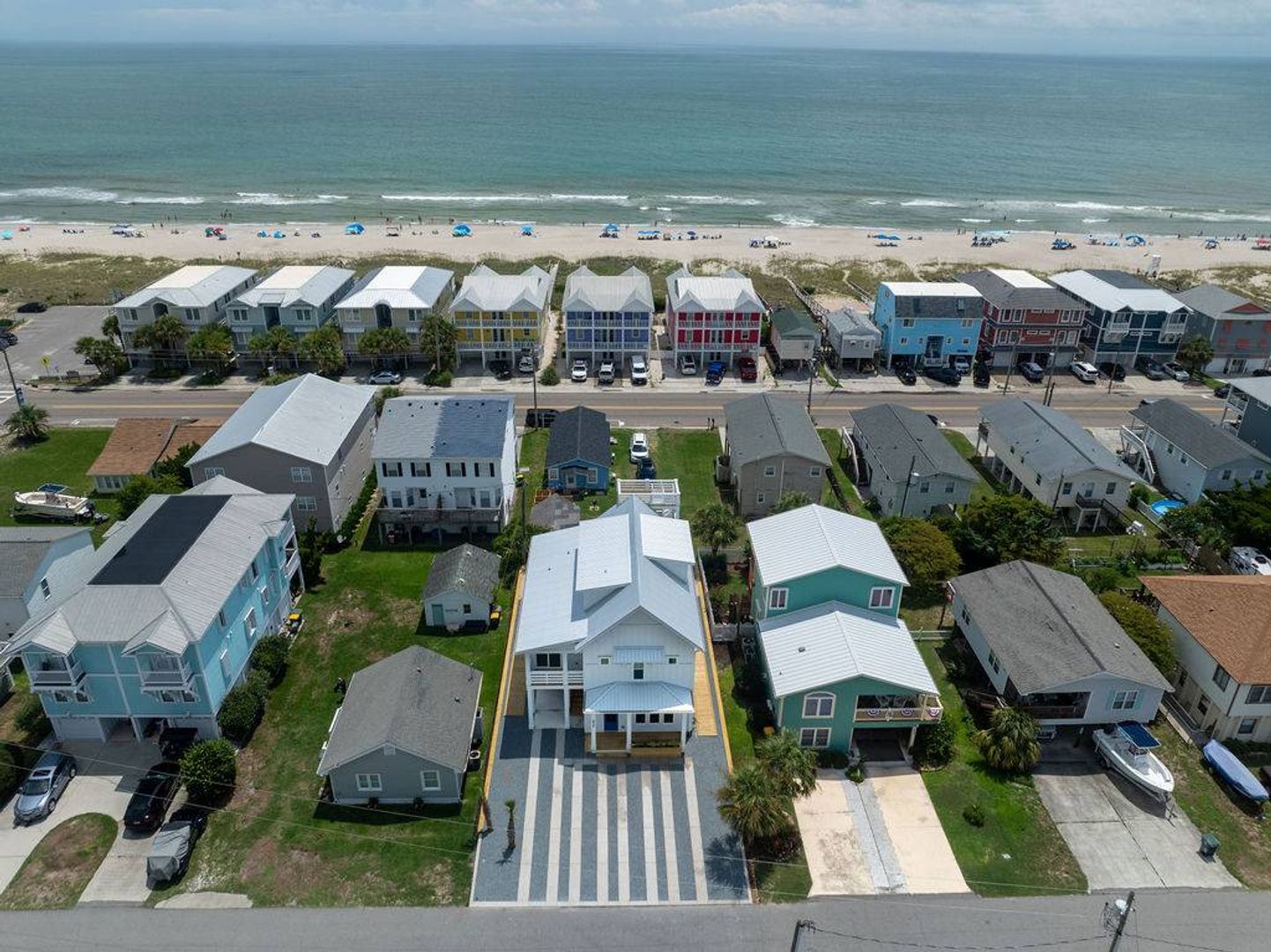 This magnificent new construction home features 6 bedrooms, 4 full bathrooms with two additional powder rooms that offers gorgeous ocean views. Conveniently located in the middle of Kure Beach, the public beach access is just around the corner from the home. This architecturally designed home was completed in August of 2024. As you enter you are welcomed by the by the open great room which features large windows that fill the room with natural light. The living room offers a cozy space and overlooks the stunning kitchen. Complete with a large eat in island and wine bar, the kitchen is outfitted with stainless steel appliances, quartz counter tops, stylish tile back splash, and offer plenty of storage. There is a laundry room off the kitchen that provides access to the backyard. A conveniently placed powder room located near the living room offers convenience to guests and their visitors. The main living level also features the primary bedroom which is furnished with a king-sized bed and includes an en-suite bathroom and shares access to the backyard. You will enjoy the upscale touches, dual vanity, walk in shower, and large walk-in closet offered by the primary suite.