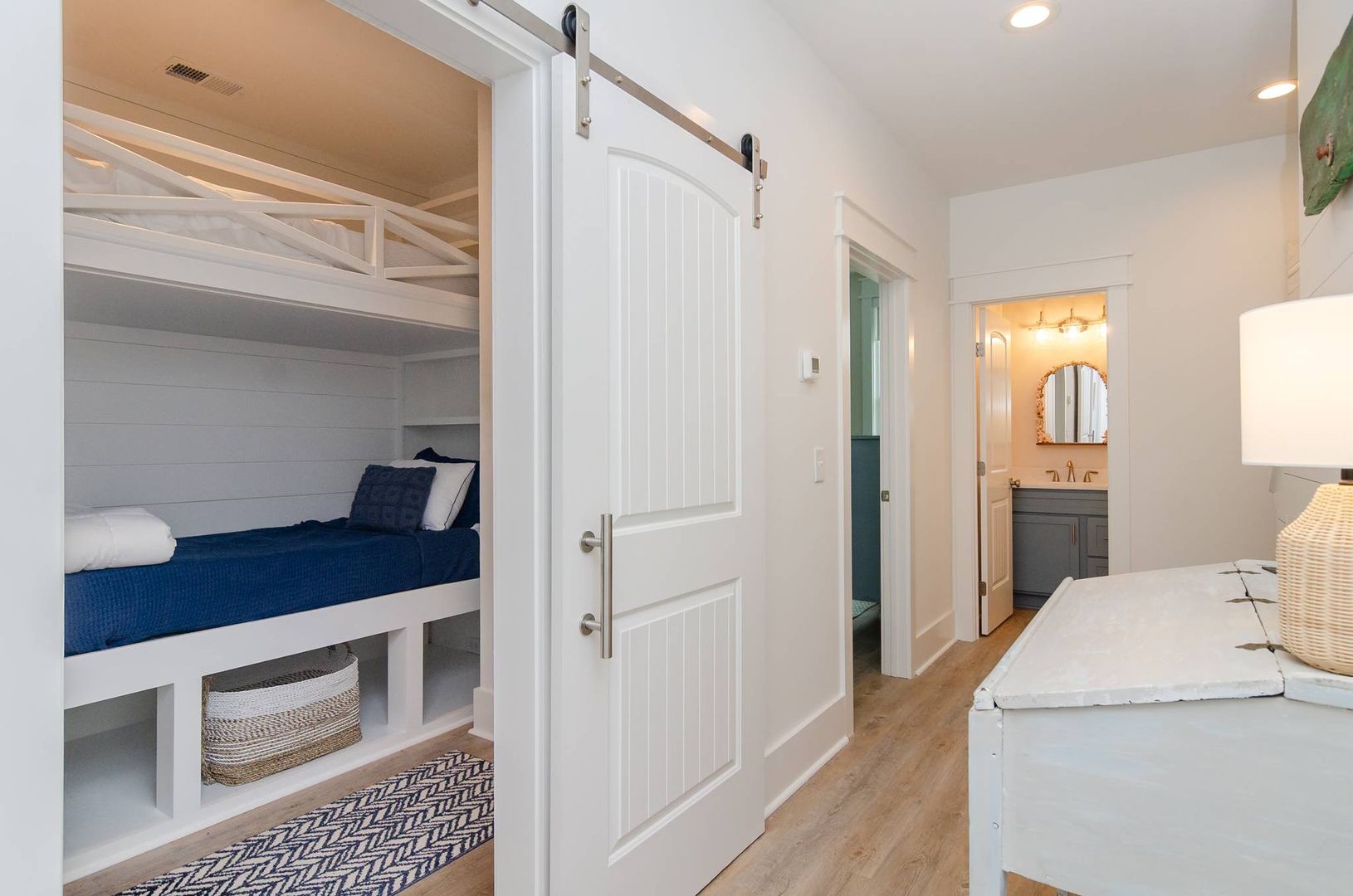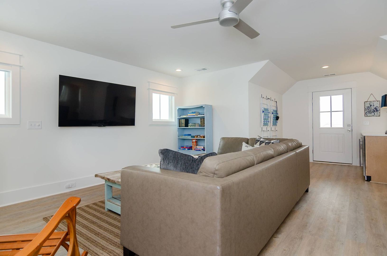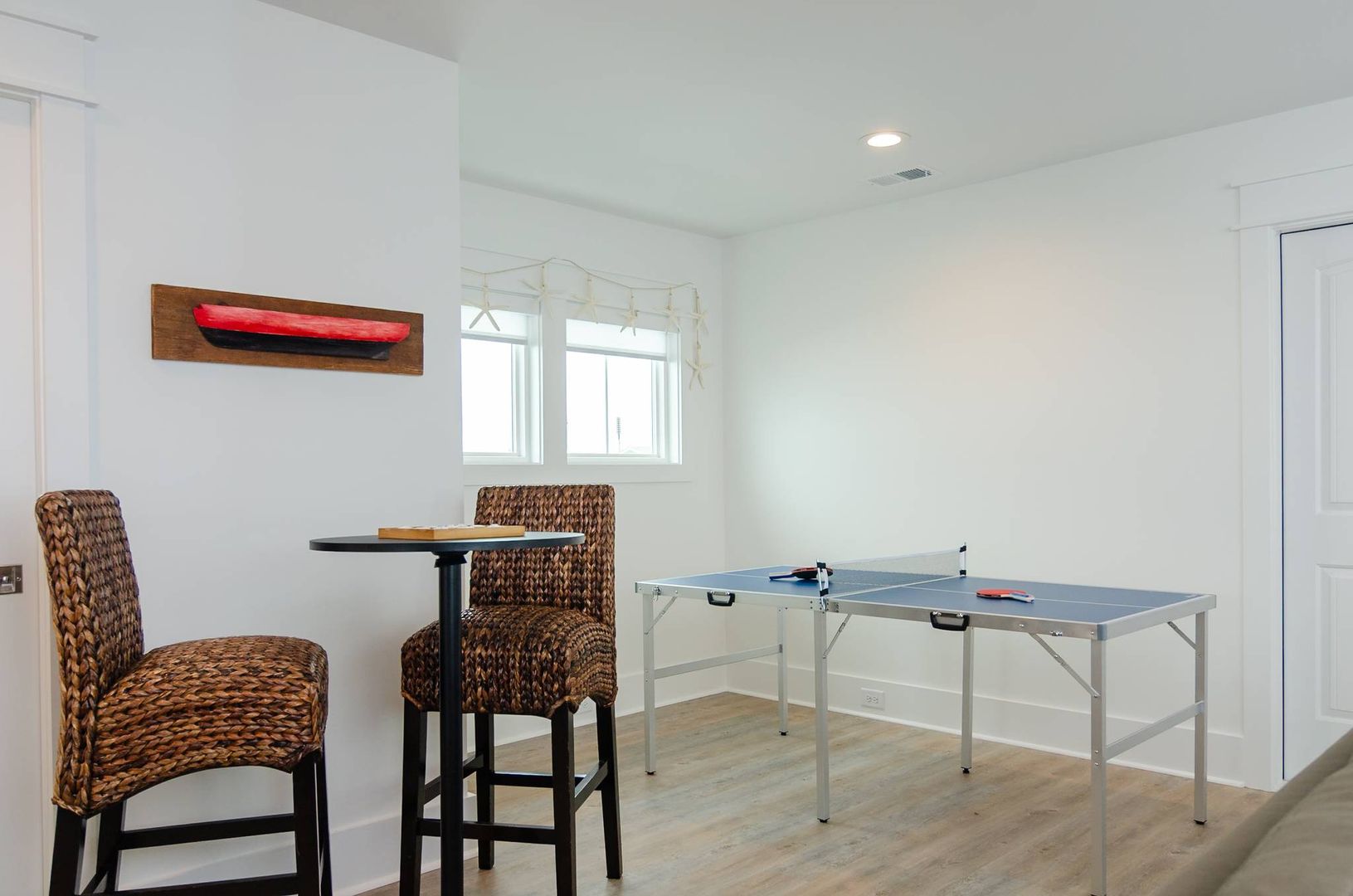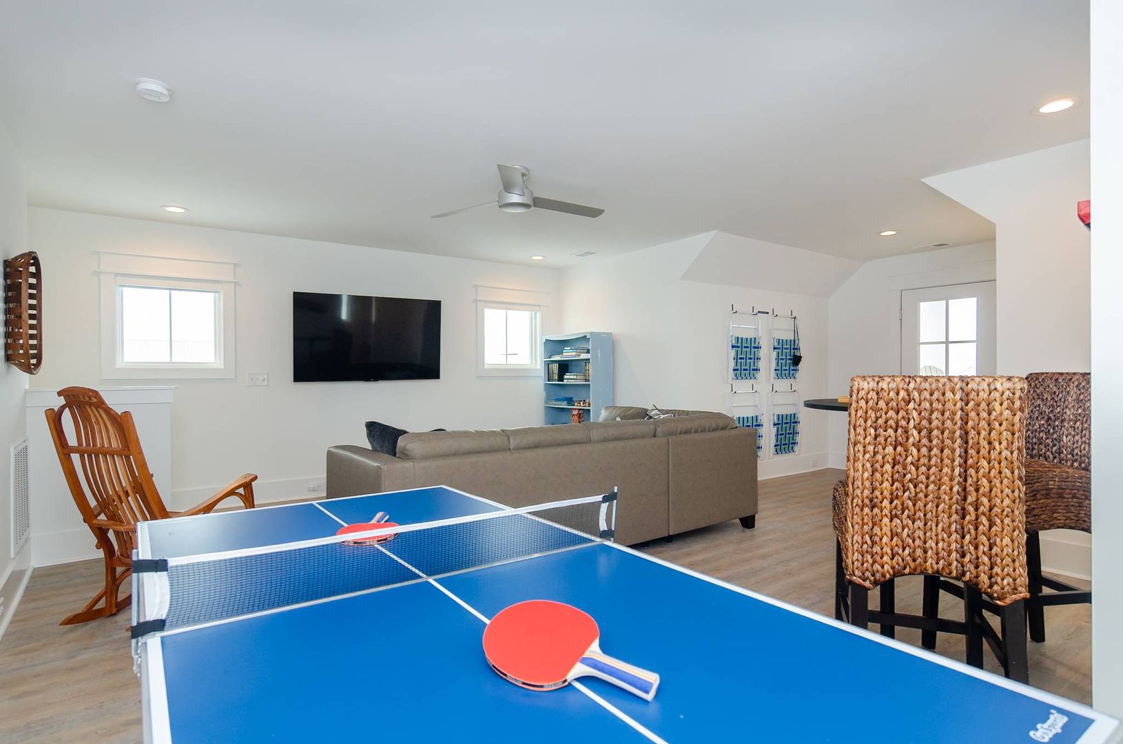 Upstairs you will find a bonus living room and kitchen area that adds to the space and comfort of this house. This additional living space features a queen en-suite as well as a queen sleeper sofa. There is a private deck off the bonus room. The nearby full bathroom includes a gorgeous walk-in shower and serves guests utilizing the bonus room as well as the nearby queen guest room. The first guest room is furnished with a plush queen bed. There is a door that can be closed to separate the queen guest room, bathroom, and kitchen area so that the space can be used as an in-law suite if desired. There is an exterior entrance to this area for added privacy! The second guest bedroom is outfitted with a king bed and offers double closets, a private en-suite bathroom with dual vanity, walk-in shower, and provides access to the rear deck. The third guest room on this living level offers two free standing twin beds and a sizable closet. Next door is a charming bunk bedroom that includes built in twin bunk beds. The fifth and final bedroom is a queen guest room. Located close to the full bathroom at the end of the hall, this shared guest bathroom offers a combination shower tub. The top floor holds a truly special surprise that everyone will appreciate! A wonderful game room complete with entertainment options, a powder room, peek-a-boo ocean views, and a wine bar.