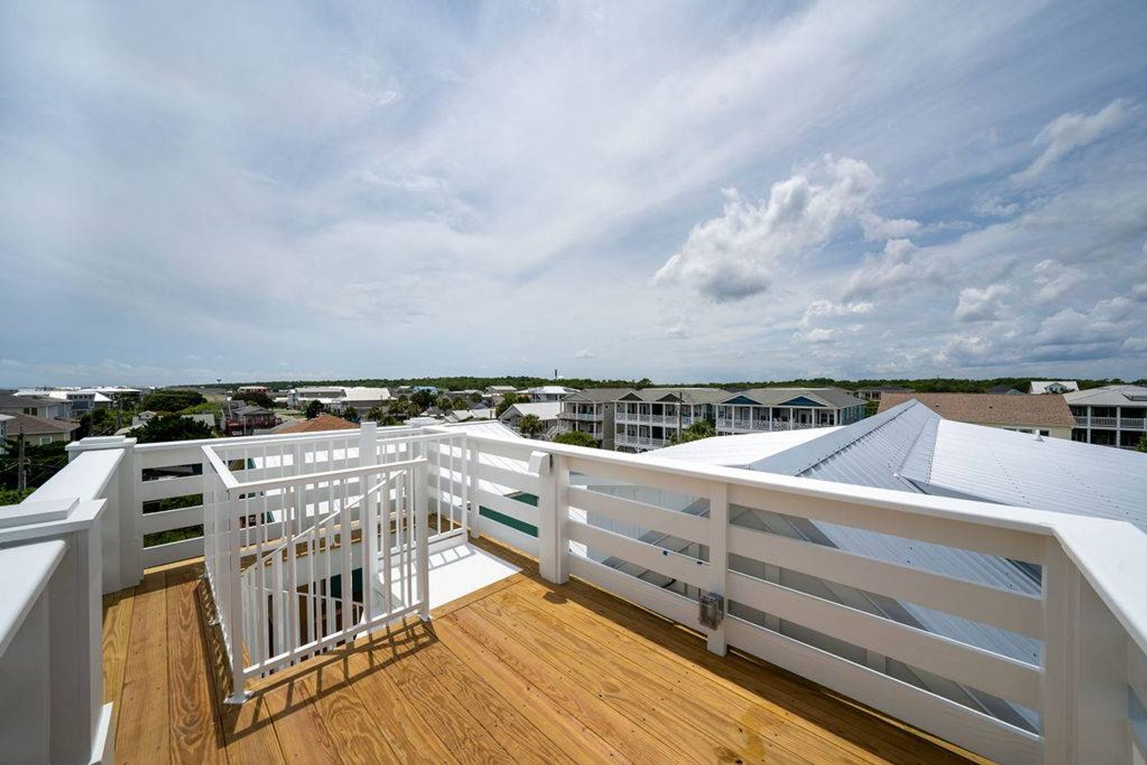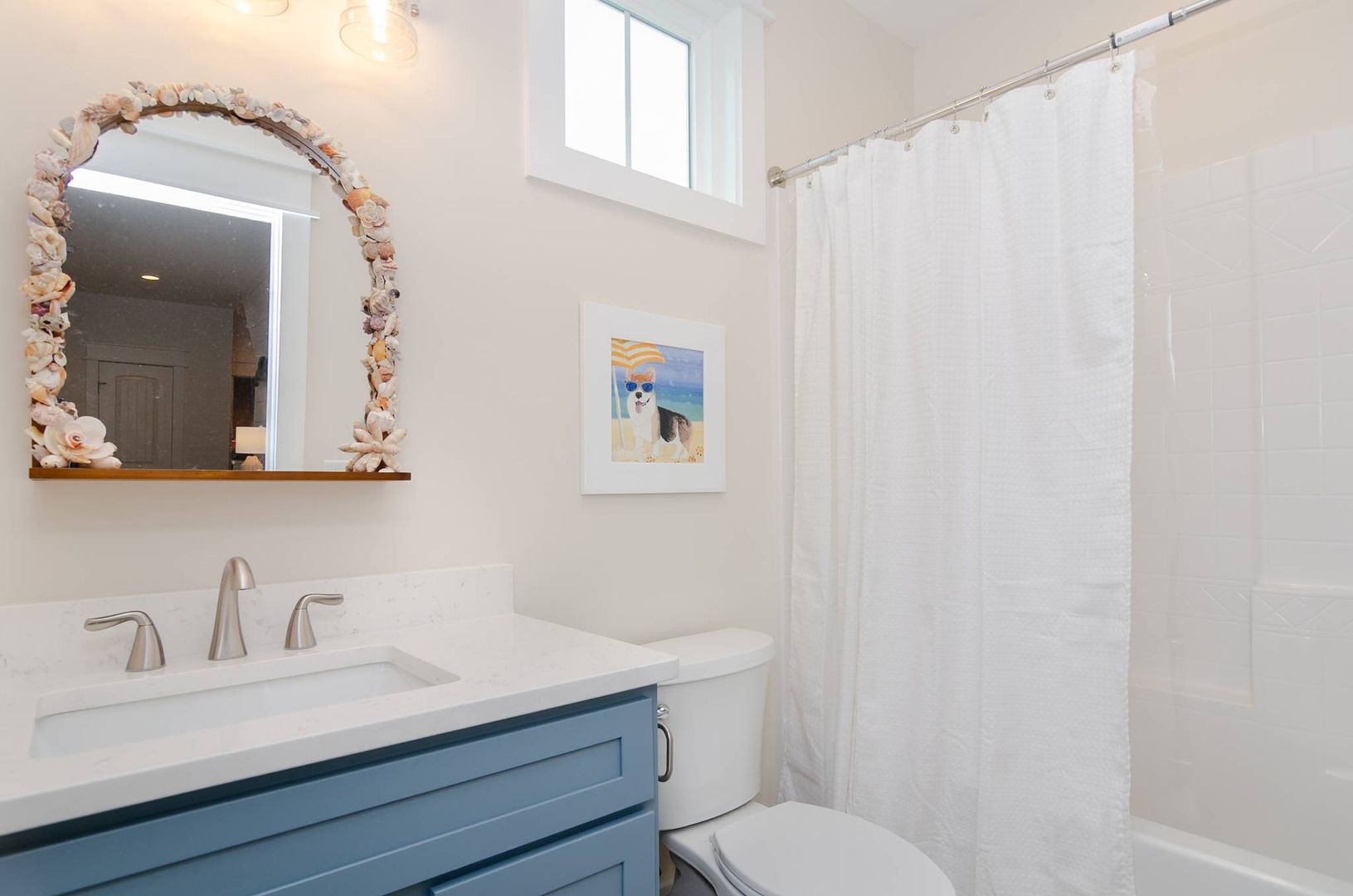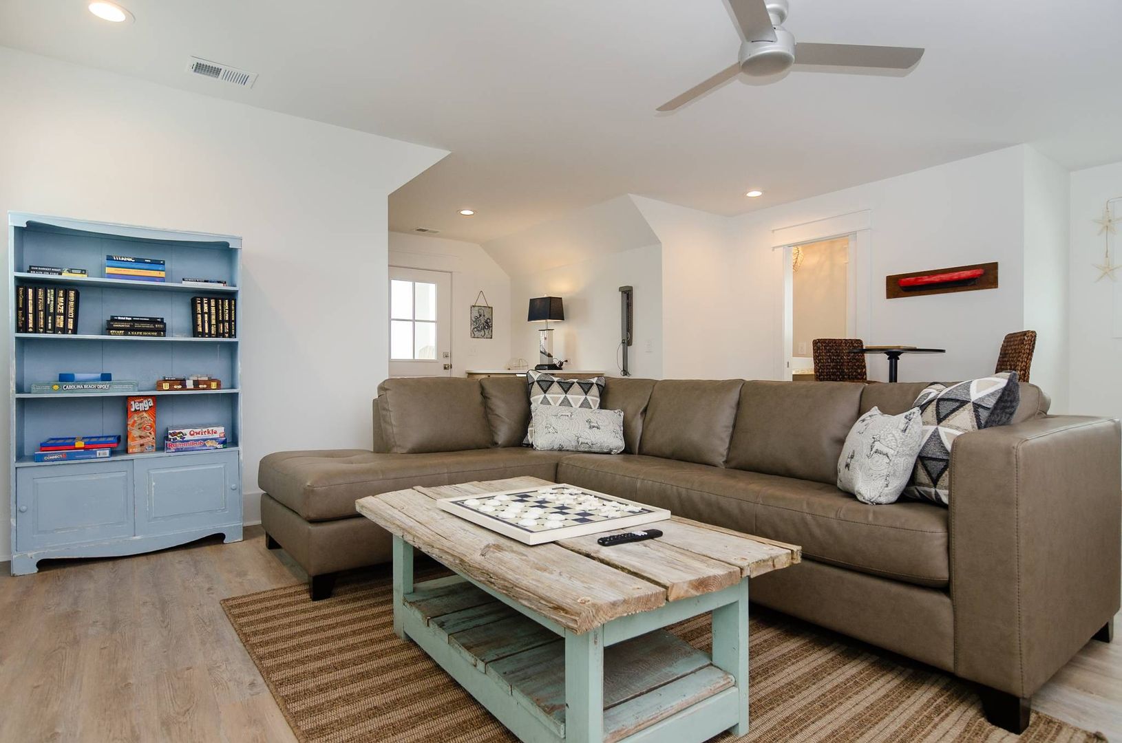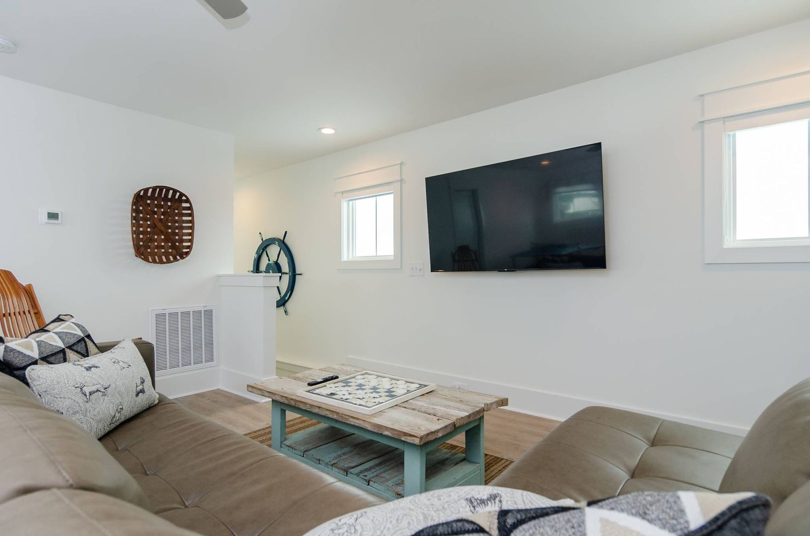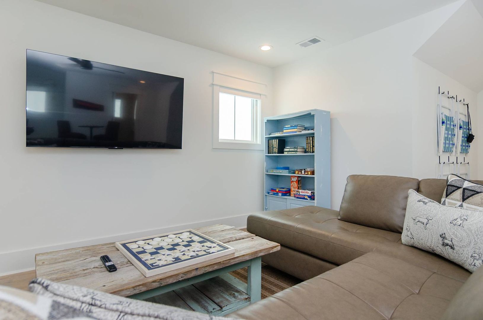 Upstairs you will find a bonus living room and kitchen area that adds to the space and comfort of this house. This additional living space features a queen en-suite as well as a queen sleeper sofa. There is a private deck off the bonus room. The nearby full bathroom includes a gorgeous walk-in shower and serves guests utilizing the bonus room as well as the nearby queen guest room. The first guest room is furnished with a plush queen bed. There is a door that can be closed to separate the queen guest room, bathroom, and kitchen area so that the space can be used as an in-law suite if desired. There is an exterior entrance to this area for added privacy! The second guest bedroom is outfitted with a king bed and offers double closets, a private en-suite bathroom with dual vanity, walk-in shower, and provides access to the rear deck. The third guest room on this living level offers two free standing twin beds and a sizable closet. Next door is a charming bunk bedroom that includes built in twin bunk beds. The fifth and final bedroom is a queen guest room. Located close to the full bathroom at the end of the hall, this shared guest bathroom offers a combination shower tub. The top floor holds a truly special surprise that everyone will appreciate! A wonderful game room complete with entertainment options, a powder room, peek-a-boo ocean views, and a wine bar.