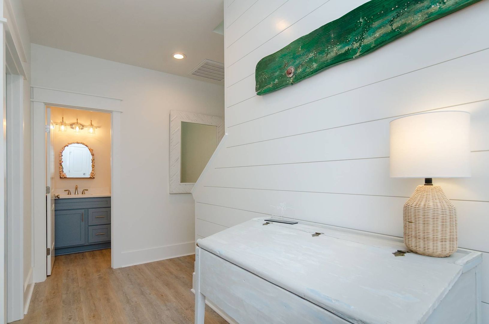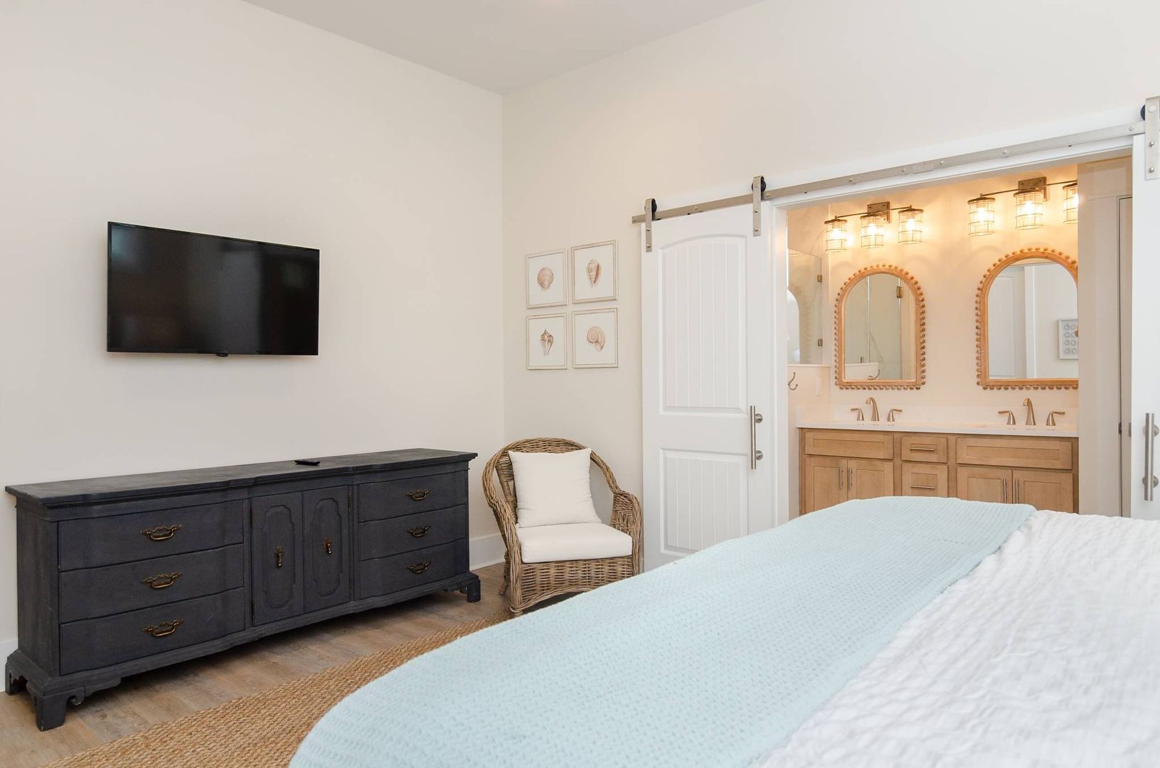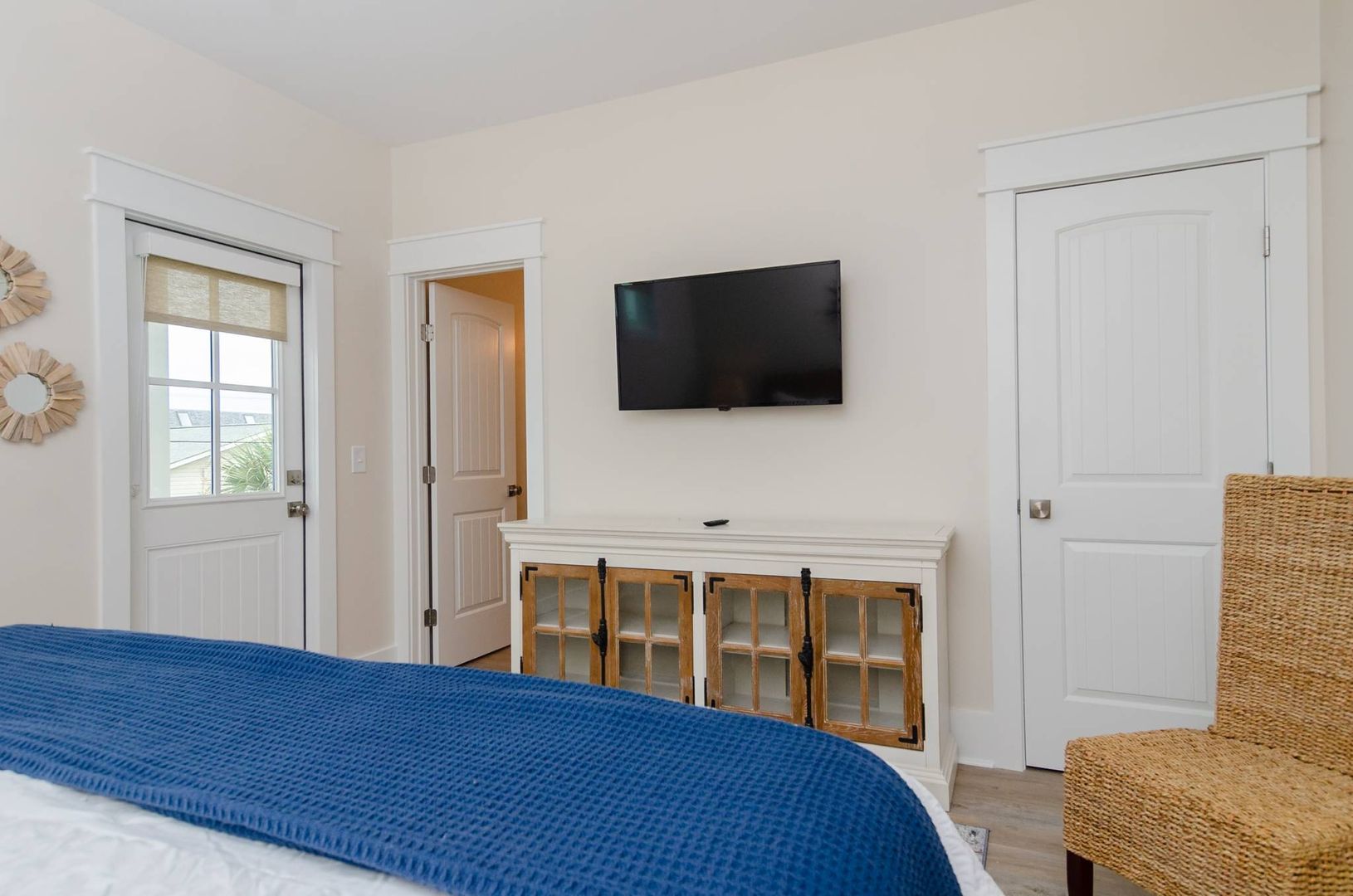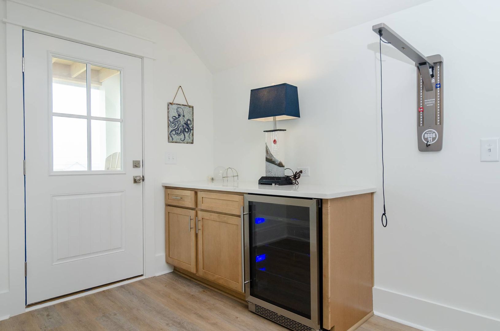 Upstairs you will find a bonus living room and kitchen area that adds to the space and comfort of this house. This additional living space features a queen en-suite as well as a queen sleeper sofa. There is a private deck off the bonus room. The nearby full bathroom includes a gorgeous walk-in shower and serves guests utilizing the bonus room as well as the nearby queen guest room. The first guest room is furnished with a plush queen bed. There is a door that can be closed to separate the queen guest room, bathroom, and kitchen area so that the space can be used as an in-law suite if desired. There is an exterior entrance to this area for added privacy! The second guest bedroom is outfitted with a king bed and offers double closets, a private en-suite bathroom with dual vanity, walk-in shower, and provides access to the rear deck. The third guest room on this living level offers two free standing twin beds and a sizable closet. Next door is a charming bunk bedroom that includes built in twin bunk beds. The fifth and final bedroom is a queen guest room. Located close to the full bathroom at the end of the hall, this shared guest bathroom offers a combination shower tub. The top floor holds a truly special surprise that everyone will appreciate! A wonderful game room complete with entertainment options, a powder room, peek-a-boo ocean views, and a wine bar.