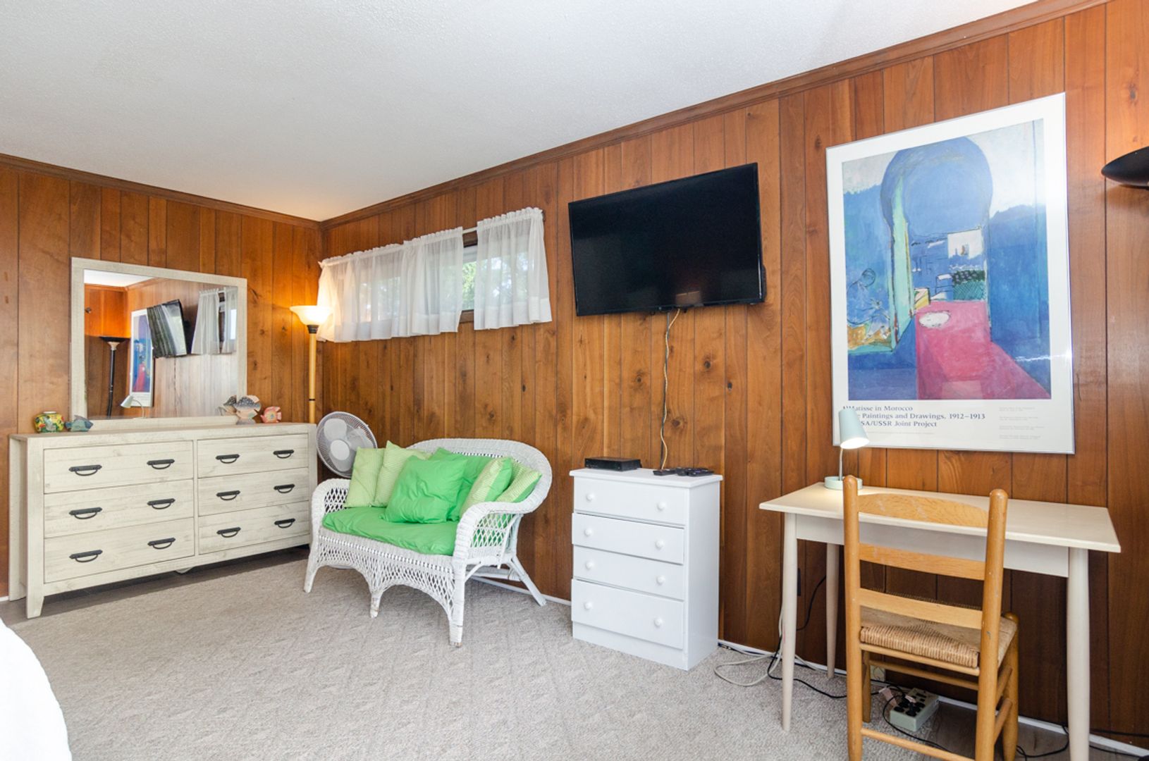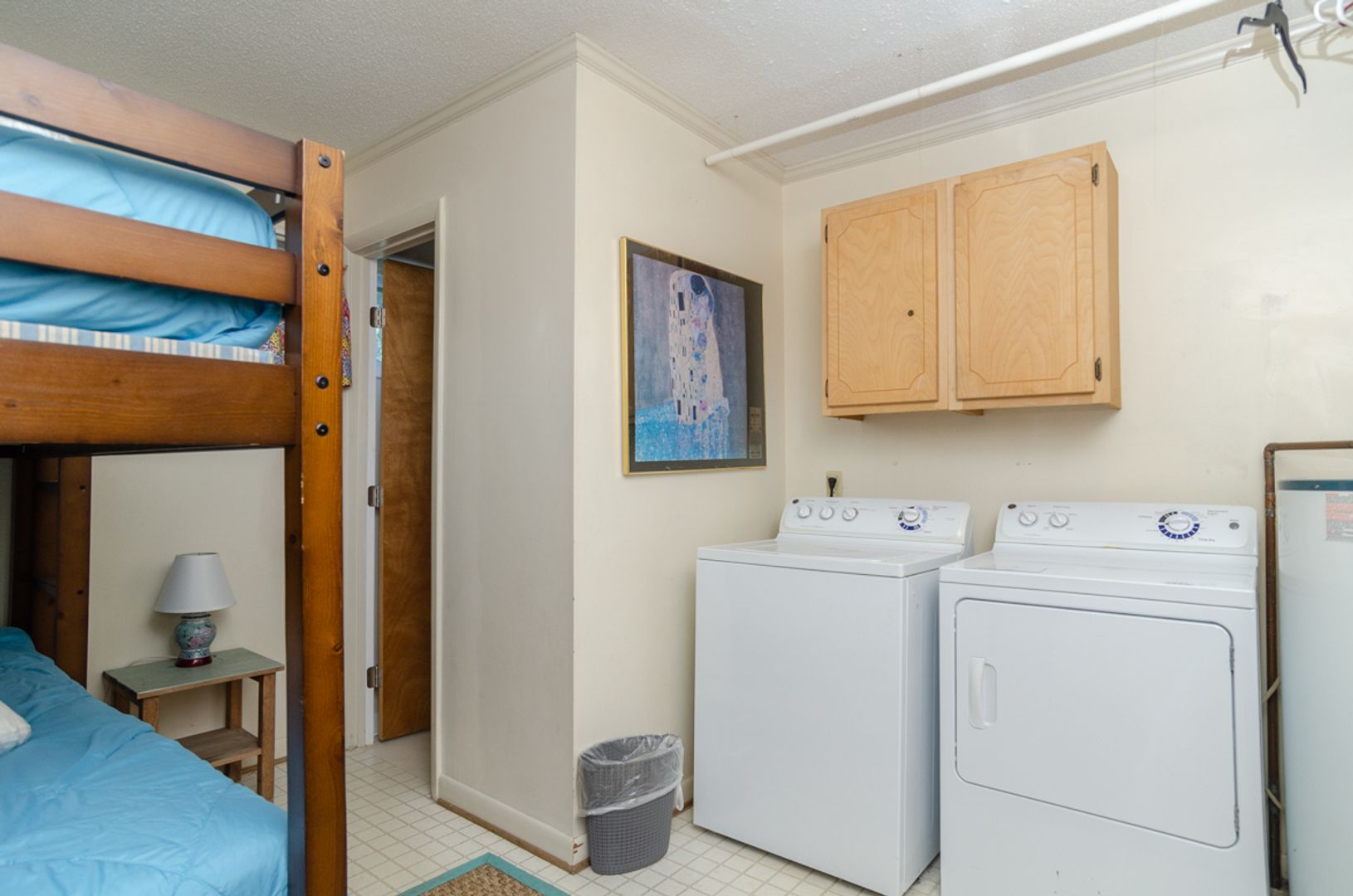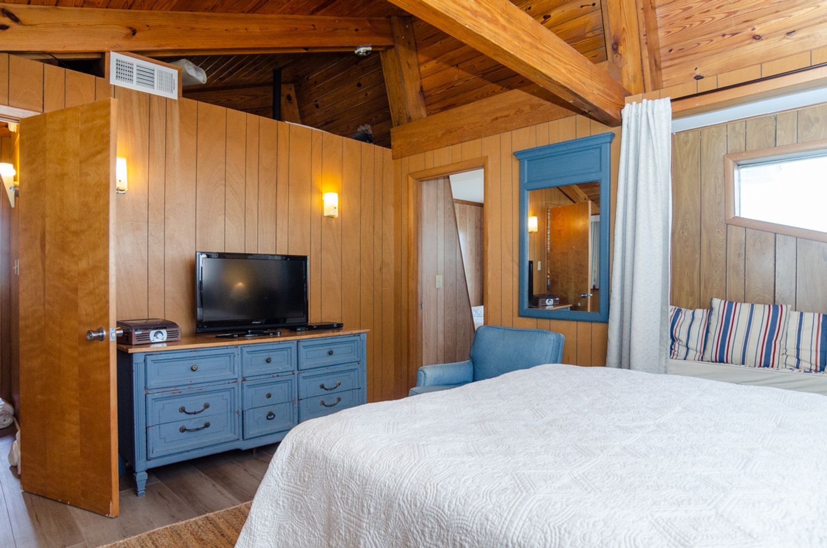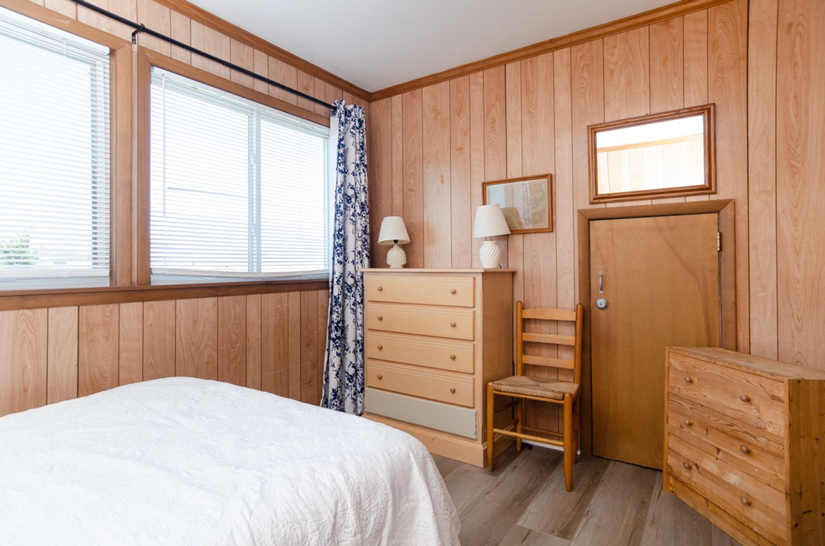 The main living level of “Cardwell” has a large living-dining area with cathedral ceilings. A series of sliding glass doors wrap the home to allow natural light to flood the living space and showcase the picturesque views beyond. The kitchen and bathrooms have been lightly updated to make a comfortable space to prepare home cooked meals for the family. A large dining table provides ample seating and opens to the main living space that is furnished with plenty of seating options. Just off the kitchen is a small multi-purpose room that includes a bunk bed (twin over twin), half bathroom, and laundry facilities.