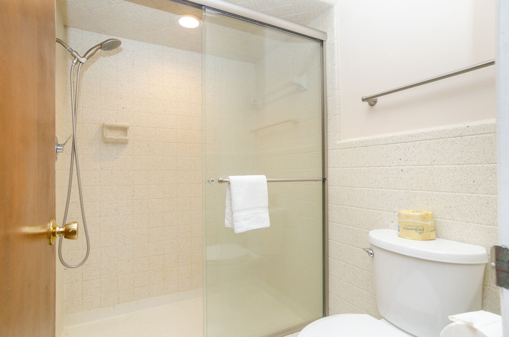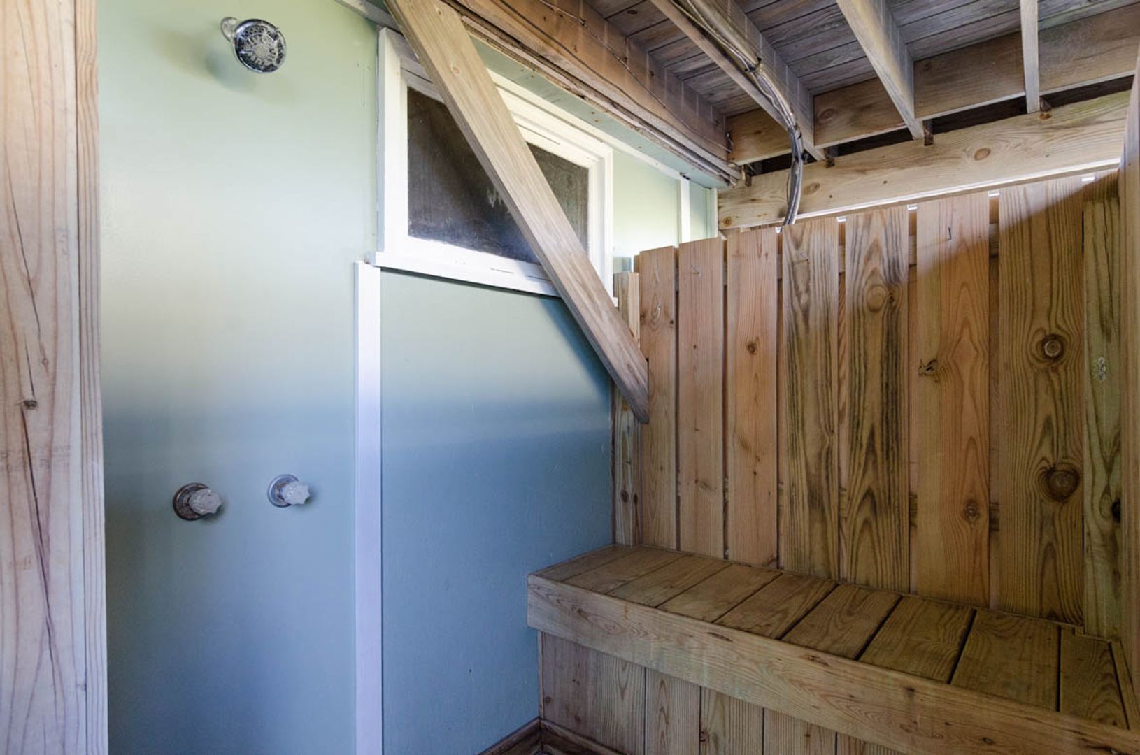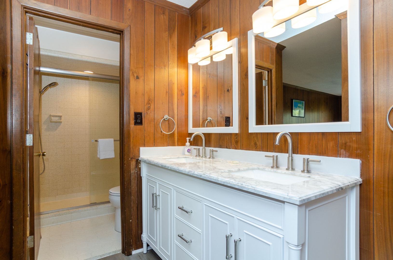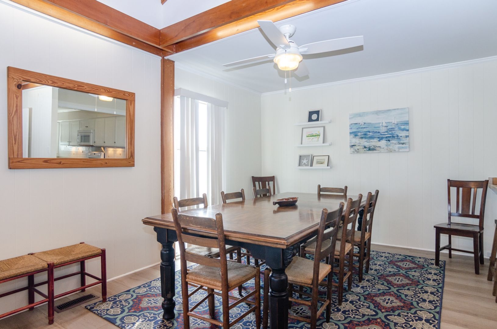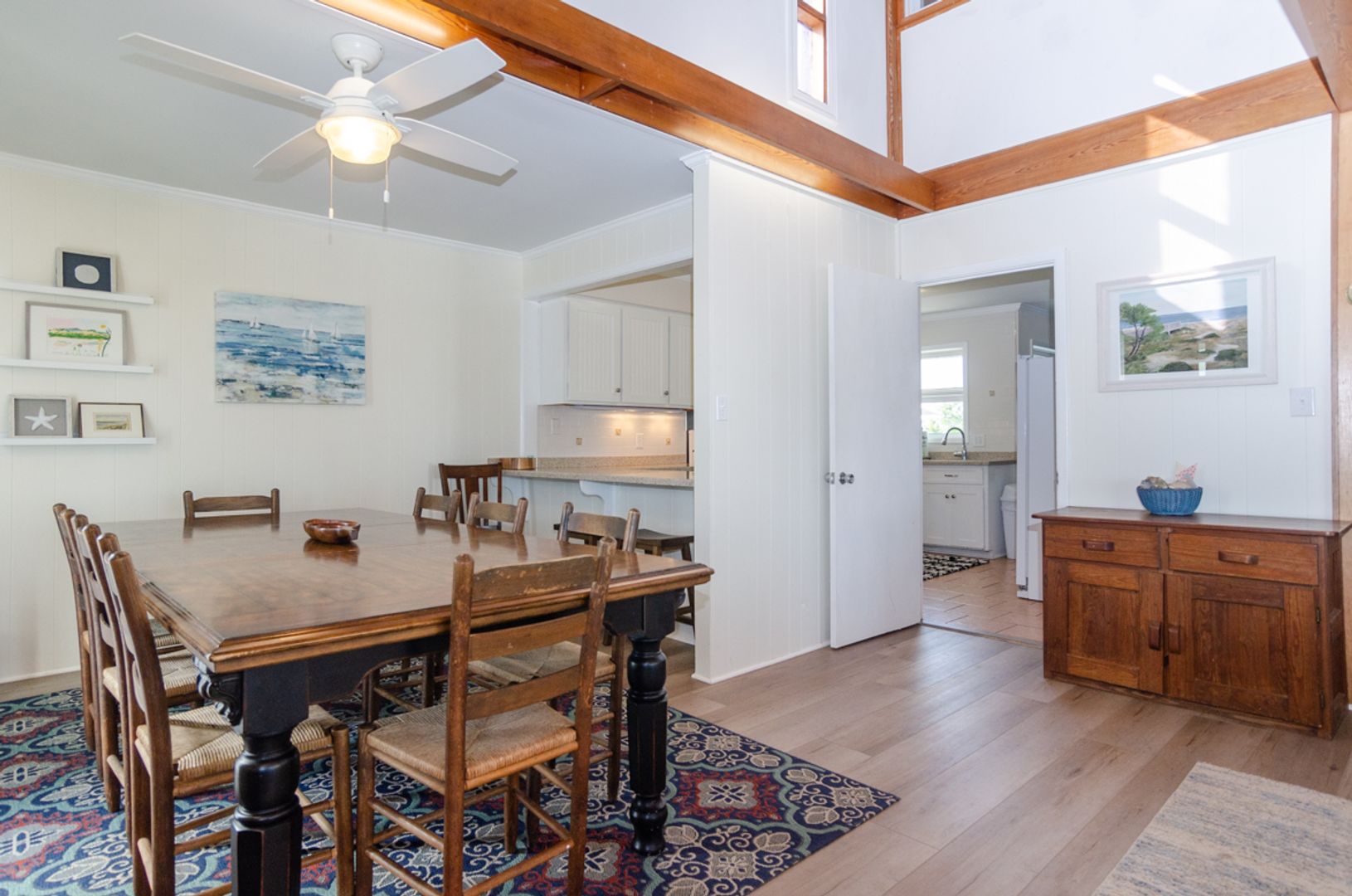 The main living level of “Cardwell” has a large living-dining area with cathedral ceilings. A series of sliding glass doors wrap the home to allow natural light to flood the living space and showcase the picturesque views beyond. The kitchen and bathrooms have been lightly updated to make a comfortable space to prepare home cooked meals for the family. A large dining table provides ample seating and opens to the main living space that is furnished with plenty of seating options. Just off the kitchen is a small multi-purpose room that includes a bunk bed (twin over twin), half bathroom, and laundry facilities.