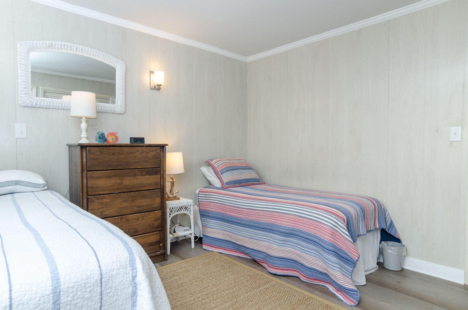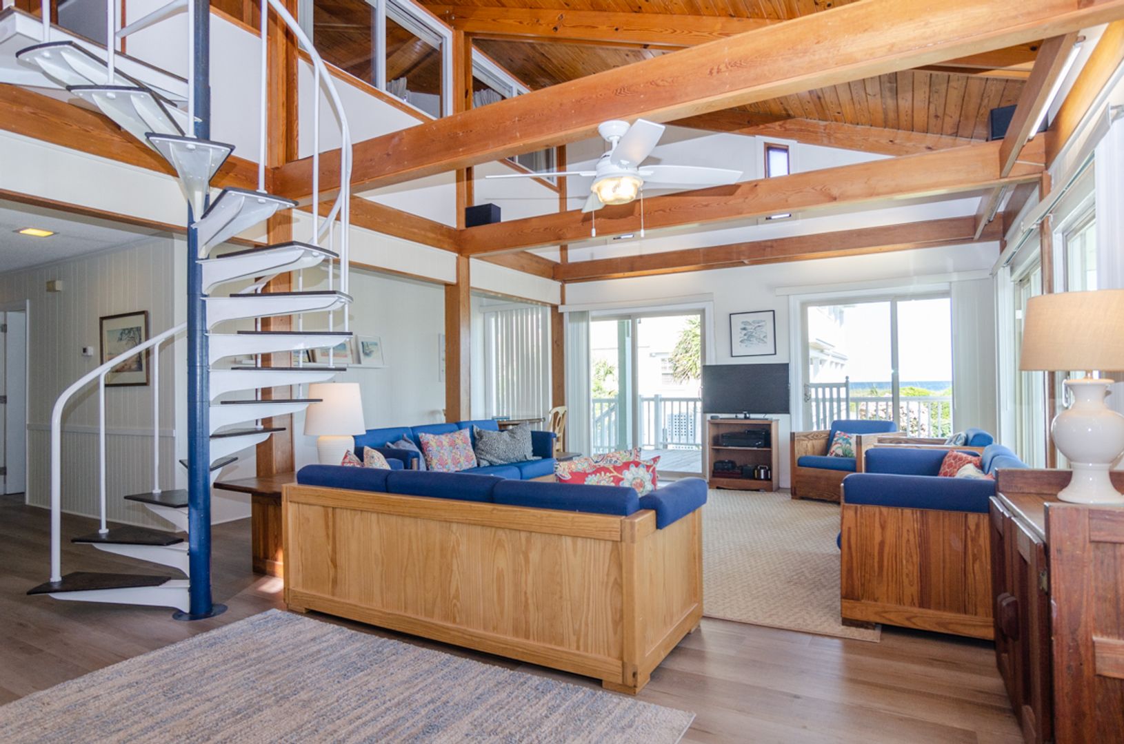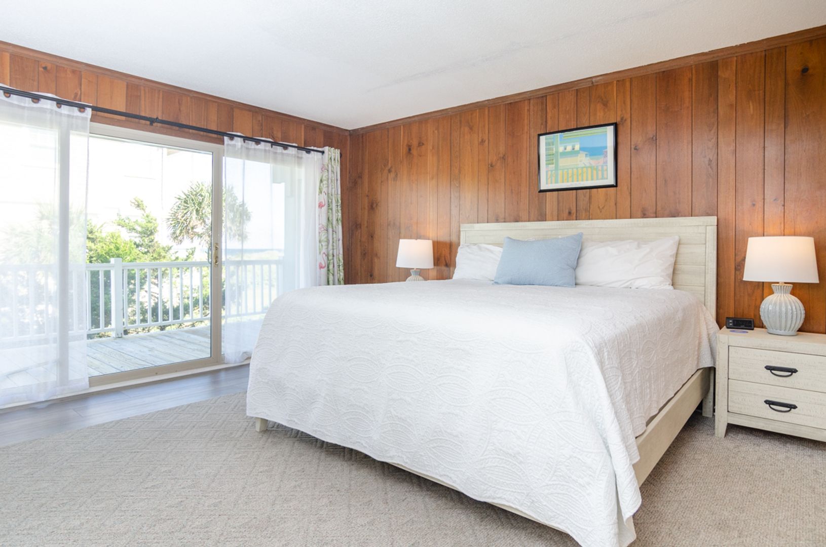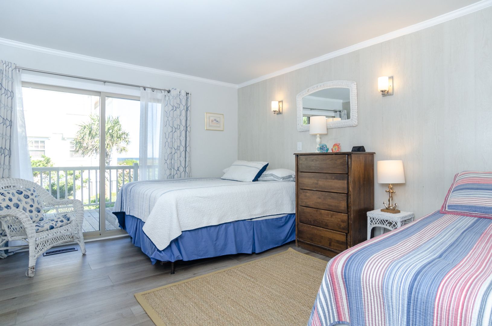 Down the hall on the main living level is a full bathroom that serves the nearby guest room that is furnished with two beds, a twin, and a queen. This guest room has a large sliding glass door that leads to the ocean side deck and offers a nice view of the ocean. The primary suite is located at the end of the hall and features a lush kind sized bed, walk in closet, dual vanity, walk in shower, and gives direct access to the wraparound porch. Wake up each morning to the waves crashing and palms blowing in the soft breeze.