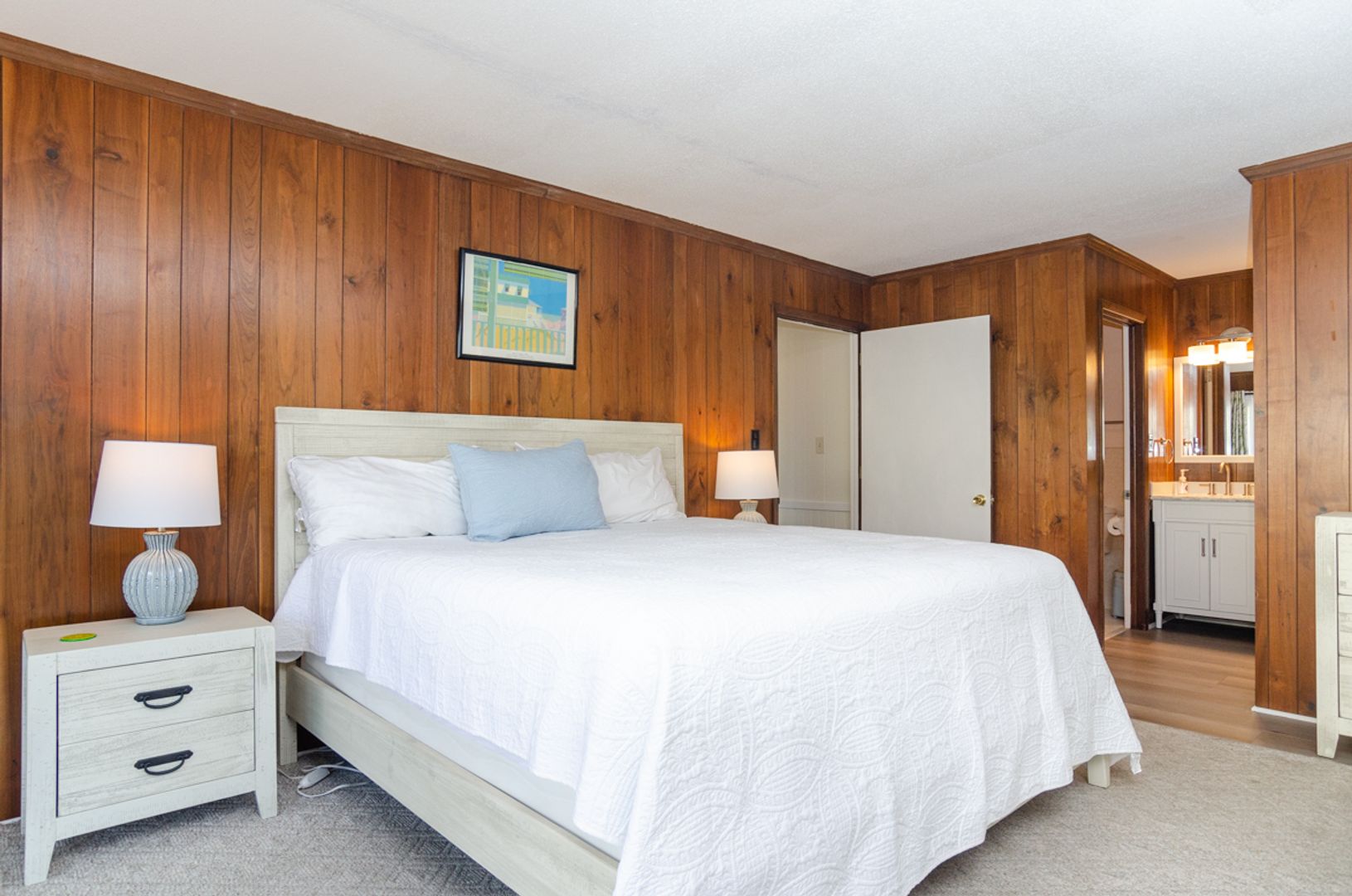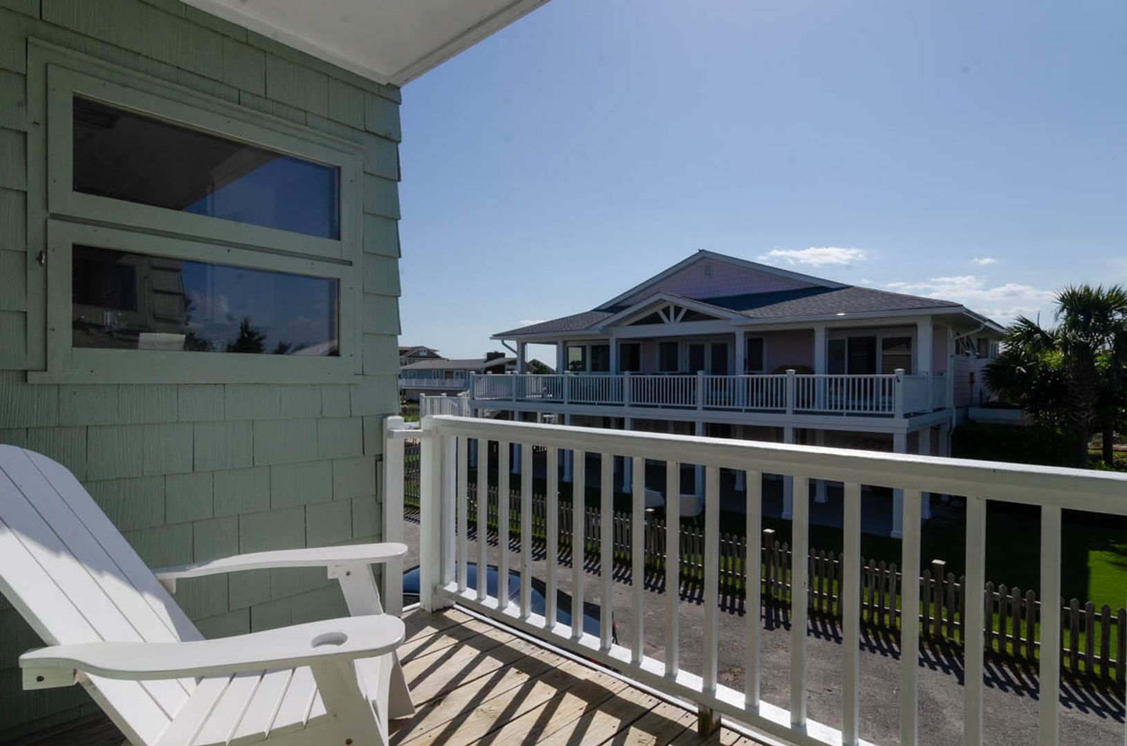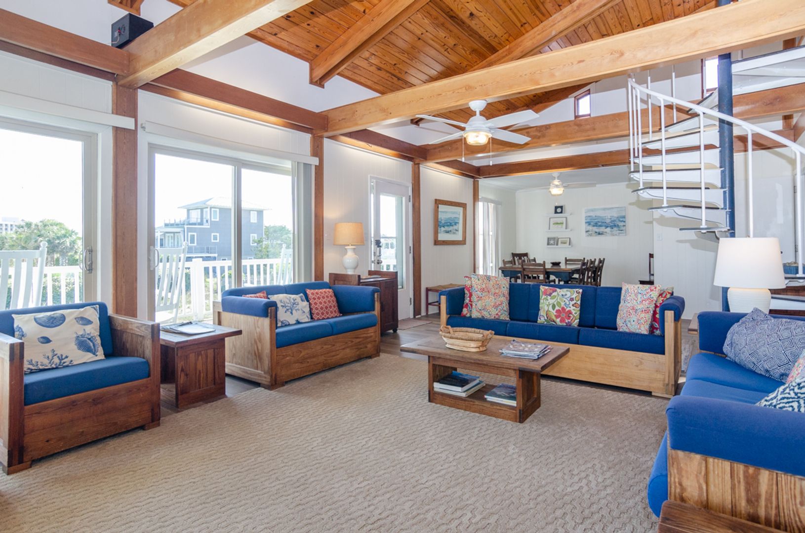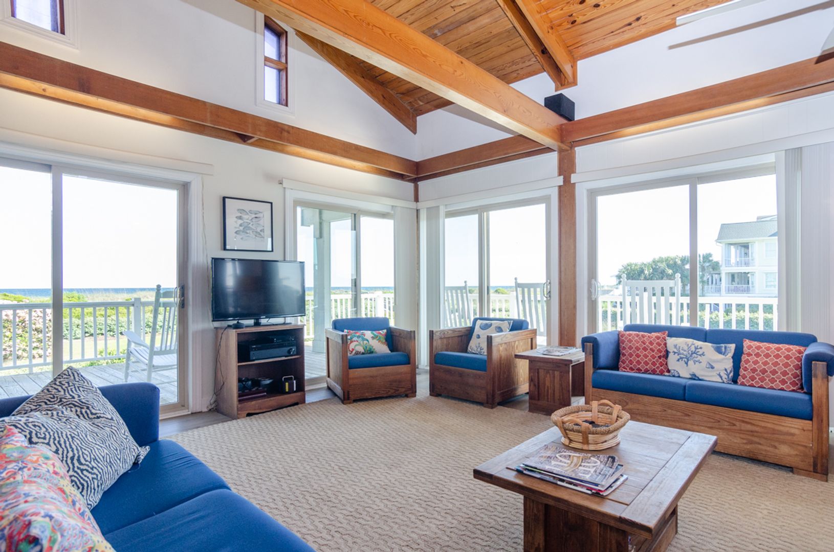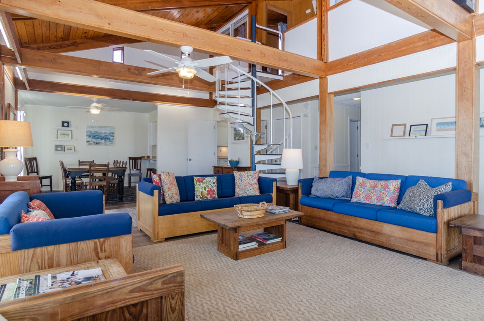 Down the hall on the main living level is a full bathroom that serves the nearby guest room that is furnished with two beds, a twin, and a queen. This guest room has a large sliding glass door that leads to the ocean side deck and offers a nice view of the ocean. The primary suite is located at the end of the hall and features a lush kind sized bed, walk in closet, dual vanity, walk in shower, and gives direct access to the wraparound porch. Wake up each morning to the waves crashing and palms blowing in the soft breeze.