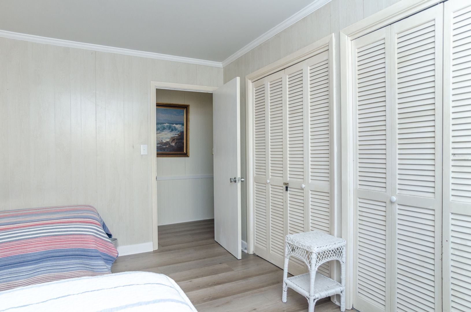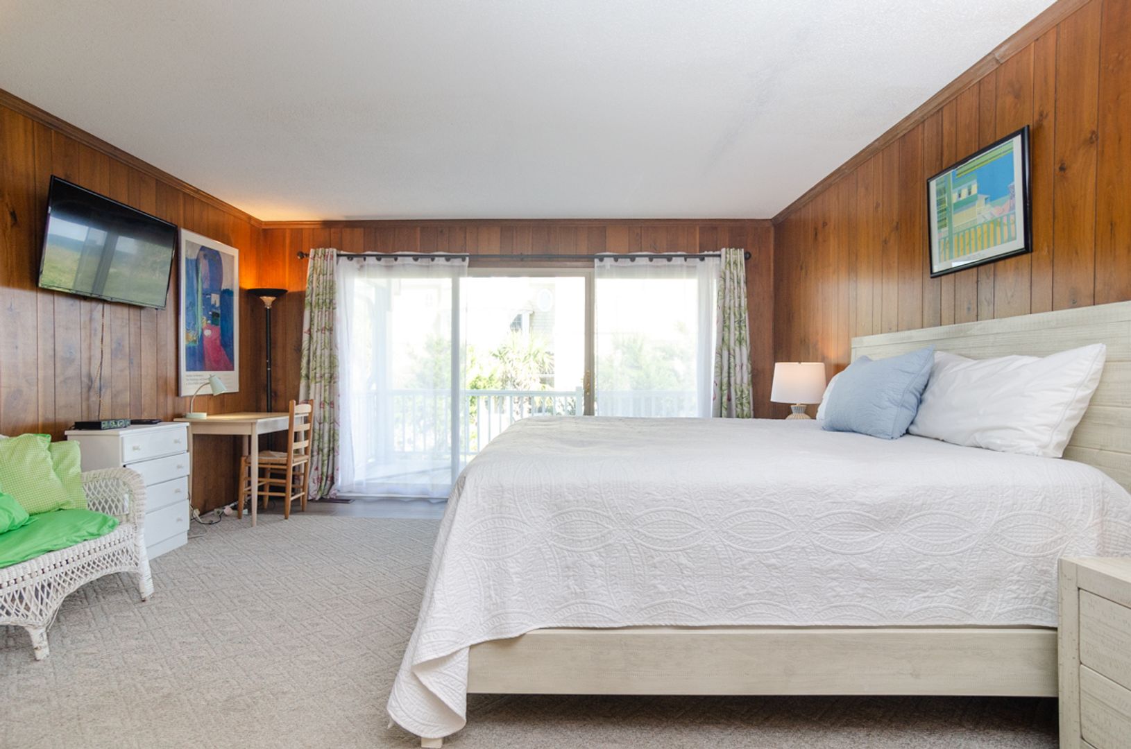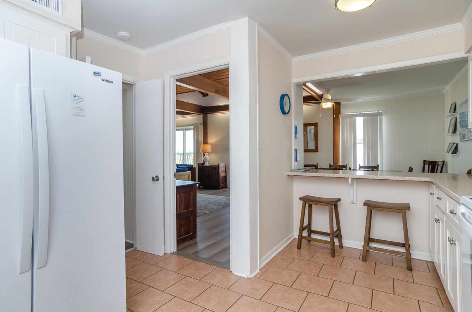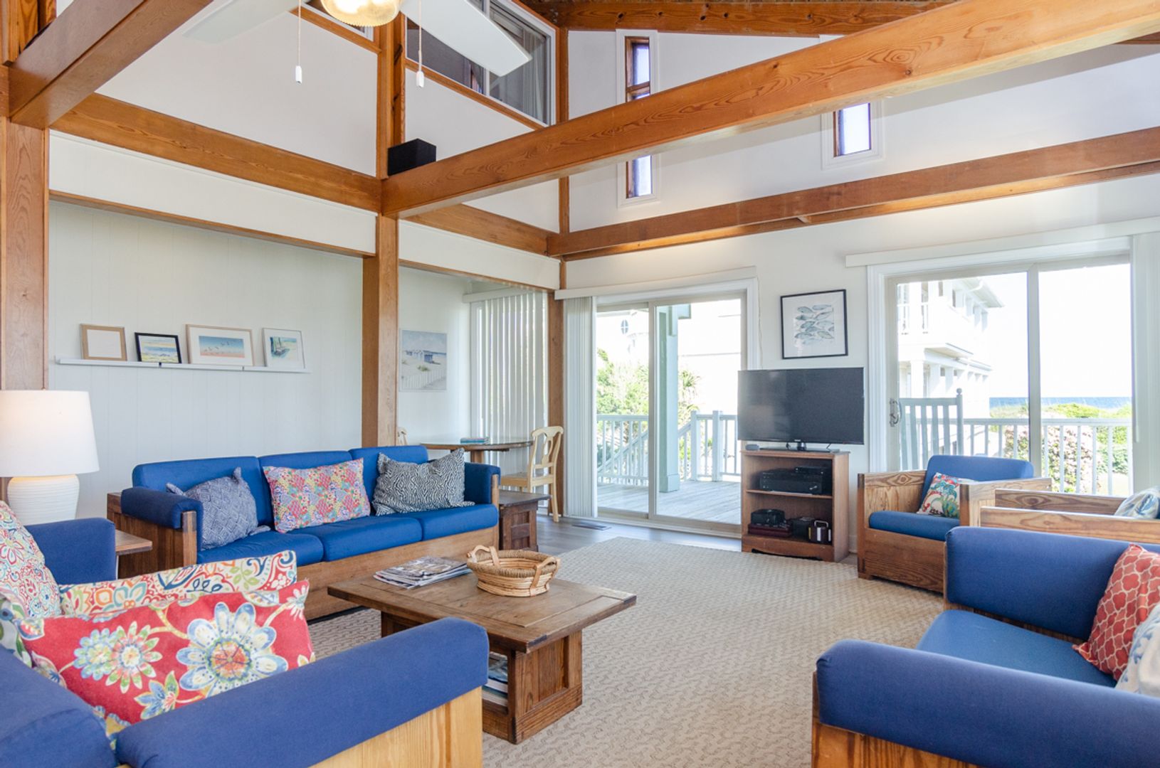 Down the hall on the main living level is a full bathroom that serves the nearby guest room that is furnished with two beds, a twin, and a queen. This guest room has a large sliding glass door that leads to the ocean side deck and offers a nice view of the ocean. The primary suite is located at the end of the hall and features a lush kind sized bed, walk in closet, dual vanity, walk in shower, and gives direct access to the wraparound porch. Wake up each morning to the waves crashing and palms blowing in the soft breeze.