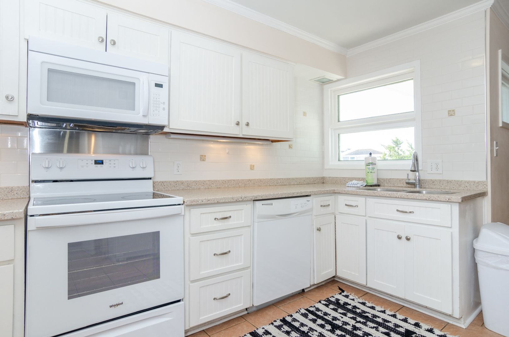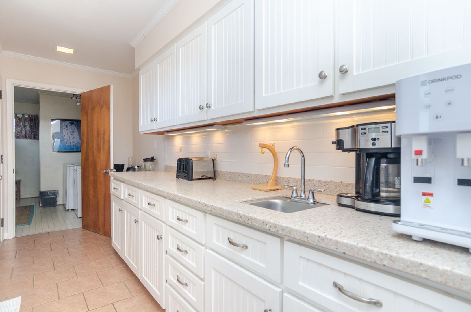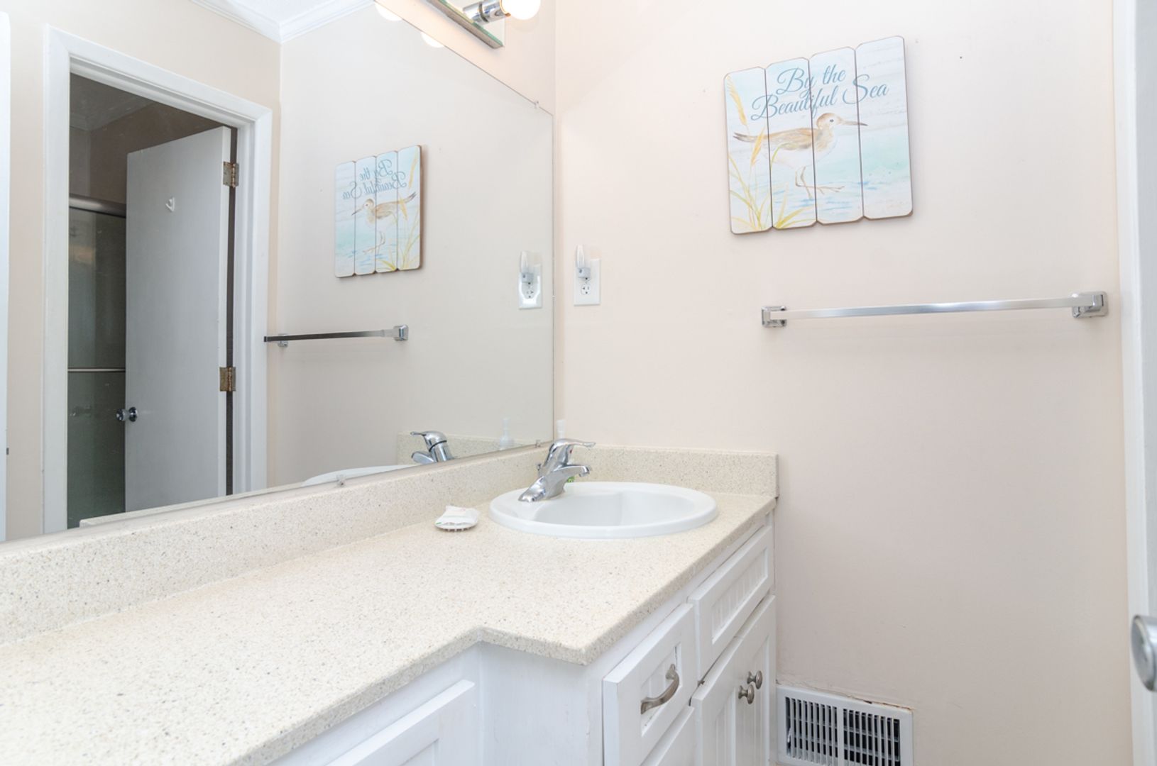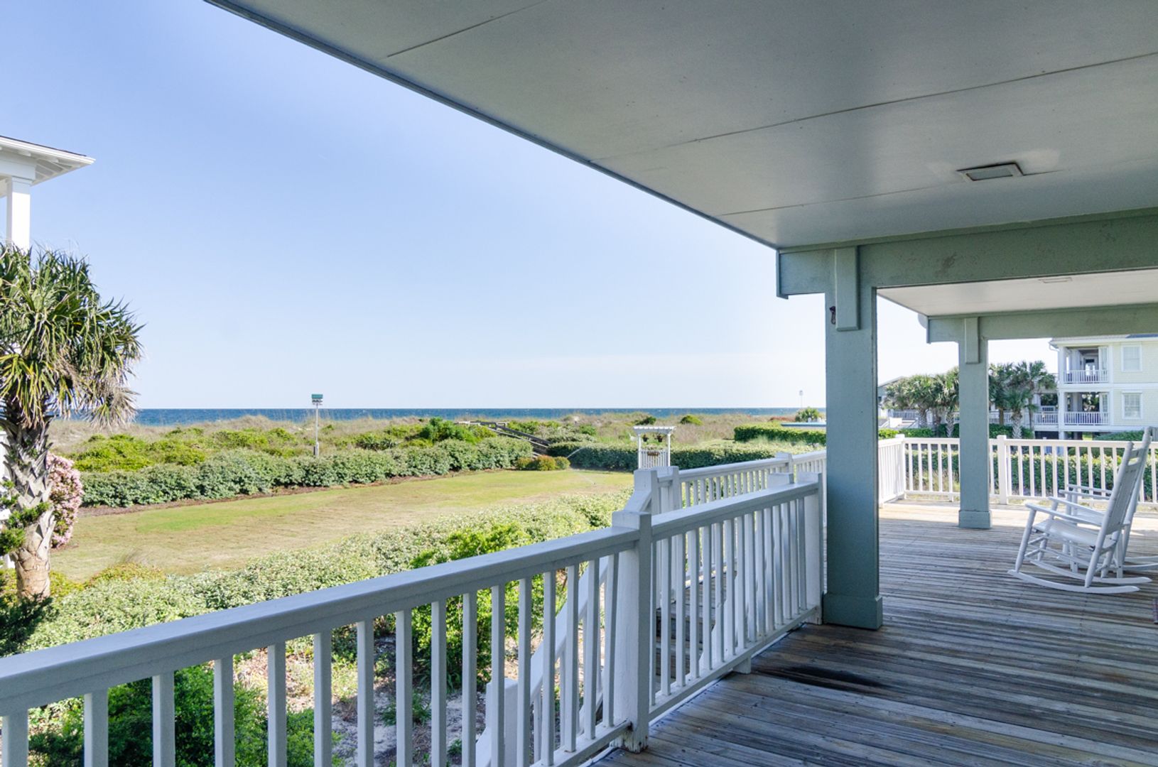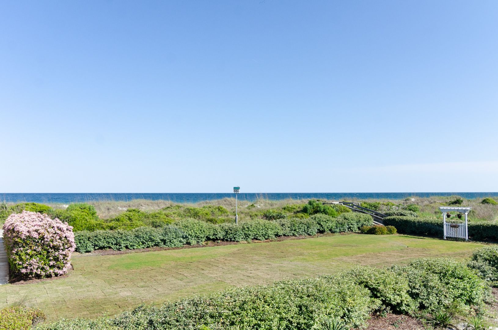Down the hall on the main living level is a full bathroom that serves the nearby guest room that is furnished with two beds, a twin, and a queen. This guest room has a large sliding glass door that leads to the ocean side deck and offers a nice view of the ocean. The primary suite is located at the end of the hall and features a lush kind sized bed, walk in closet, dual vanity, walk in shower, and gives direct access to the wraparound porch. Wake up each morning to the waves crashing and palms blowing in the soft breeze.