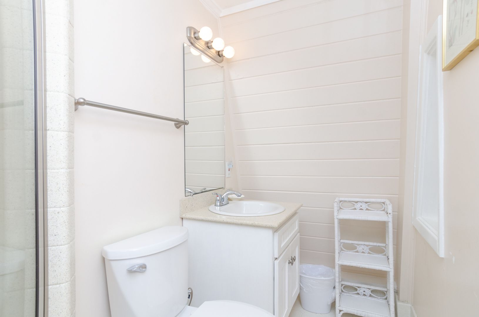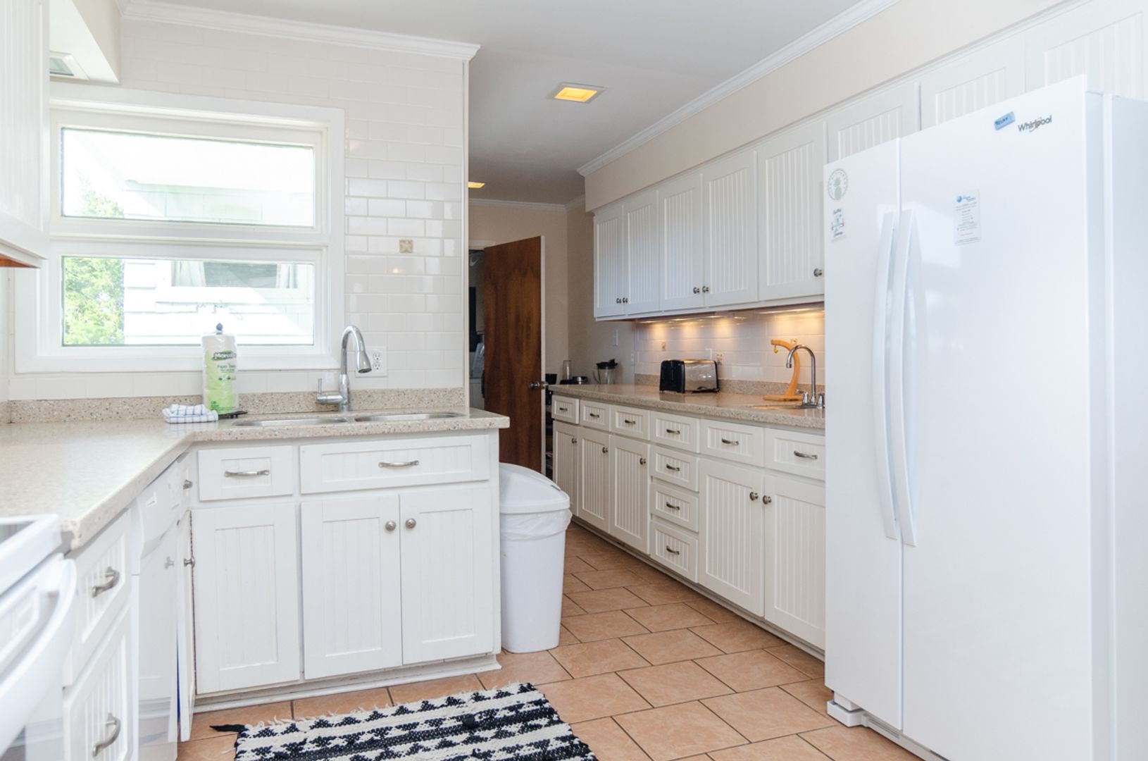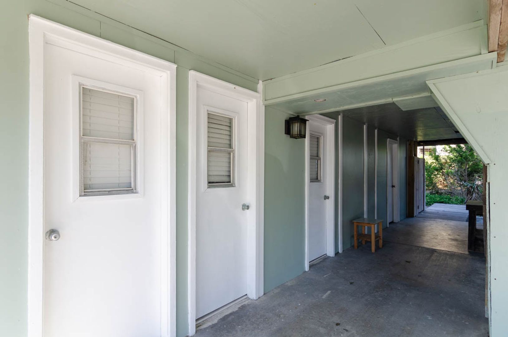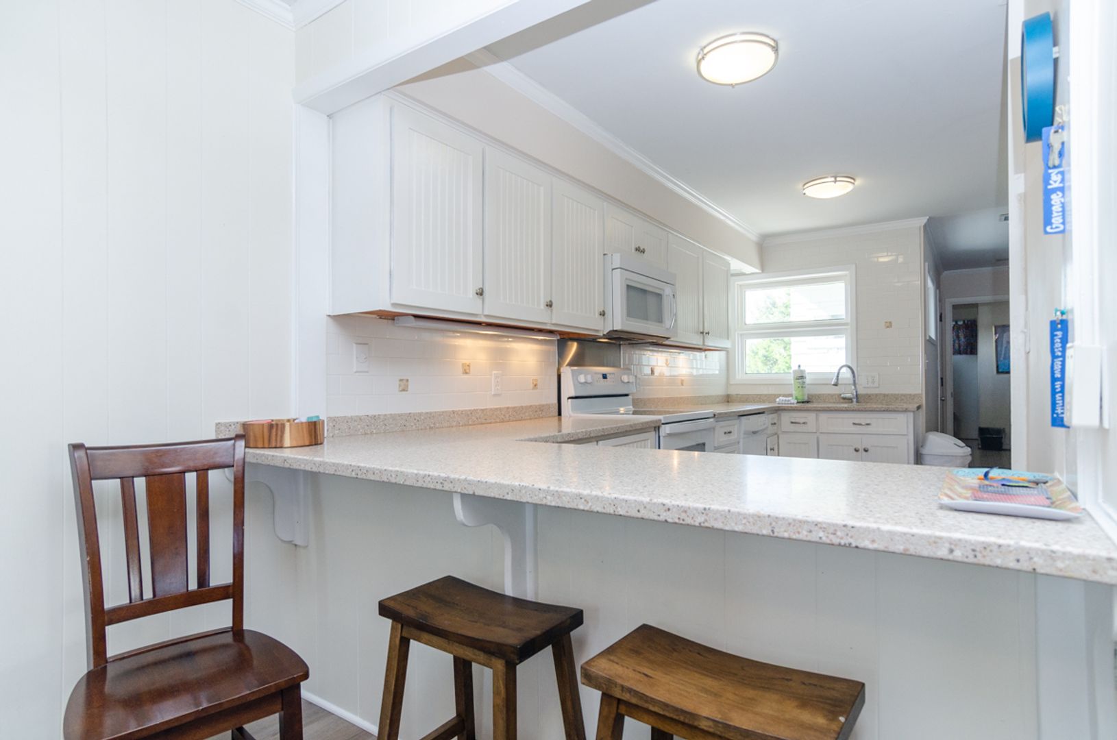 Down the hall on the main living level is a full bathroom that serves the nearby guest room that is furnished with two beds, a twin, and a queen. This guest room has a large sliding glass door that leads to the ocean side deck and offers a nice view of the ocean. The primary suite is located at the end of the hall and features a lush kind sized bed, walk in closet, dual vanity, walk in shower, and gives direct access to the wraparound porch. Wake up each morning to the waves crashing and palms blowing in the soft breeze.