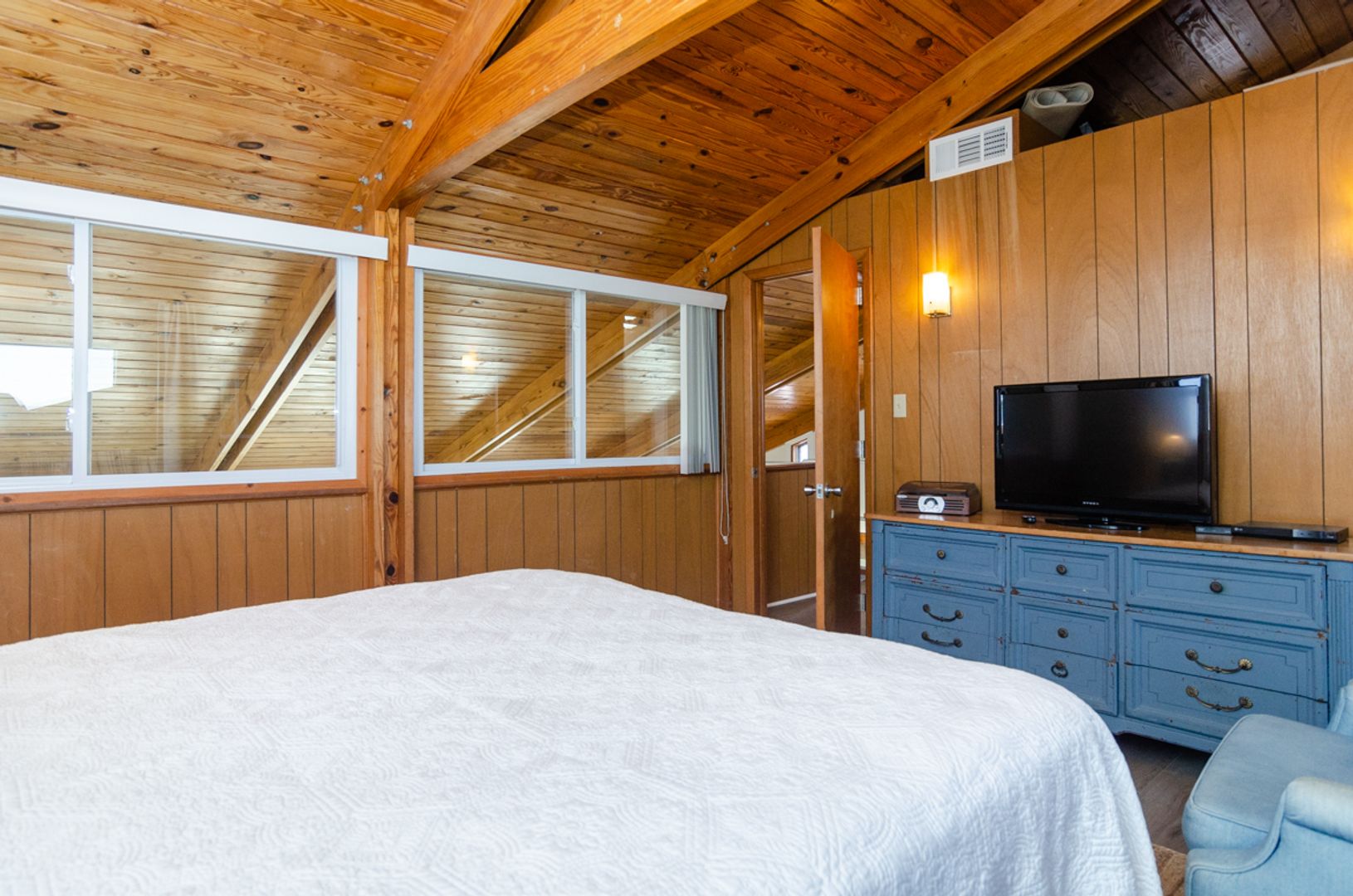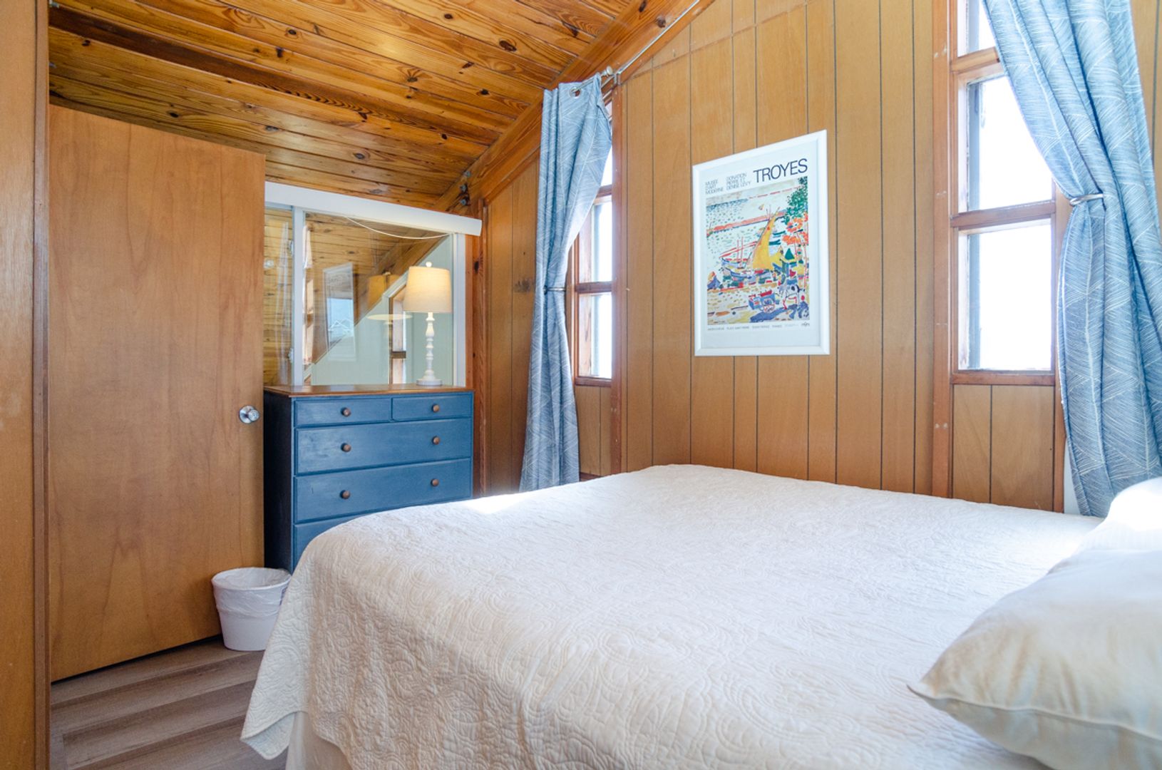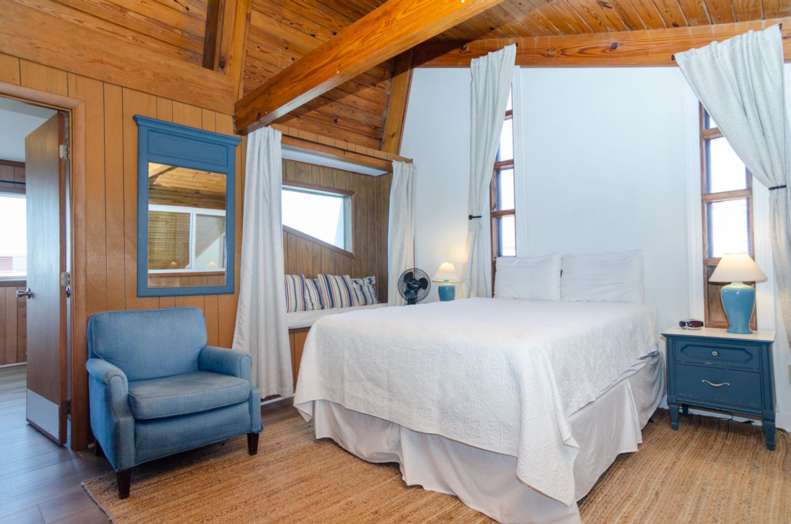 A spiral staircase located in the living room gives this home unique character and leads to the top floor where there are three additional bedrooms. At the top of the stairs, you will find a full bathroom complete with a walk-in shower. This bathroom serves the upstairs bedrooms. To your left is a guest room with a queen-size bed and built-in seating. This bedroom overlooks the main living area below and features some very eye-catching angles designed by the architect. To the right of the stairs there is a second guest bedroom with a queen bed that is framed by a series of windows that make the room feel bright and airy. This guest room also overlooks the living area below and directly leads to the third bedroom which provides a full bed. The full bedroom directly connects to the queen guest room.