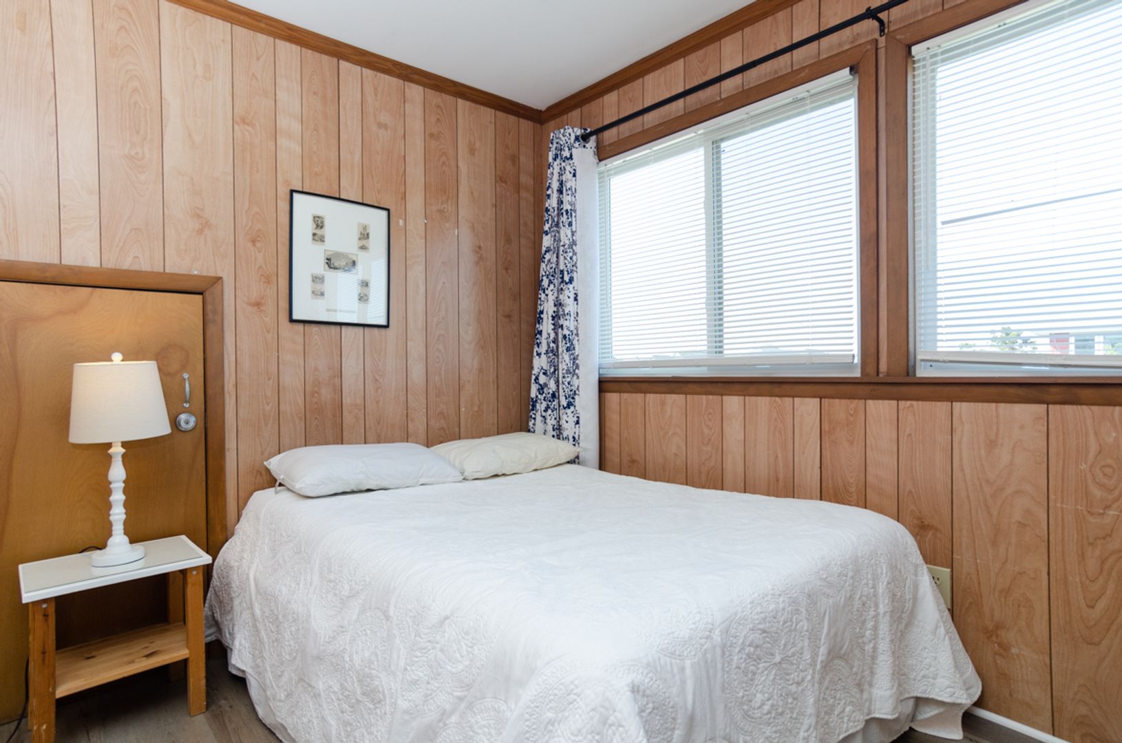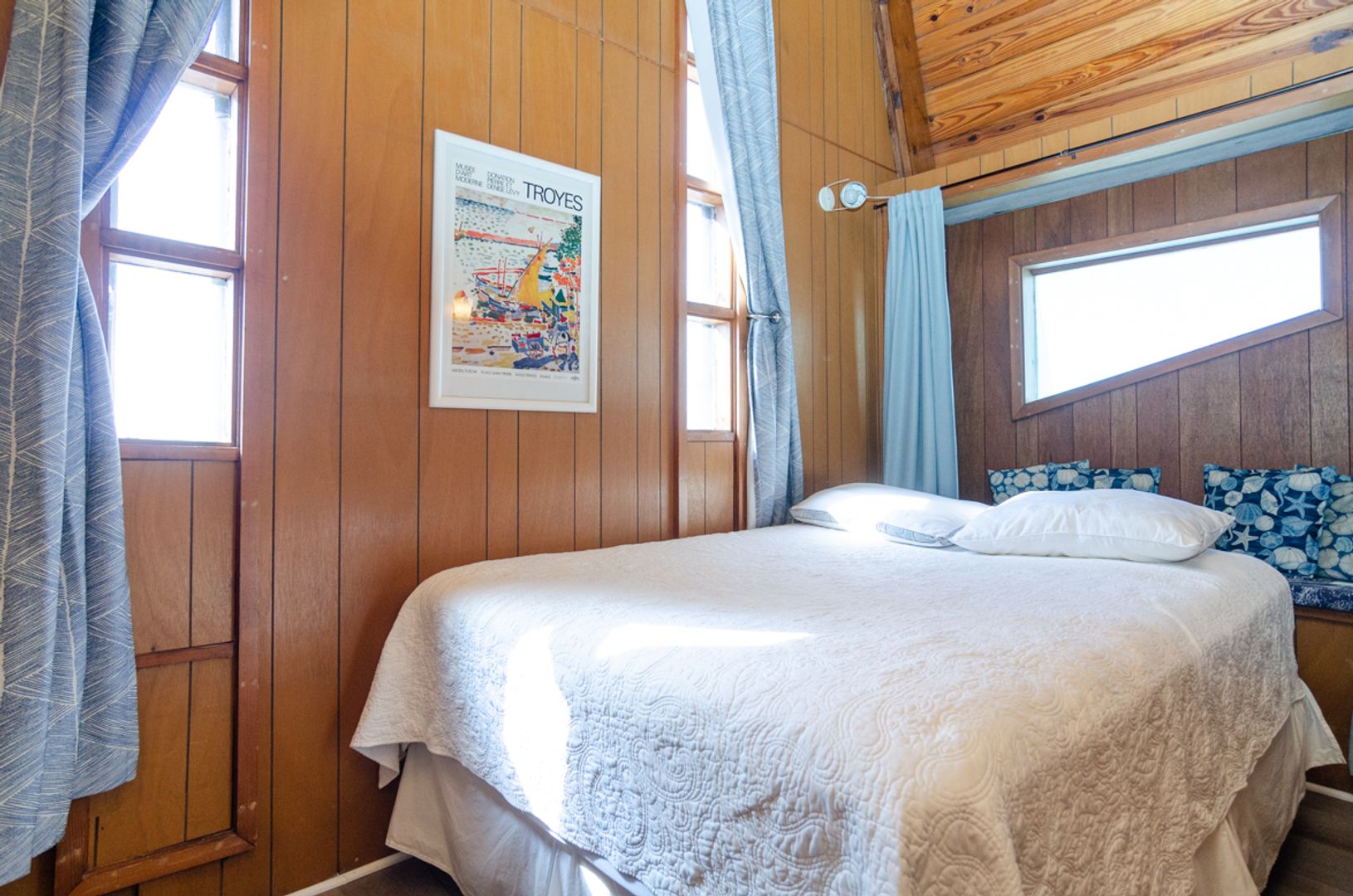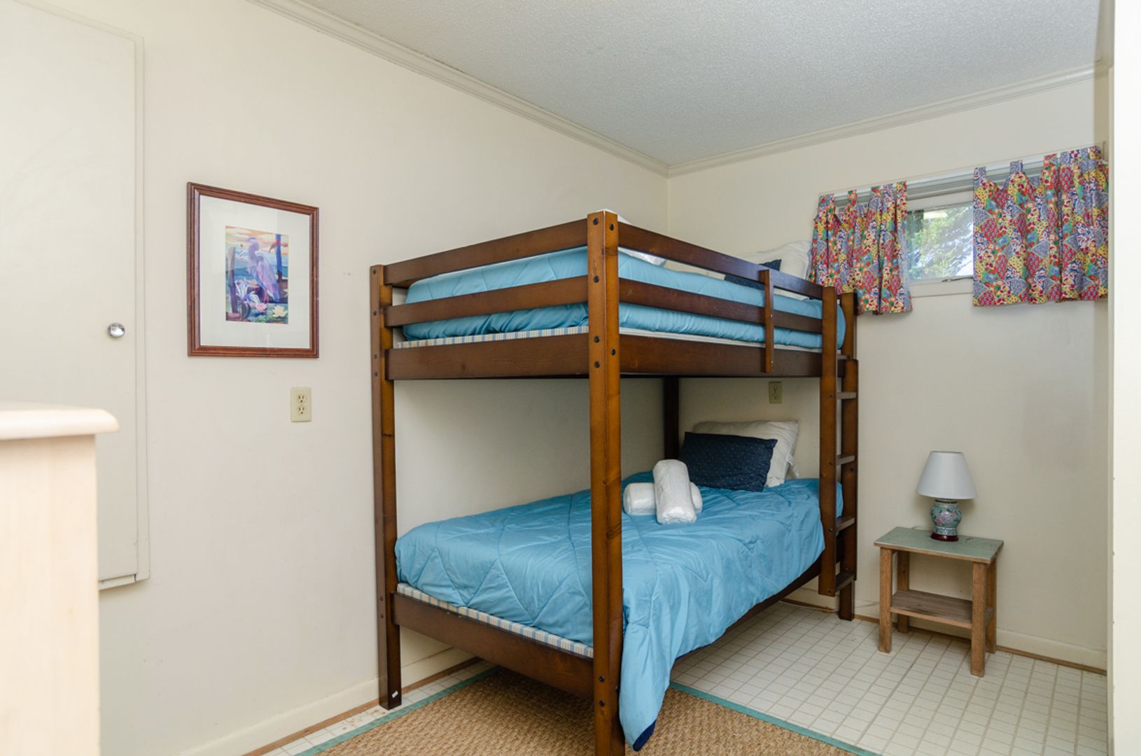 A spiral staircase located in the living room gives this home unique character and leads to the top floor where there are three additional bedrooms. At the top of the stairs, you will find a full bathroom complete with a walk-in shower. This bathroom serves the upstairs bedrooms. To your left is a guest room with a queen-size bed and built-in seating. This bedroom overlooks the main living area below and features some very eye-catching angles designed by the architect. To the right of the stairs there is a second guest bedroom with a queen bed that is framed by a series of windows that make the room feel bright and airy. This guest room also overlooks the living area below and directly leads to the third bedroom which provides a full bed. The full bedroom directly connects to the queen guest room.