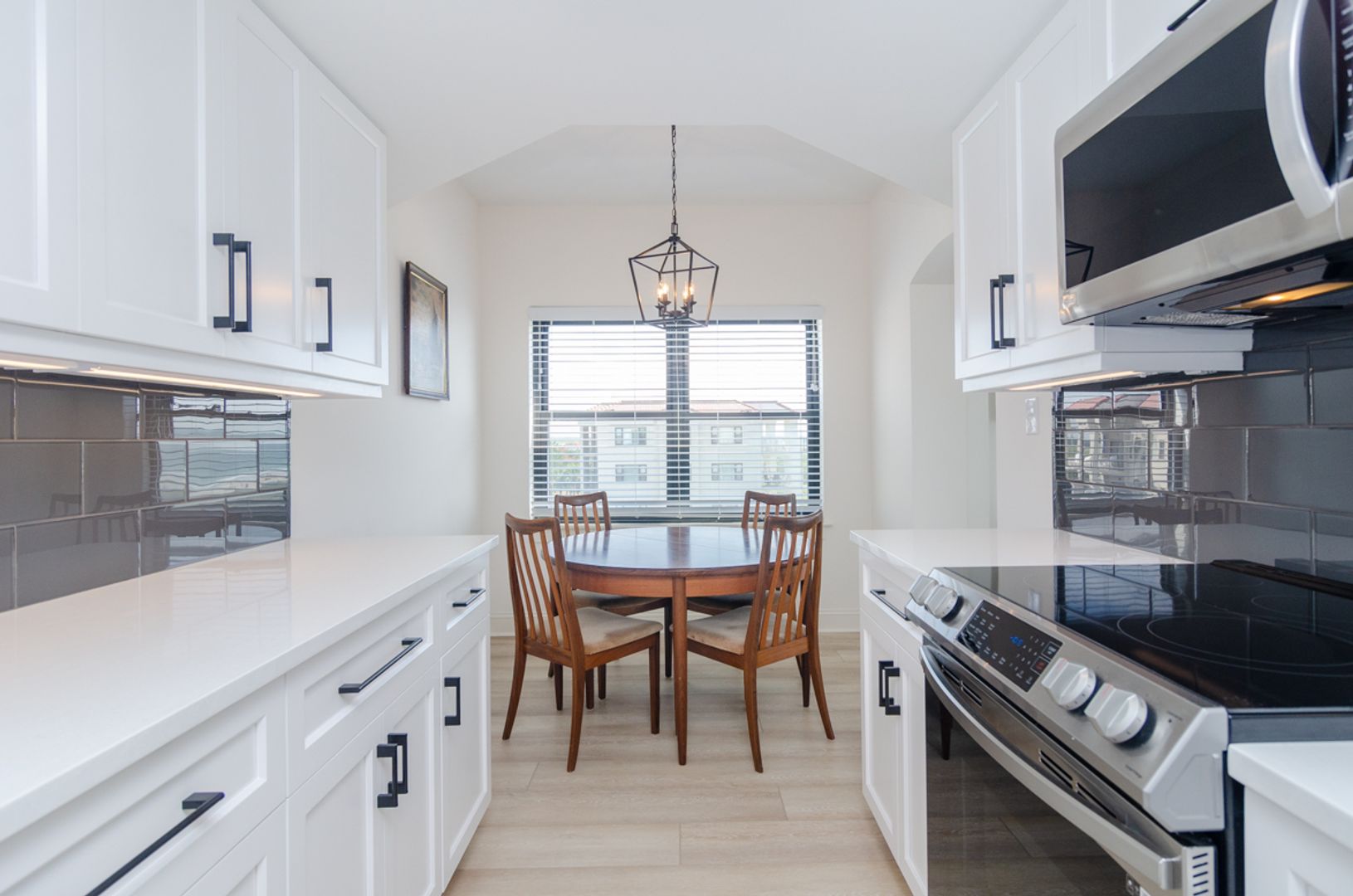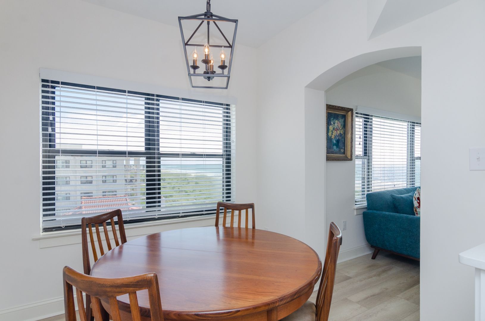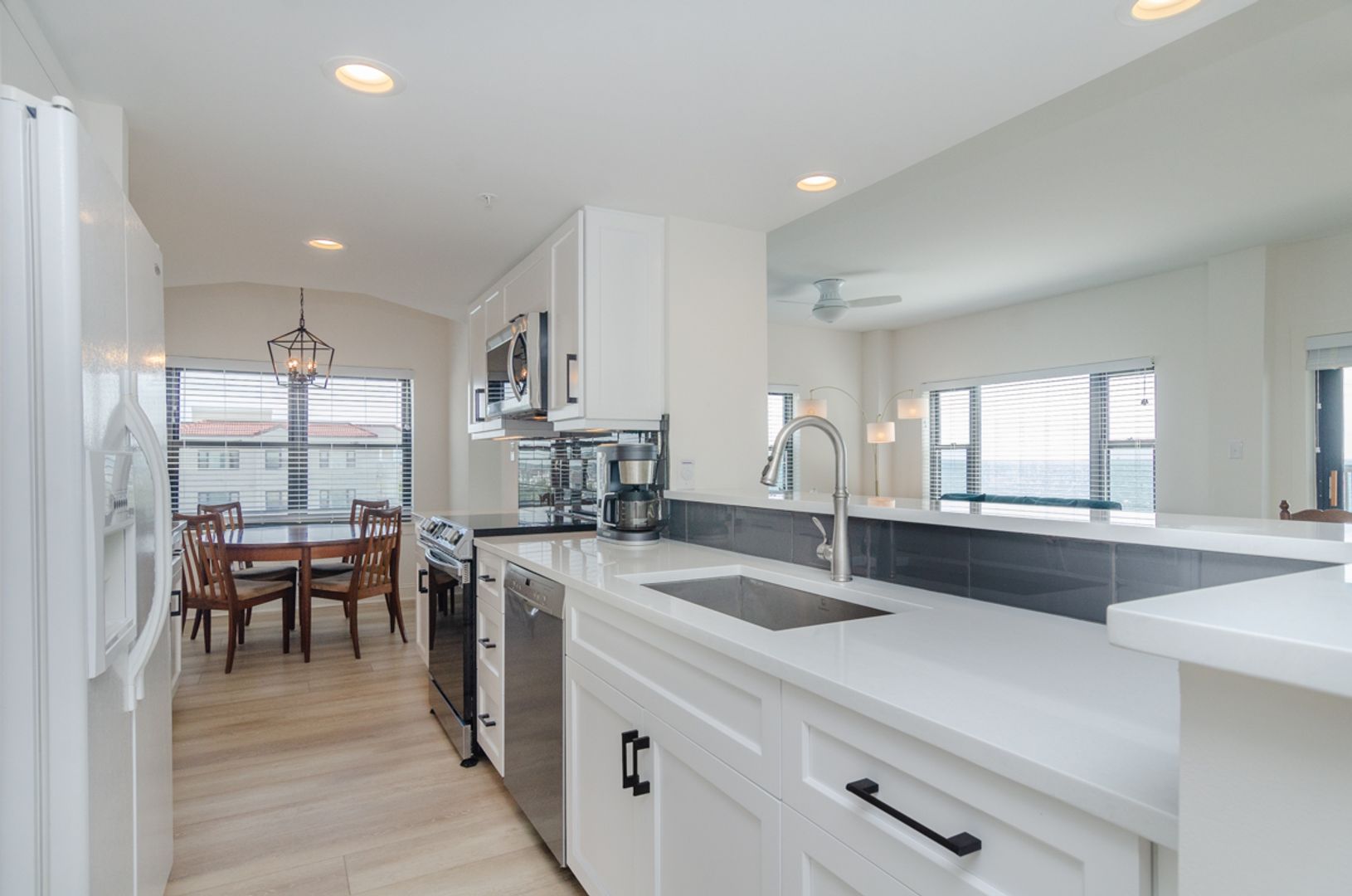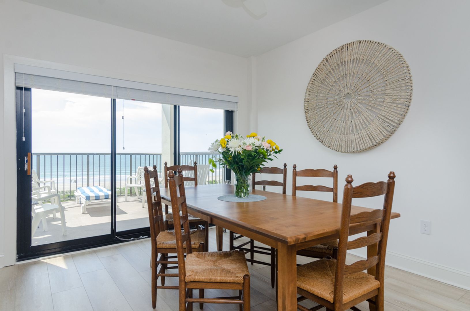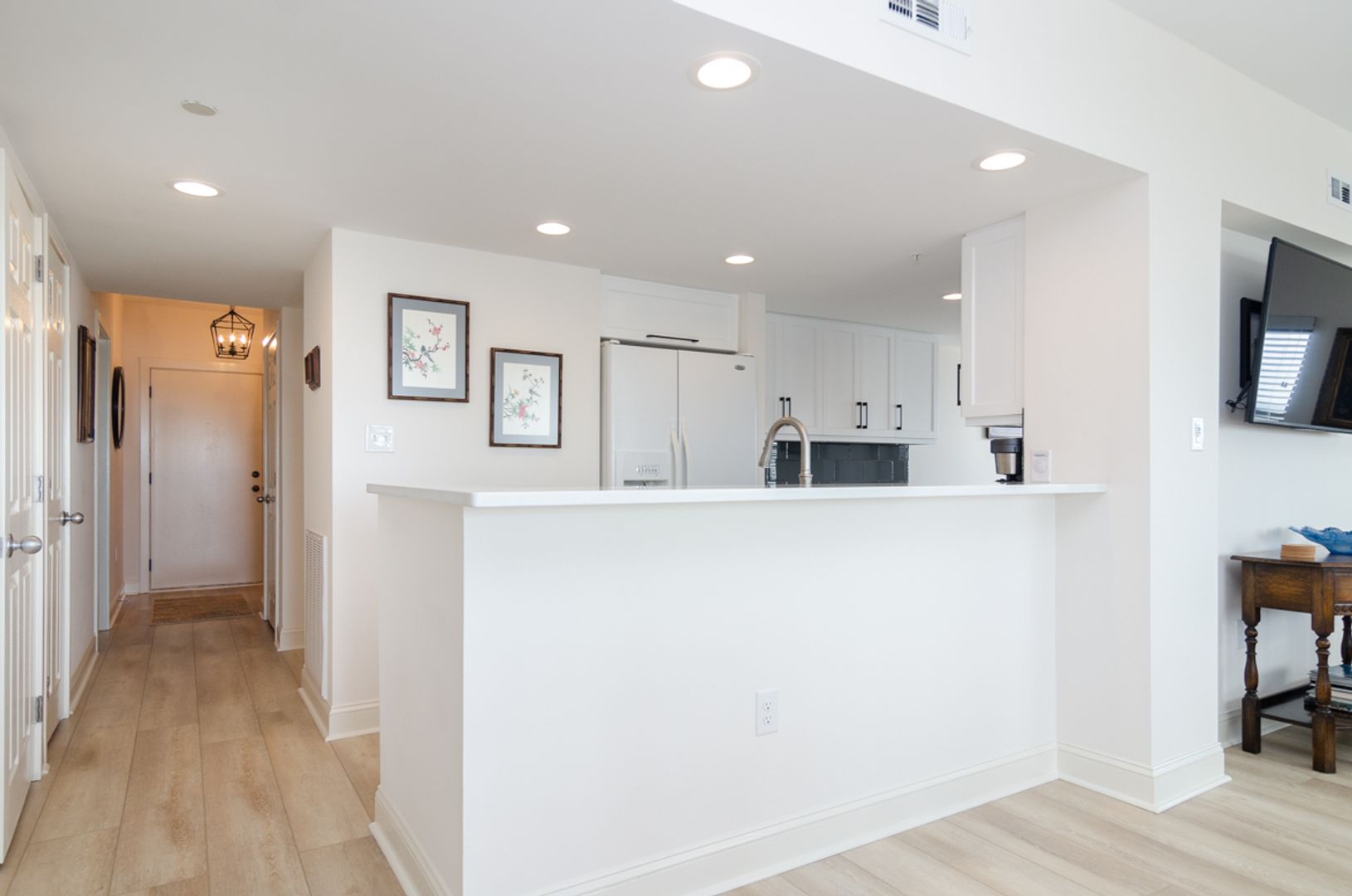 Located on the secluded northern end of Wrightsville Beach this property has access to all the wonderful amenities that Duneridge Resort offers, including breathtaking views of the Atlantic Ocean from your private porch! As you enter this lovely condo, the foyer invites you down the hallway that leads to a spectacular ocean view. A large sliding glass door leads you to the spacious horseshoe balcony and provides endless views of the Atlantic. The deck is the perfect place to relax in the salt air and take in the fresh breeze while sipping your morning coffee. The spacious living area provides two stylish and comfy sofas, a smart TV, and a large dining table for family meals. A galley kitchen gives easy access to the living and dining room. Enjoy cooking meals in the beautifully remodeled kitchen or have a quiet breakfast in the dining nook.