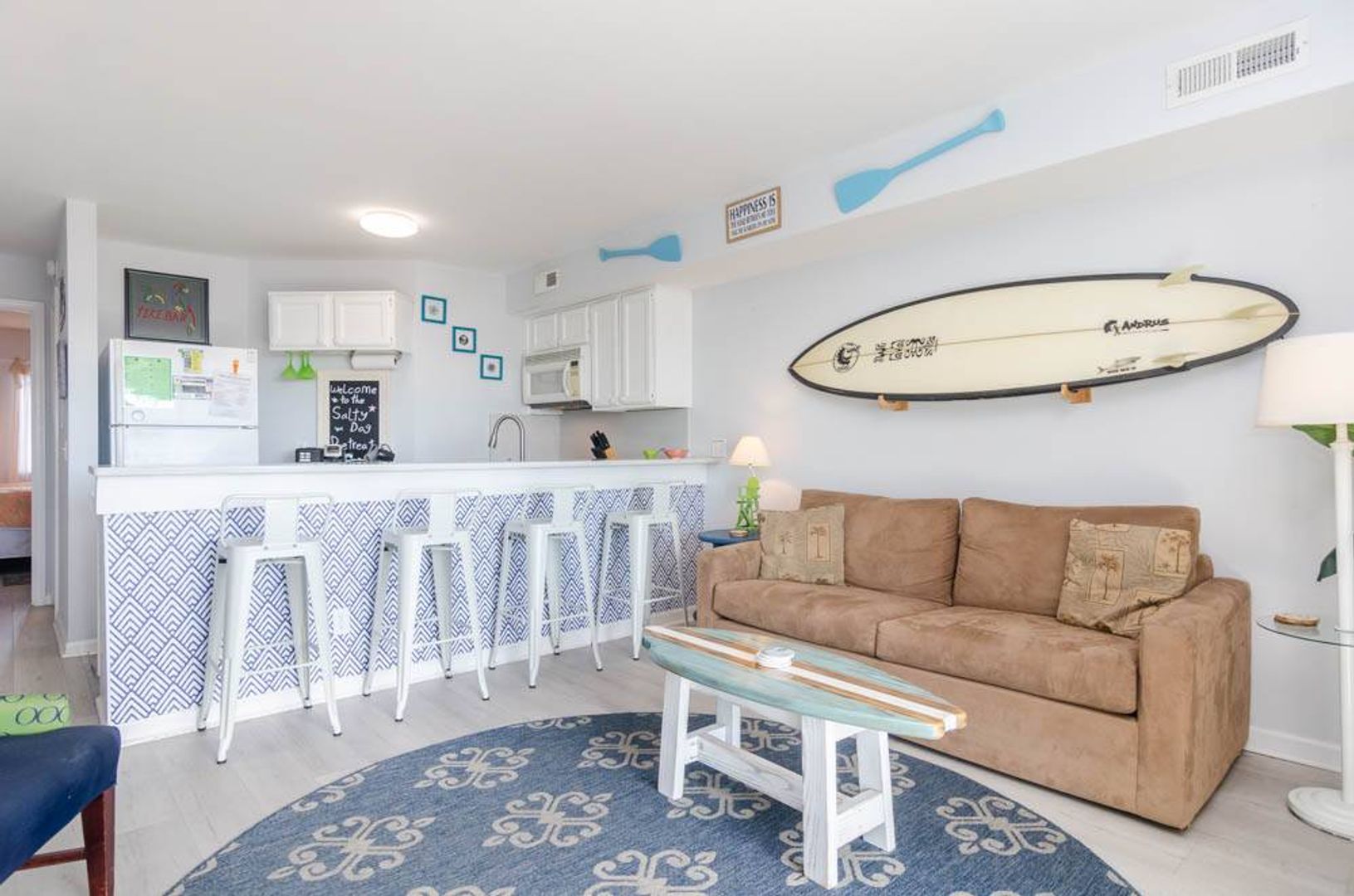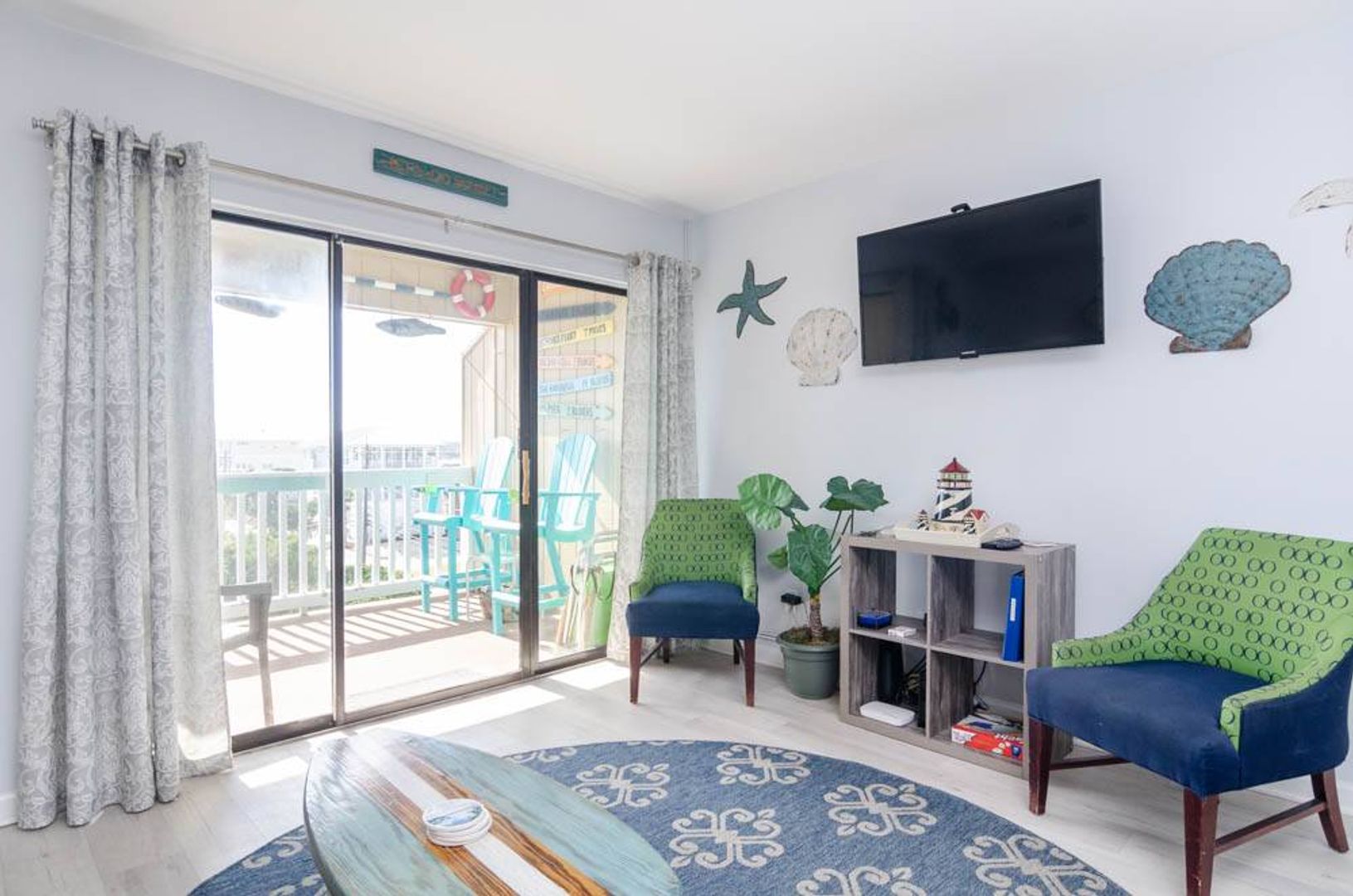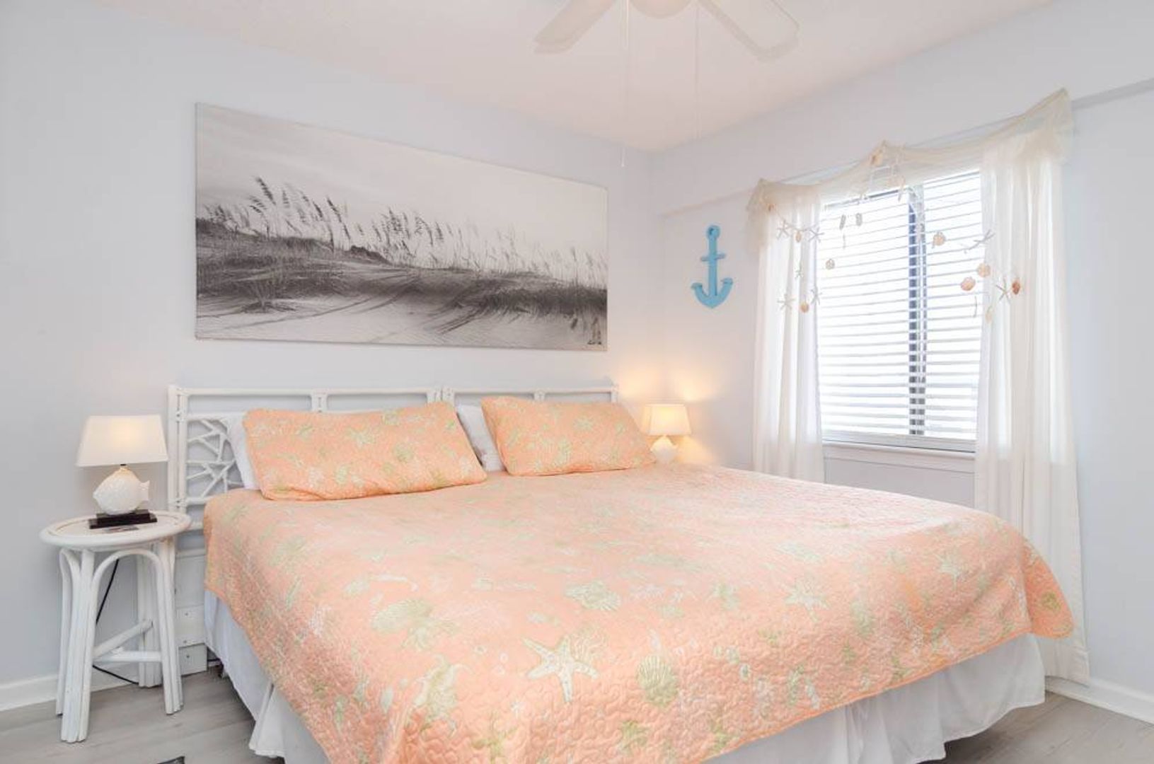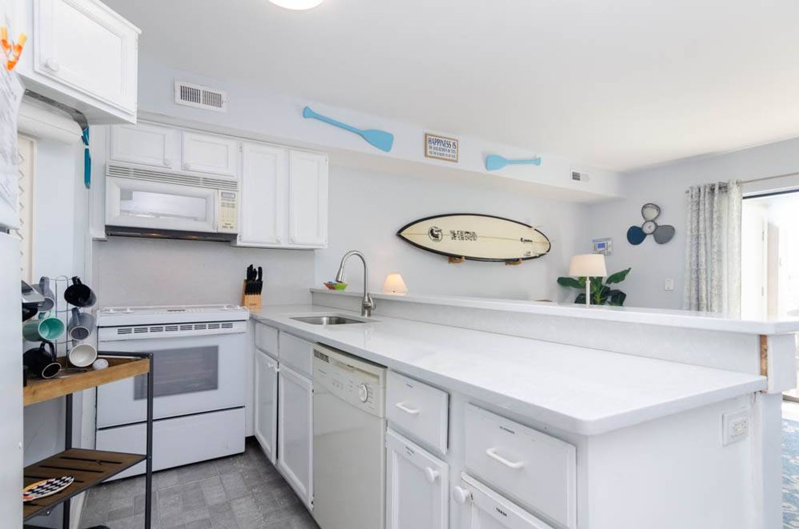 Newly remodeled with LVP flooring throughout and stunning new kitchen countertops, this quaint third (top) floor condo will beckon you home after a relaxing day on the beach or fishing from the pier. There's a King bed in the primary bedroom, and a Queen sleeper soda in the living area. Maybe best of all, this little gem has a bath and a half! We've even included a Twin roll away just in case you need sleeping for 5. The kitchen is well equipped for the meals you make at home.
