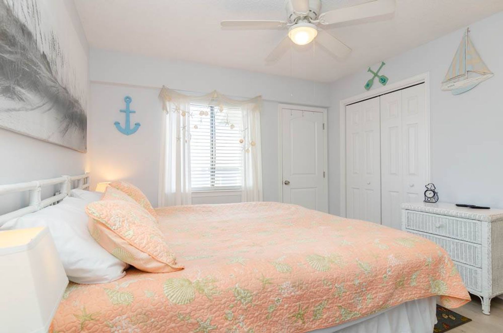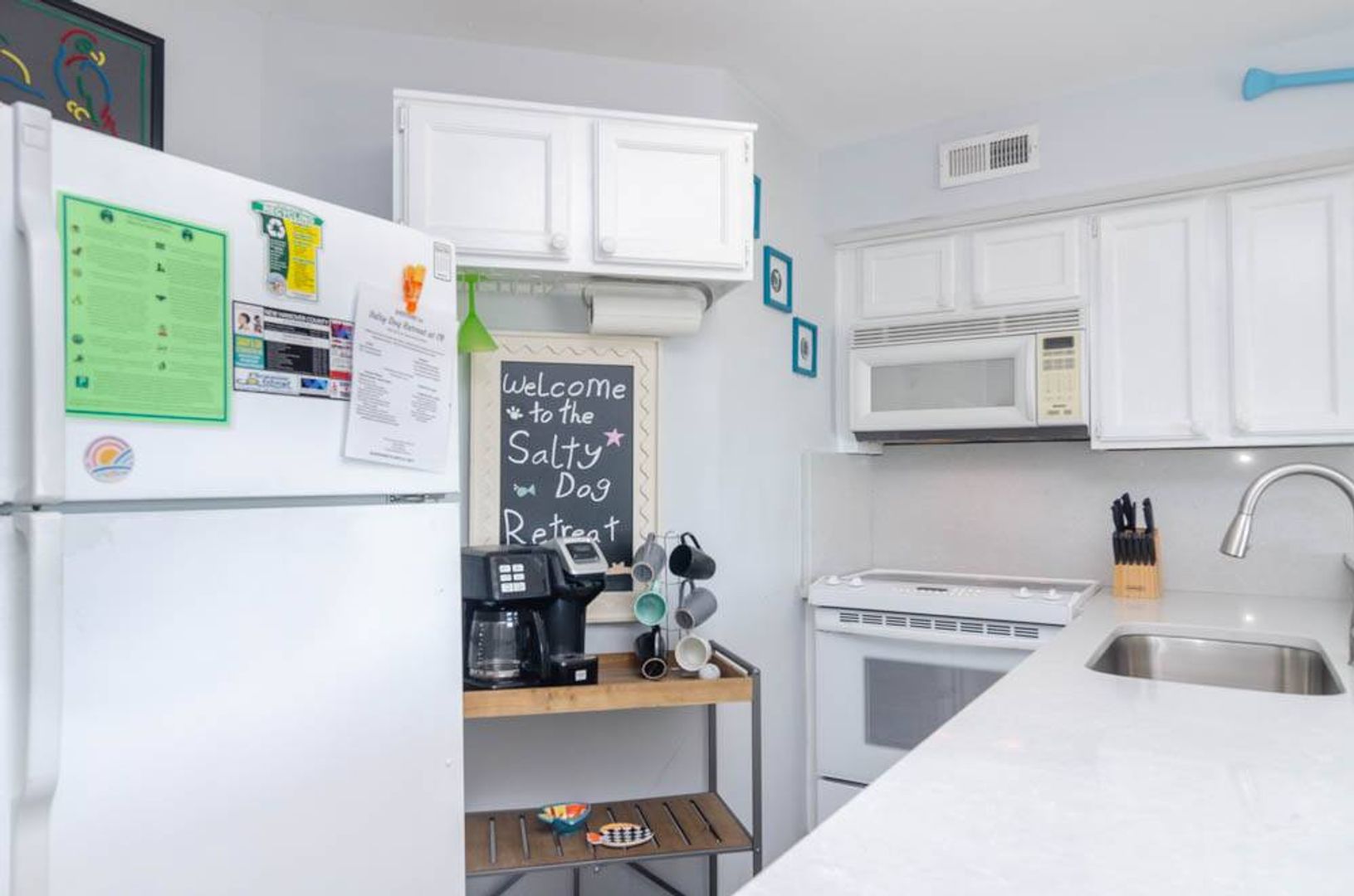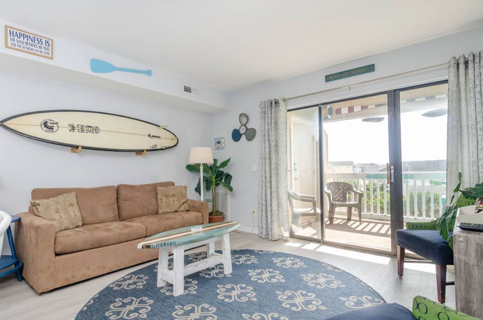 Newly remodeled with LVP flooring throughout and stunning new kitchen countertops, this quaint third (top) floor condo will beckon you home after a relaxing day on the beach or fishing from the pier. There's a King bed in the primary bedroom, and a Queen sleeper soda in the living area. Maybe best of all, this little gem has a bath and a half! We've even included a Twin roll away just in case you need sleeping for 5. The kitchen is well equipped for the meals you make at home.