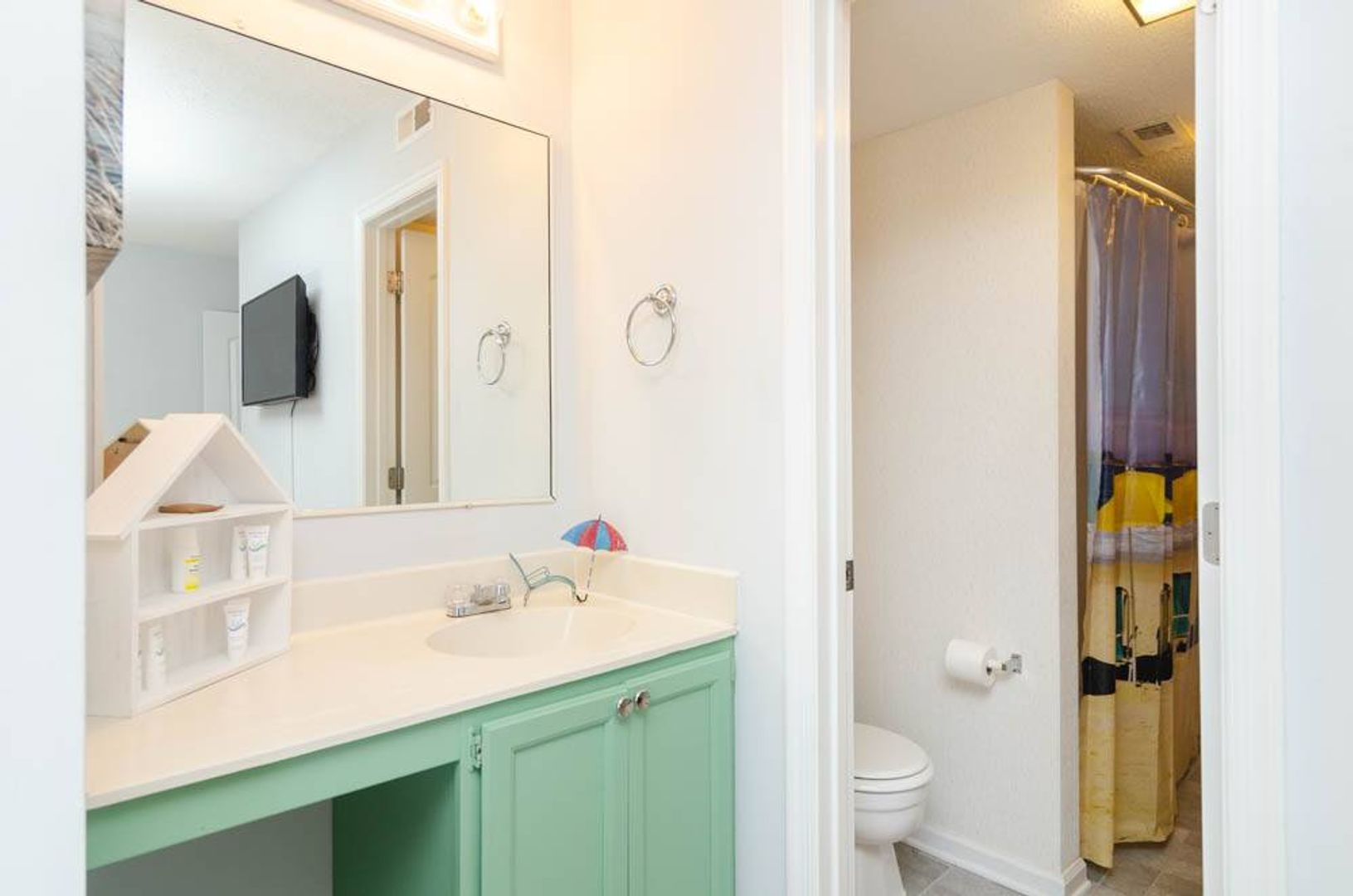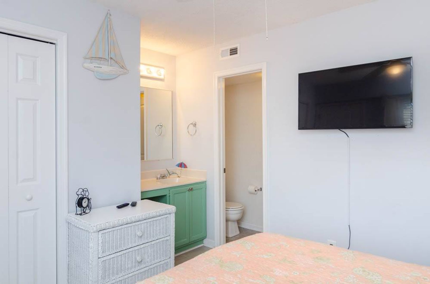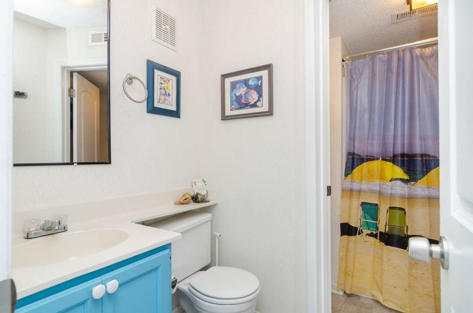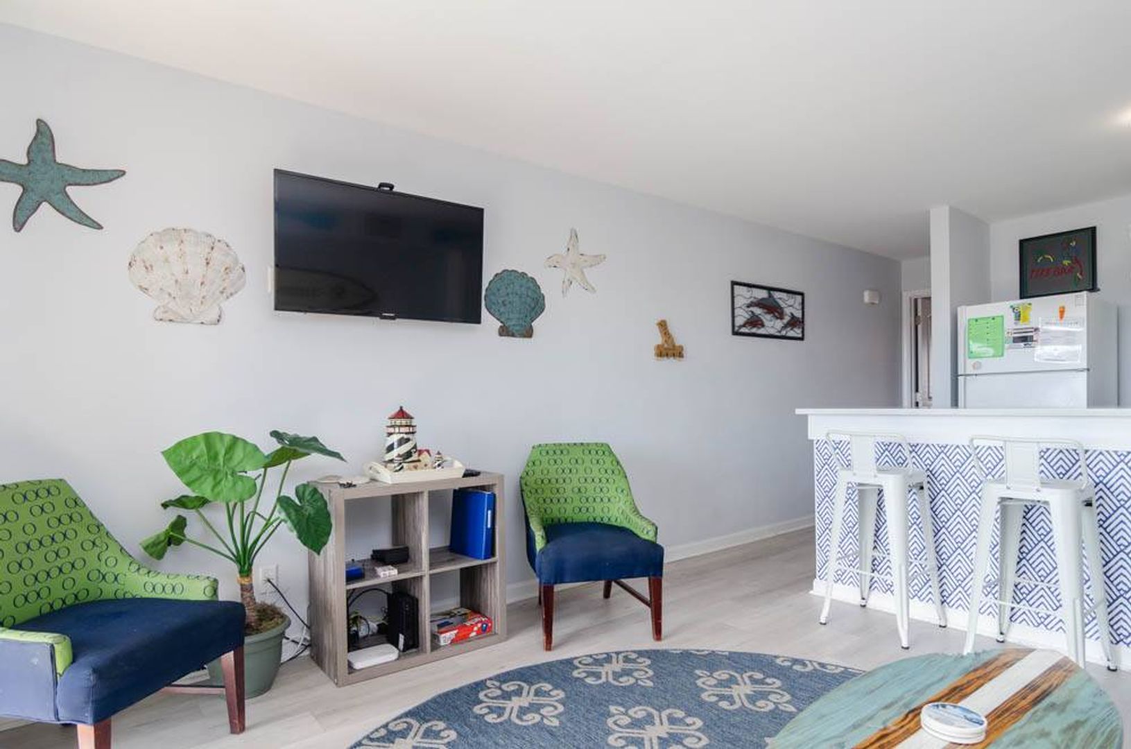 Newly remodeled with LVP flooring throughout and stunning new kitchen countertops, this quaint third (top) floor condo will beckon you home after a relaxing day on the beach or fishing from the pier. There's a King bed in the primary bedroom, and a Queen sleeper soda in the living area. Maybe best of all, this little gem has a bath and a half! We've even included a Twin roll away just in case you need sleeping for 5. The kitchen is well equipped for the meals you make at home.