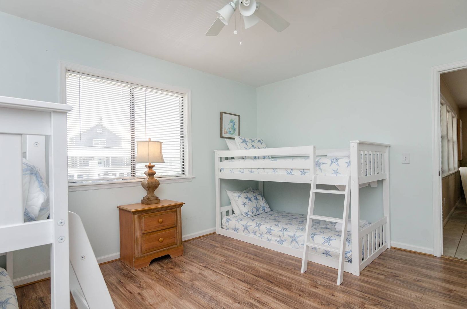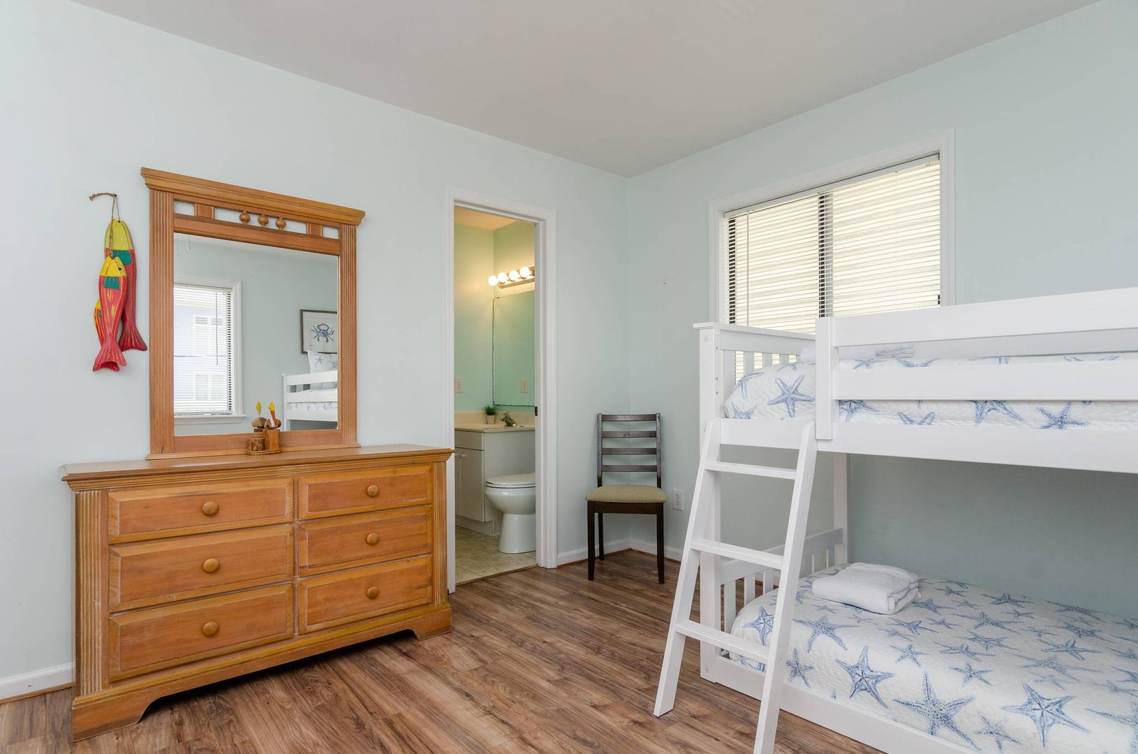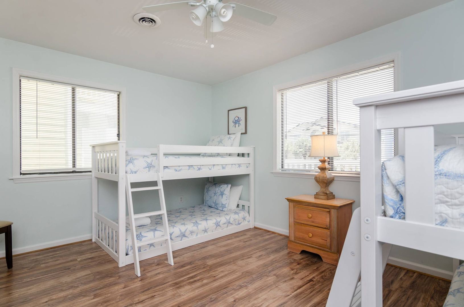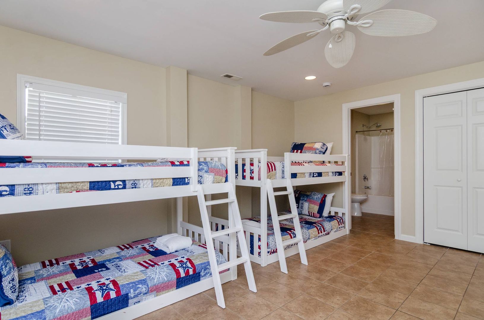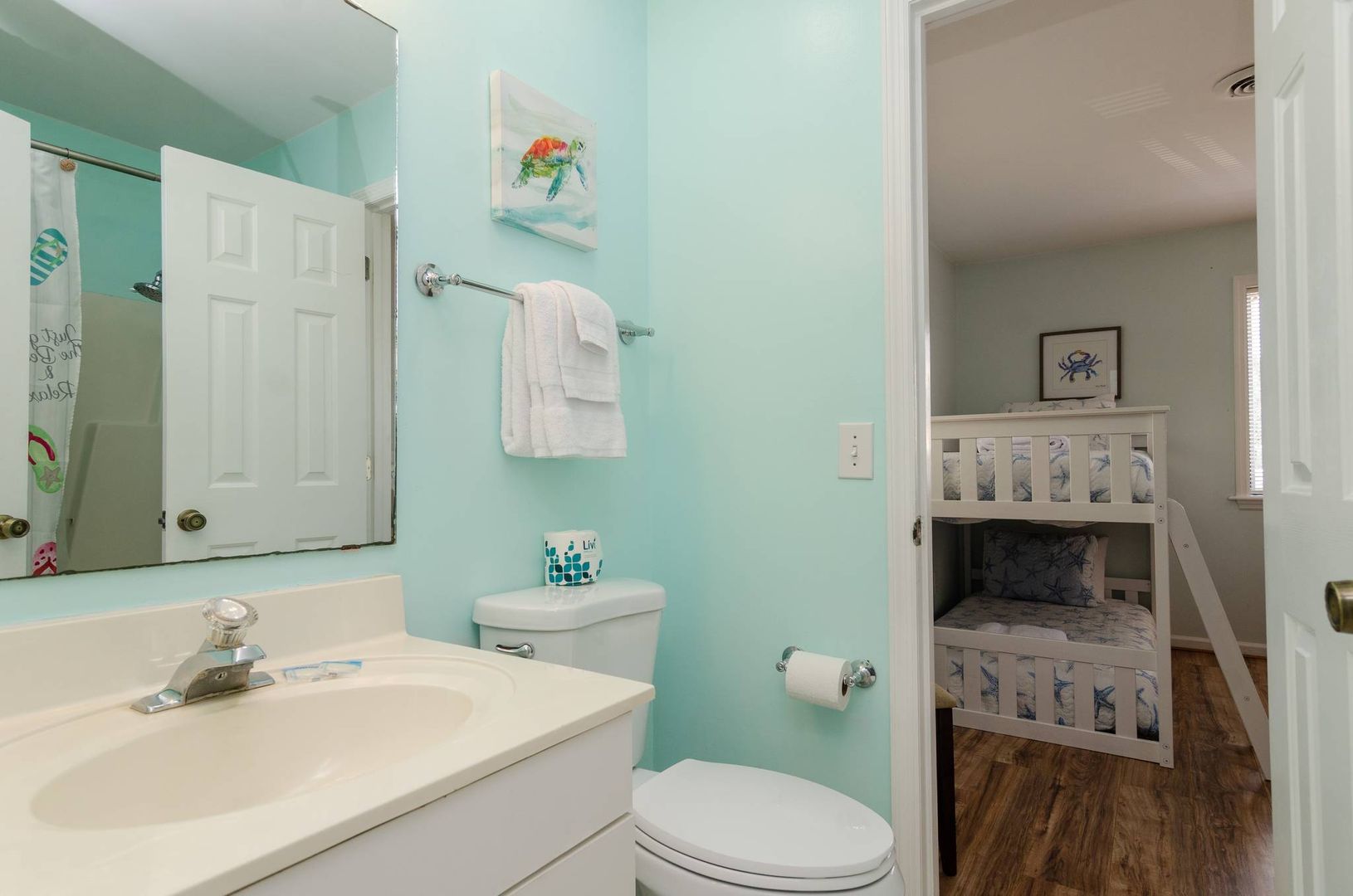 As you arrive, the bright exterior and welcoming front porch instantly set the tone for a memorable stay. Step inside the lower level to find an expansive open-concept great room with comfortable seating, warm coastal decor, and soft natural light. The newly updated kitchen is well-equipped with everything you need to prepare family meals—from quick breakfasts before a beach day to home cooked family meals. This level is home to two bedrooms: a lovely queen guest room with an en suite bathroom, and a cheerful bunk room featuring two sets of twin-size bunks. Designed with children in mind, the bunks sit low to the ground for added safety and comfort—perfect for young guests transitioning to their own sleep space. The bunk room also has its own full bathroom with a shower/tub combo and access to the rear patios where you can enjoy the shade, play games, or sip a cool drink in the ocean breeze.