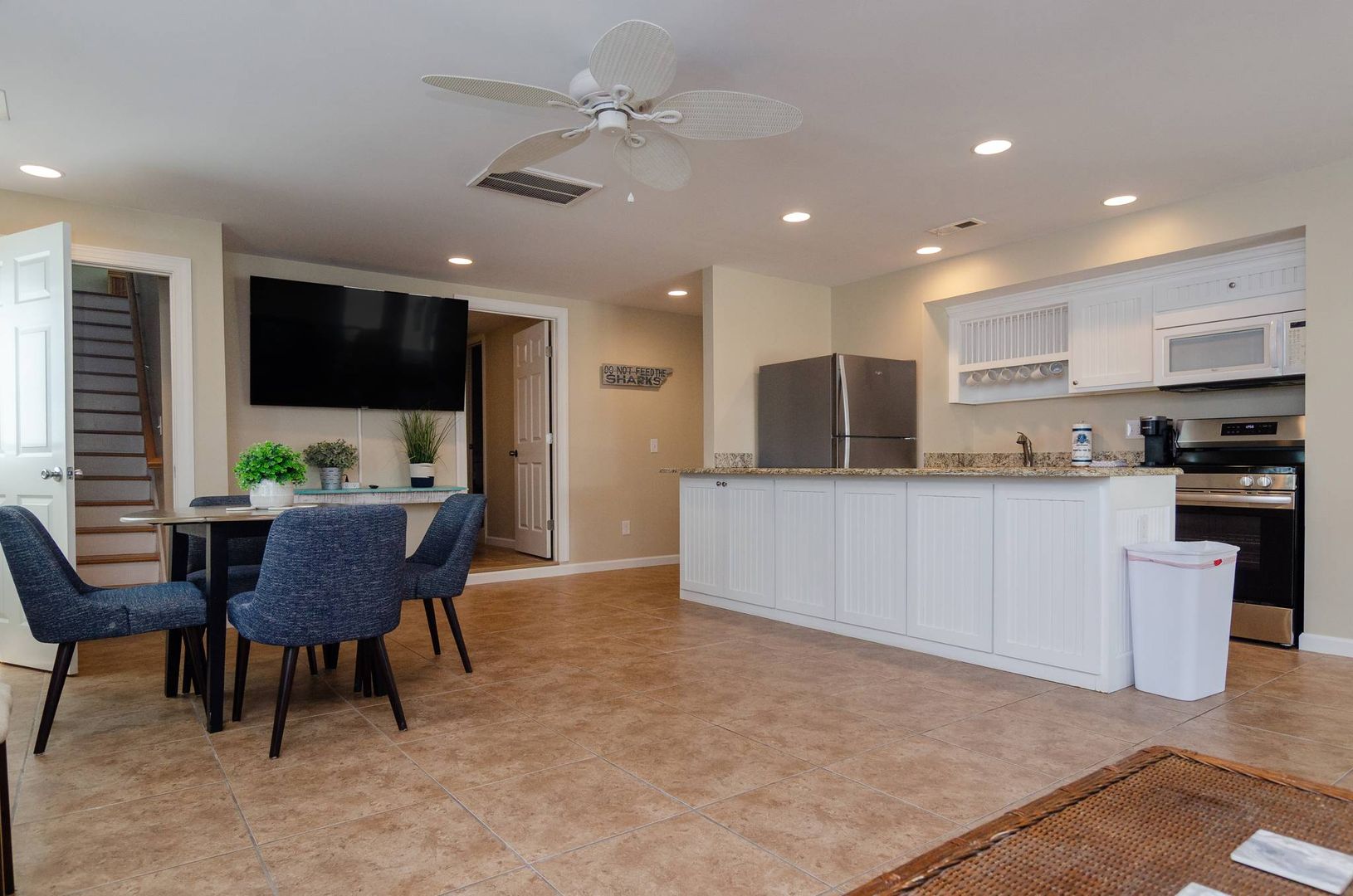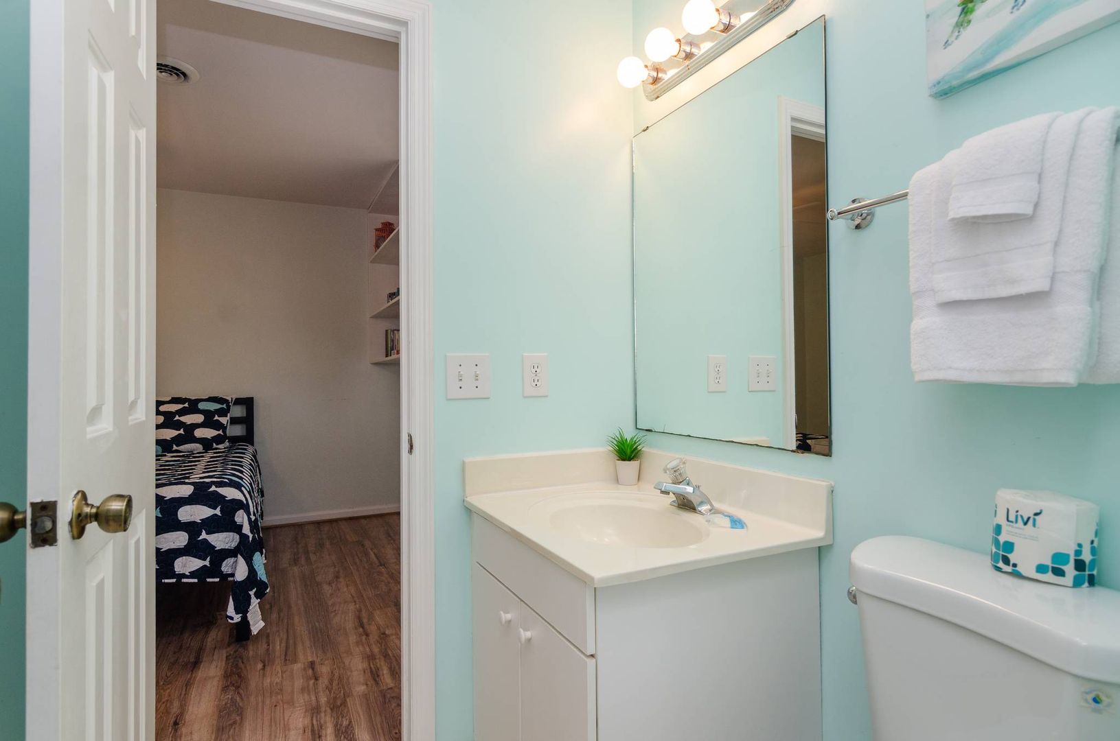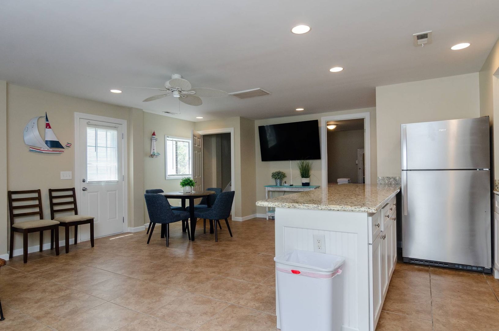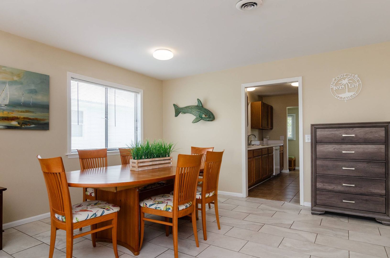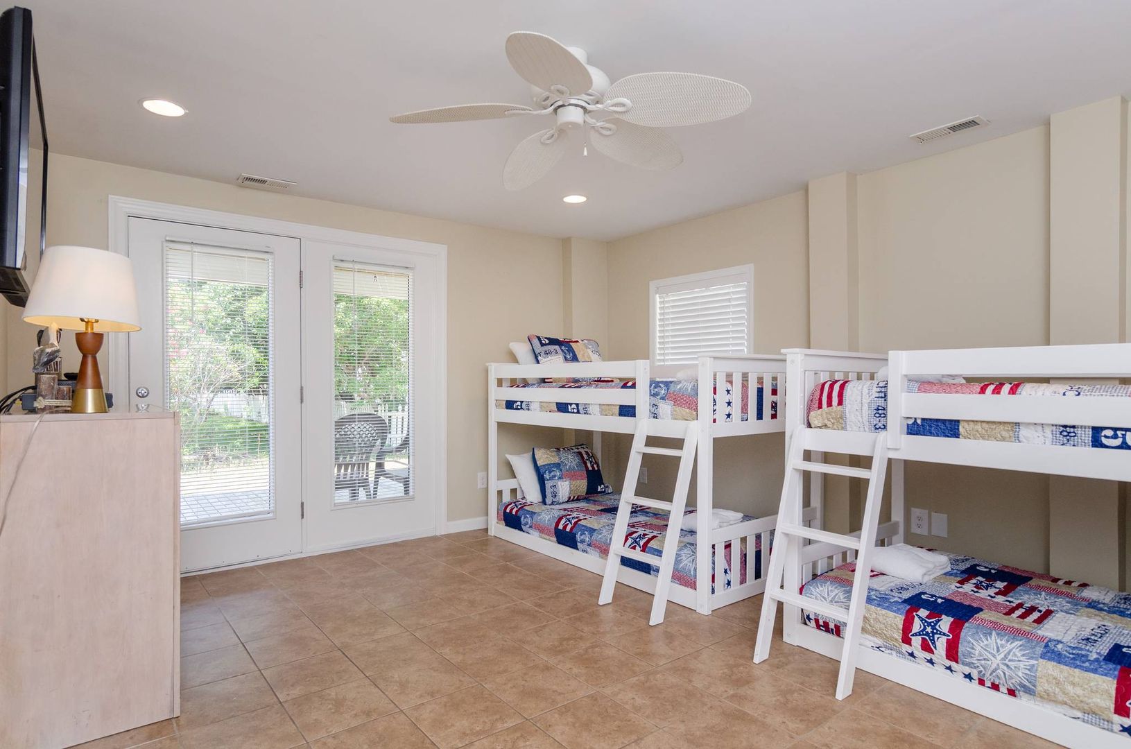 As you arrive, the bright exterior and welcoming front porch instantly set the tone for a memorable stay. Step inside the lower level to find an expansive open-concept great room with comfortable seating, warm coastal decor, and soft natural light. The newly updated kitchen is well-equipped with everything you need to prepare family meals—from quick breakfasts before a beach day to home cooked family meals. This level is home to two bedrooms: a lovely queen guest room with an en suite bathroom, and a cheerful bunk room featuring two sets of twin-size bunks. Designed with children in mind, the bunks sit low to the ground for added safety and comfort—perfect for young guests transitioning to their own sleep space. The bunk room also has its own full bathroom with a shower/tub combo and access to the rear patios where you can enjoy the shade, play games, or sip a cool drink in the ocean breeze.