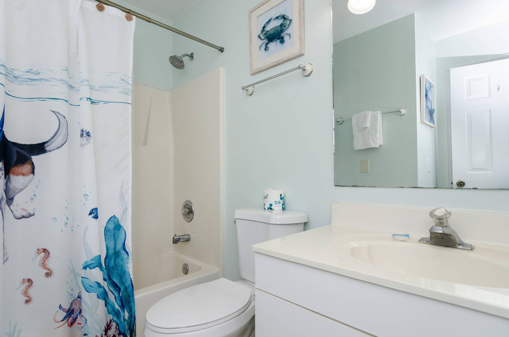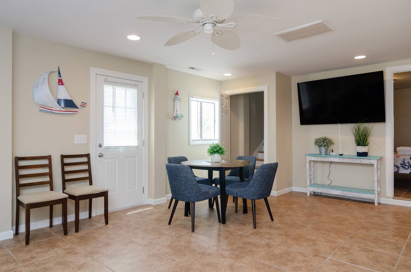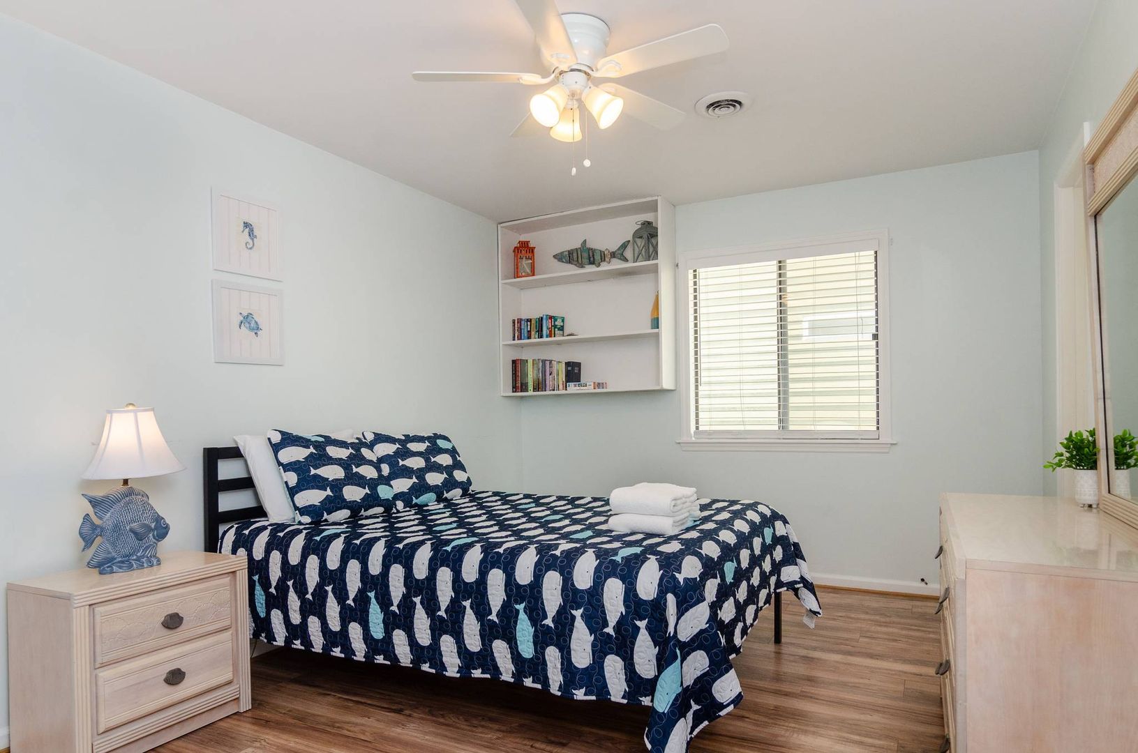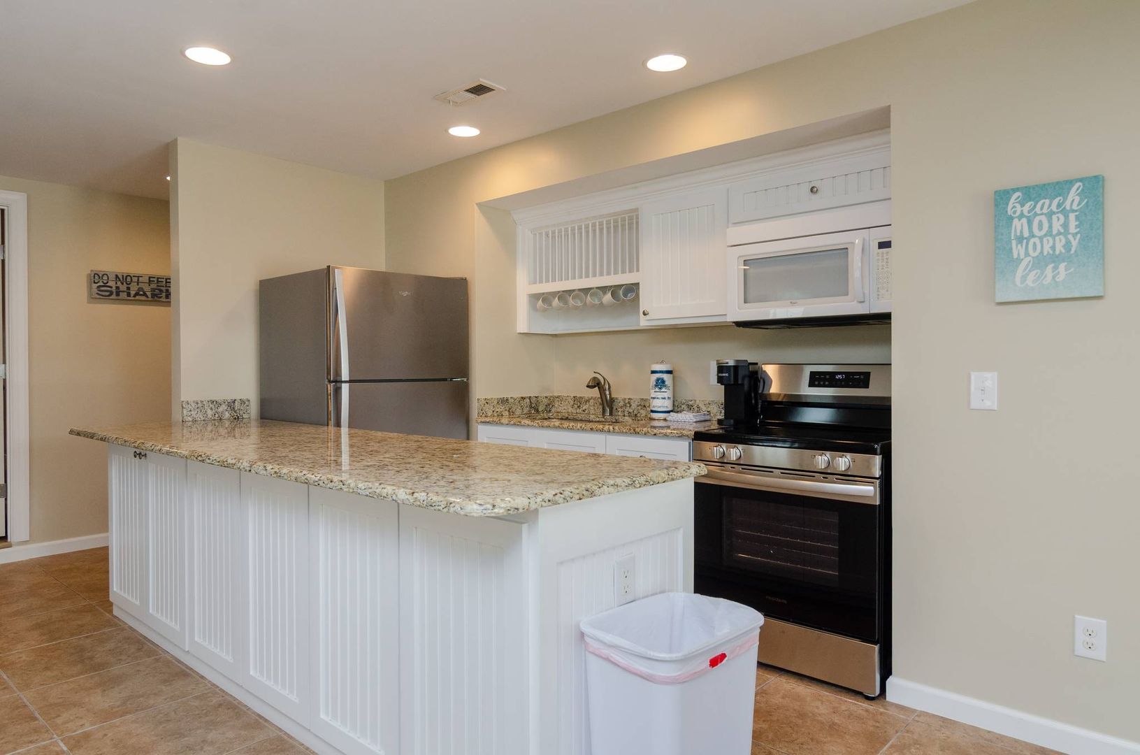 As you arrive, the bright exterior and welcoming front porch instantly set the tone for a memorable stay. Step inside the lower level to find an expansive open-concept great room with comfortable seating, warm coastal decor, and soft natural light. The newly updated kitchen is well-equipped with everything you need to prepare family meals—from quick breakfasts before a beach day to home cooked family meals. This level is home to two bedrooms: a lovely queen guest room with an en suite bathroom, and a cheerful bunk room featuring two sets of twin-size bunks. Designed with children in mind, the bunks sit low to the ground for added safety and comfort—perfect for young guests transitioning to their own sleep space. The bunk room also has its own full bathroom with a shower/tub combo and access to the rear patios where you can enjoy the shade, play games, or sip a cool drink in the ocean breeze.