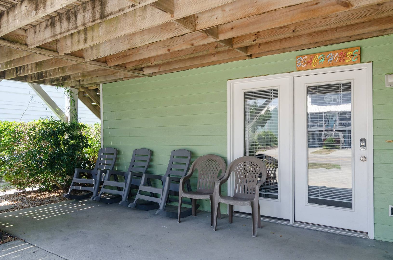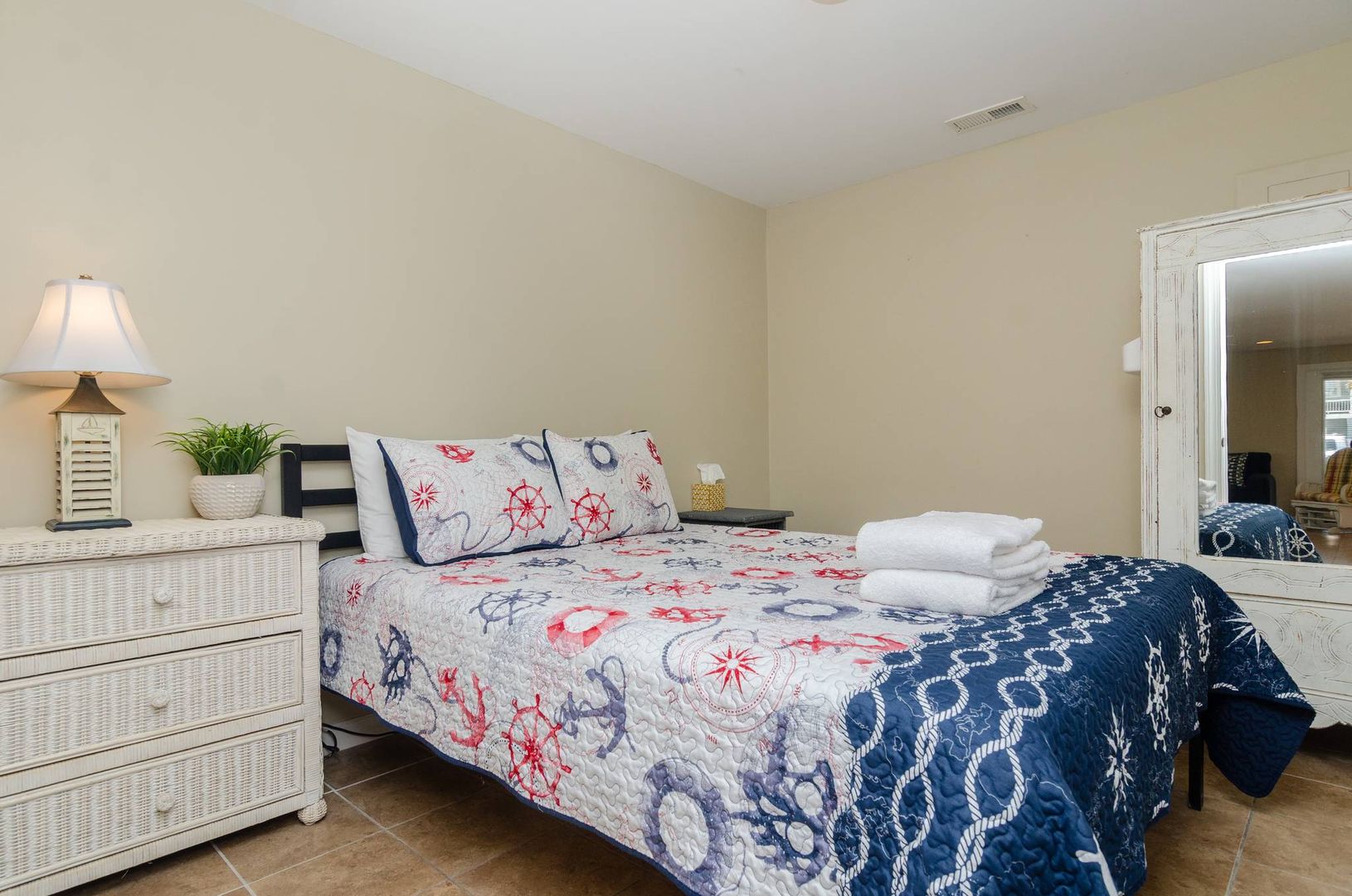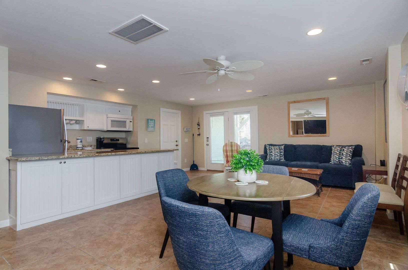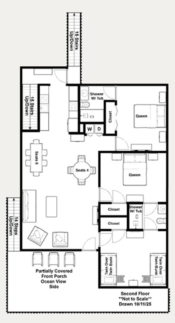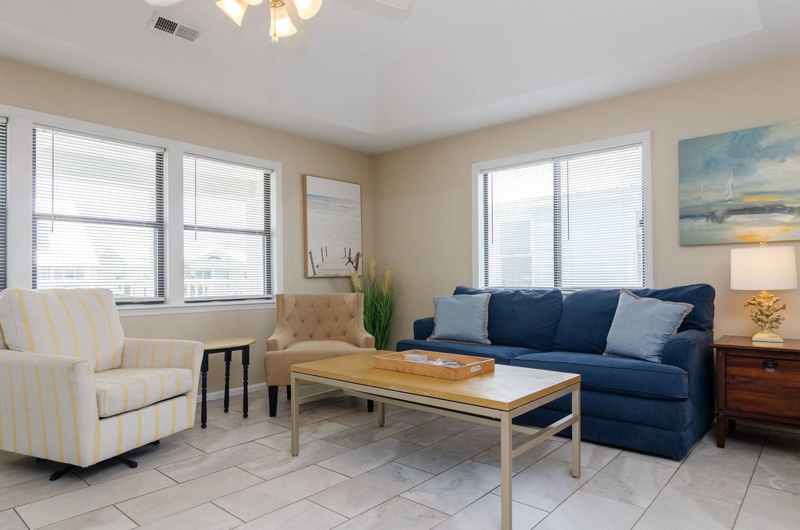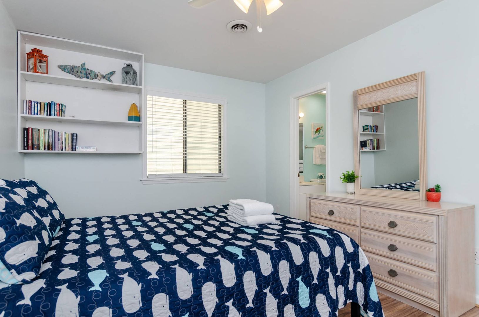 As you arrive, the bright exterior and welcoming front porch instantly set the tone for a memorable stay. Step inside the lower level to find an expansive open-concept great room with comfortable seating, warm coastal decor, and soft natural light. The newly updated kitchen is well-equipped with everything you need to prepare family meals—from quick breakfasts before a beach day to home cooked family meals. This level is home to two bedrooms: a lovely queen guest room with an en suite bathroom, and a cheerful bunk room featuring two sets of twin-size bunks. Designed with children in mind, the bunks sit low to the ground for added safety and comfort—perfect for young guests transitioning to their own sleep space. The bunk room also has its own full bathroom with a shower/tub combo and access to the rear patios where you can enjoy the shade, play games, or sip a cool drink in the ocean breeze.