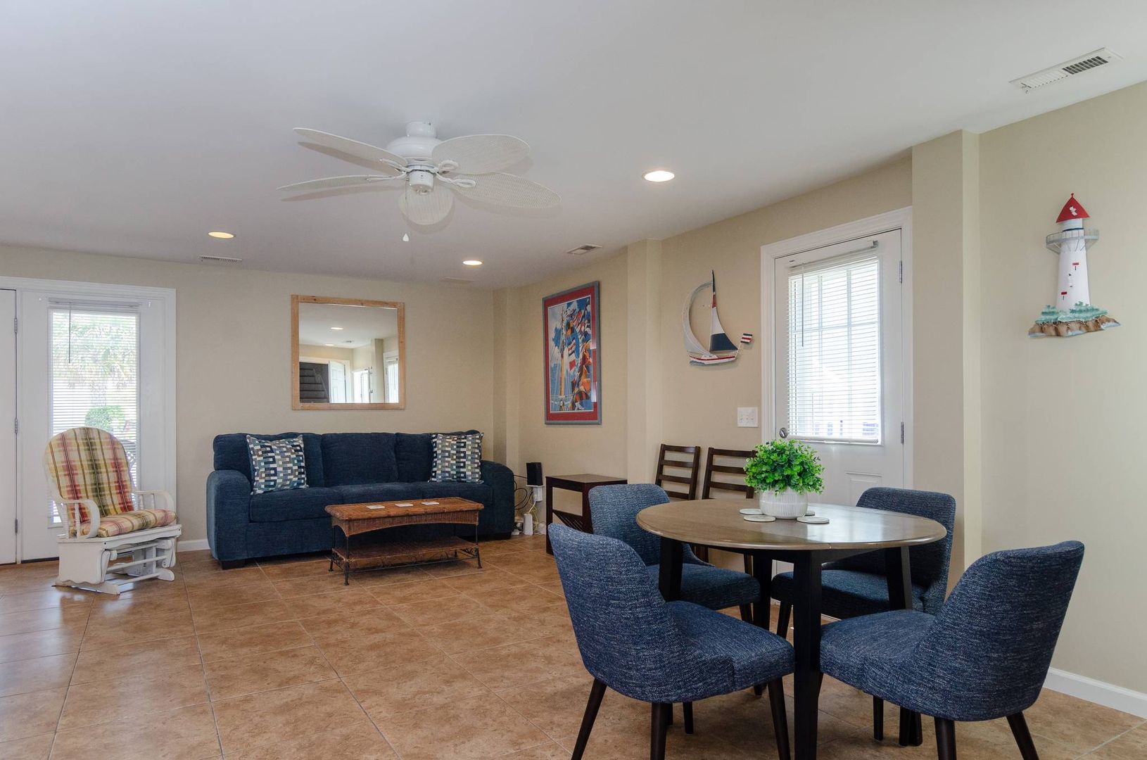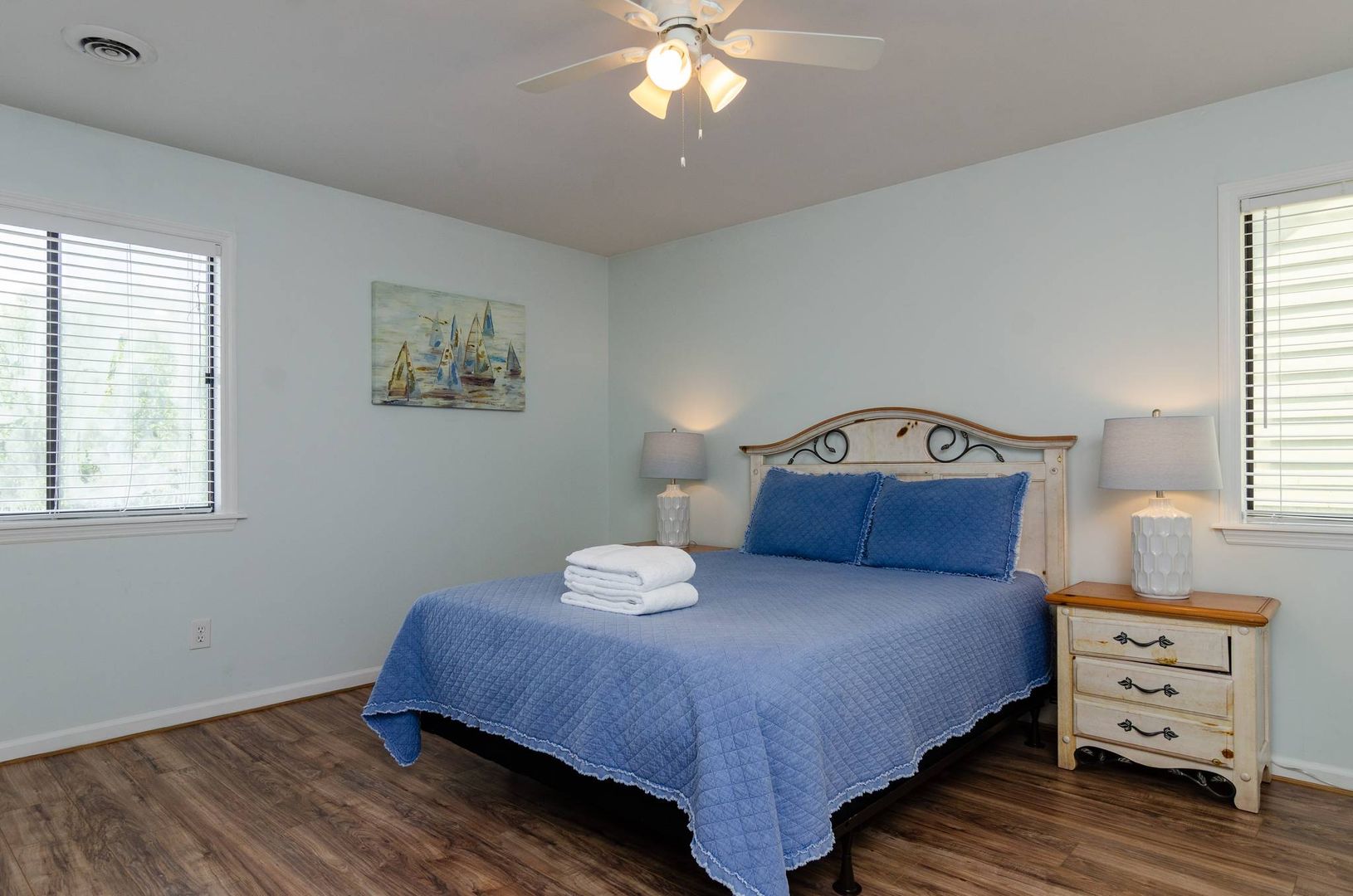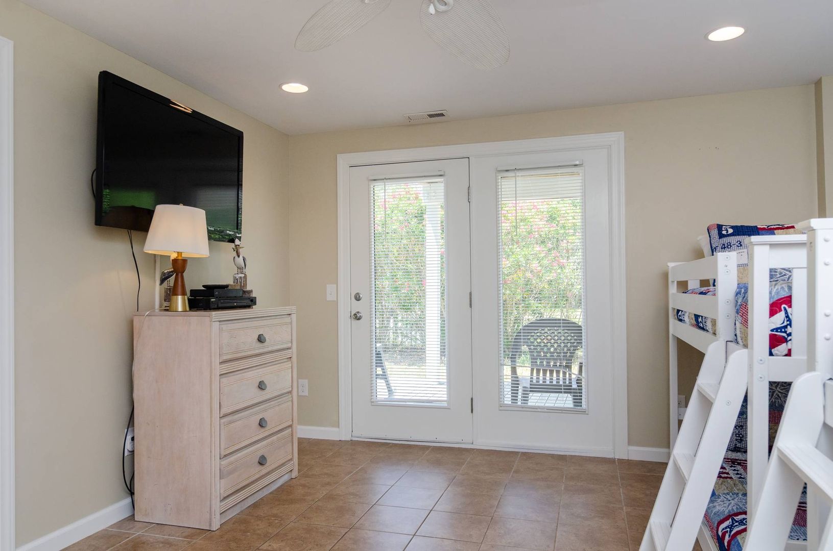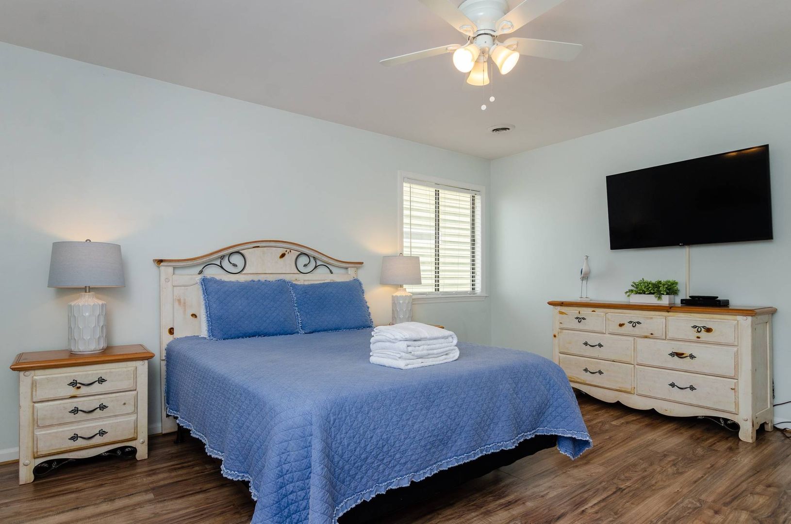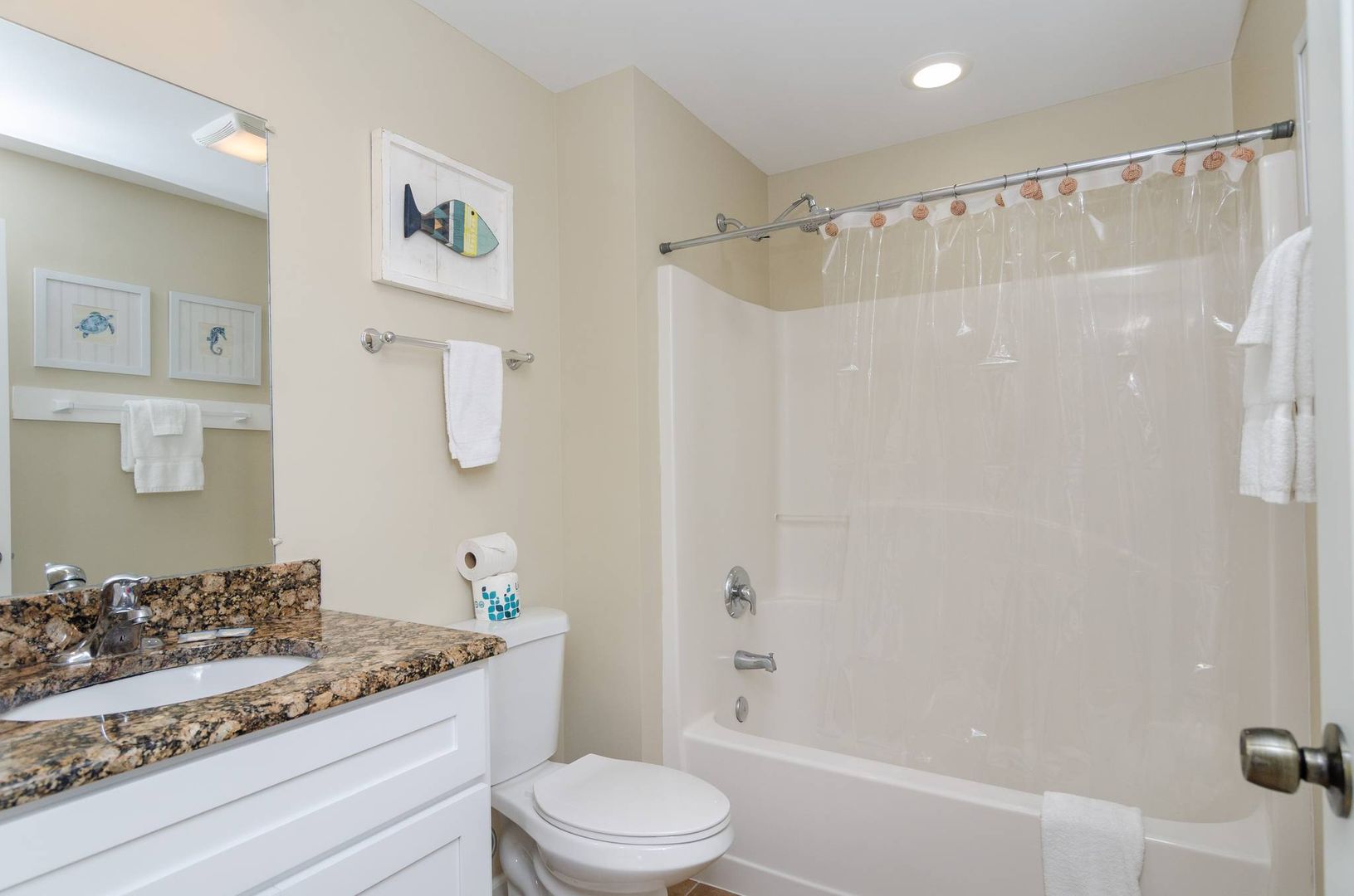 As you arrive, the bright exterior and welcoming front porch instantly set the tone for a memorable stay. Step inside the lower level to find an expansive open-concept great room with comfortable seating, warm coastal decor, and soft natural light. The newly updated kitchen is well-equipped with everything you need to prepare family meals—from quick breakfasts before a beach day to home cooked family meals. This level is home to two bedrooms: a lovely queen guest room with an en suite bathroom, and a cheerful bunk room featuring two sets of twin-size bunks. Designed with children in mind, the bunks sit low to the ground for added safety and comfort—perfect for young guests transitioning to their own sleep space. The bunk room also has its own full bathroom with a shower/tub combo and access to the rear patios where you can enjoy the shade, play games, or sip a cool drink in the ocean breeze.