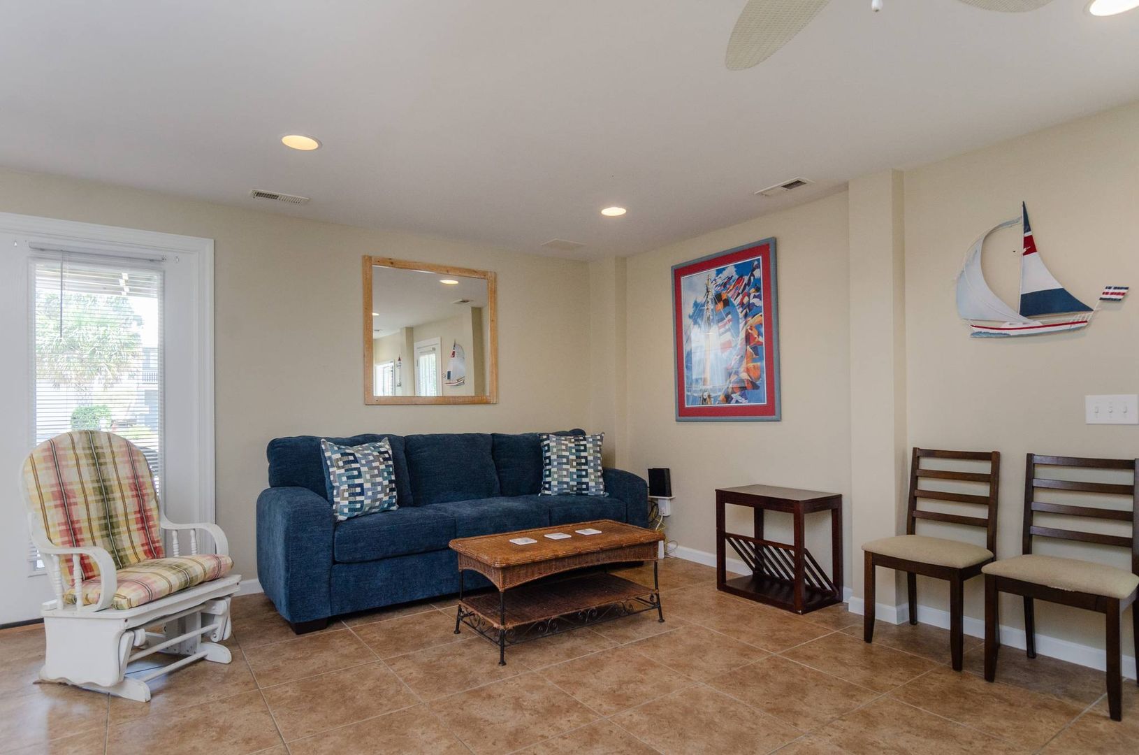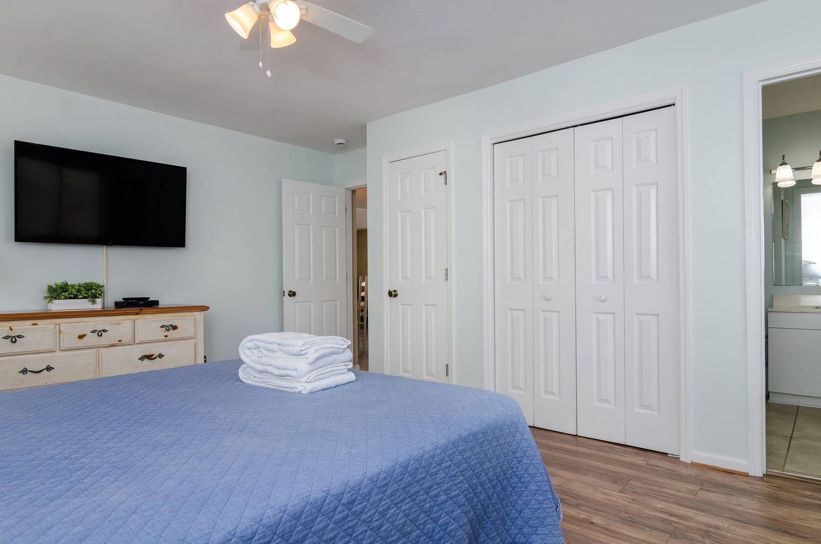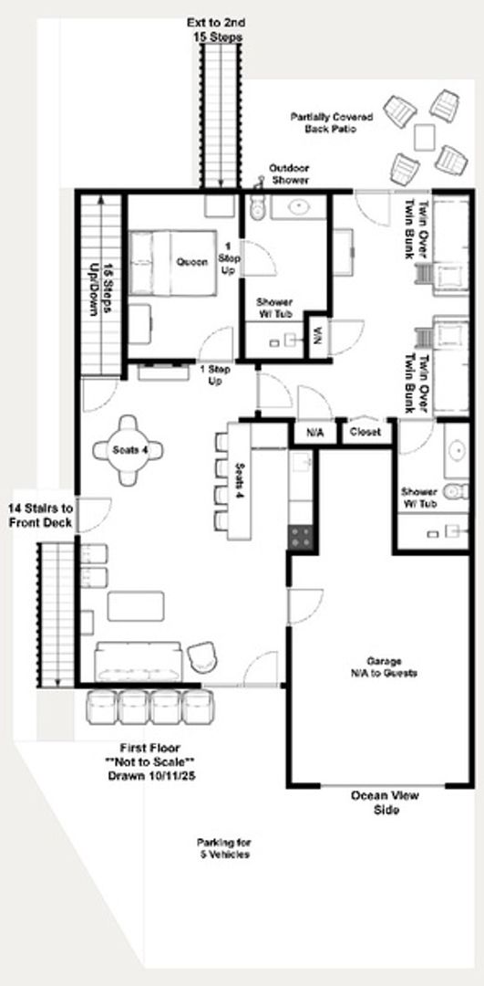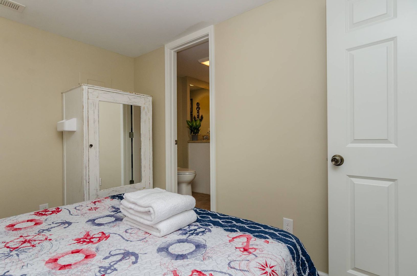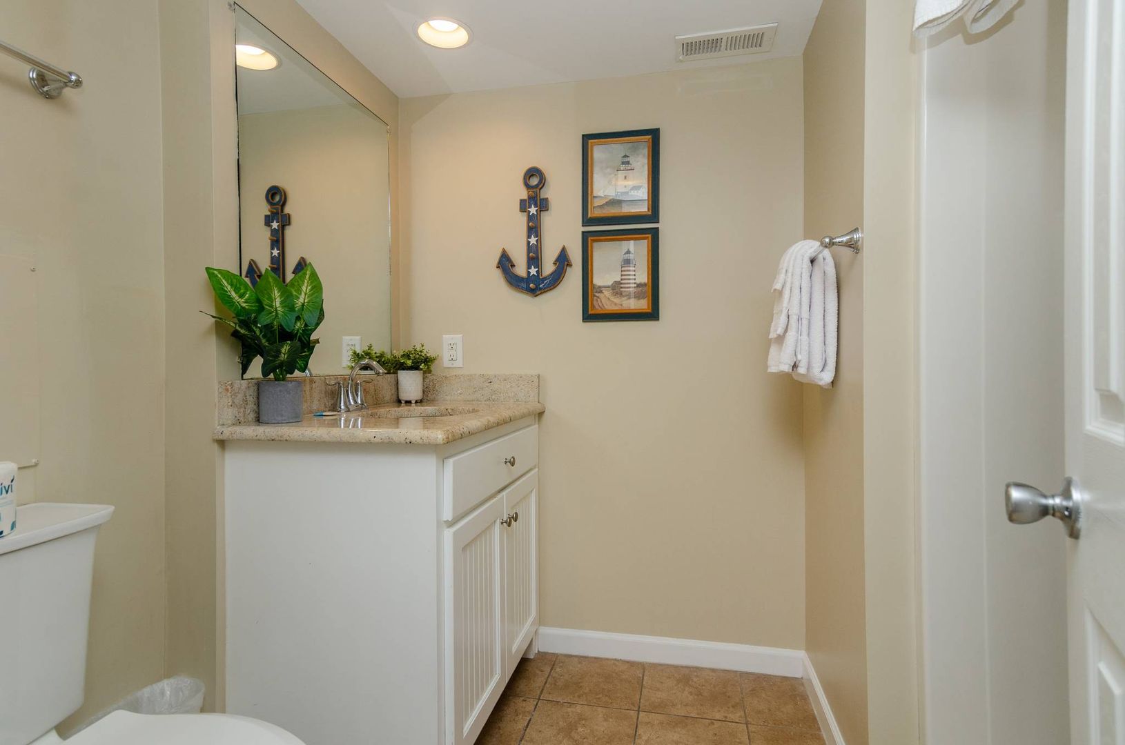 As you arrive, the bright exterior and welcoming front porch instantly set the tone for a memorable stay. Step inside the lower level to find an expansive open-concept great room with comfortable seating, warm coastal decor, and soft natural light. The newly updated kitchen is well-equipped with everything you need to prepare family meals—from quick breakfasts before a beach day to home cooked family meals. This level is home to two bedrooms: a lovely queen guest room with an en suite bathroom, and a cheerful bunk room featuring two sets of twin-size bunks. Designed with children in mind, the bunks sit low to the ground for added safety and comfort—perfect for young guests transitioning to their own sleep space. The bunk room also has its own full bathroom with a shower/tub combo and access to the rear patios where you can enjoy the shade, play games, or sip a cool drink in the ocean breeze.
