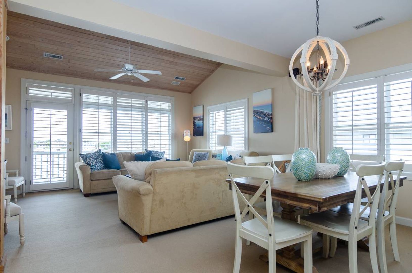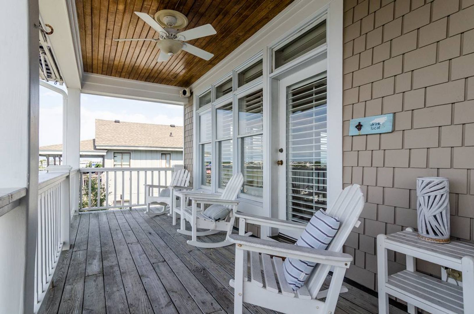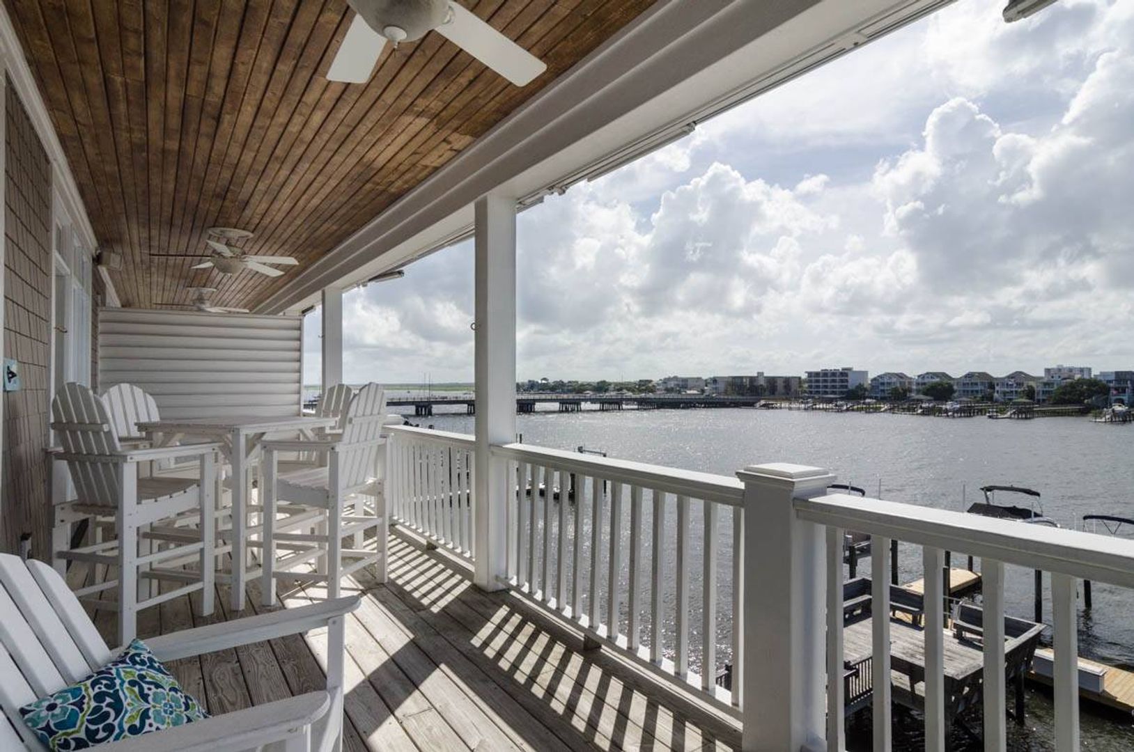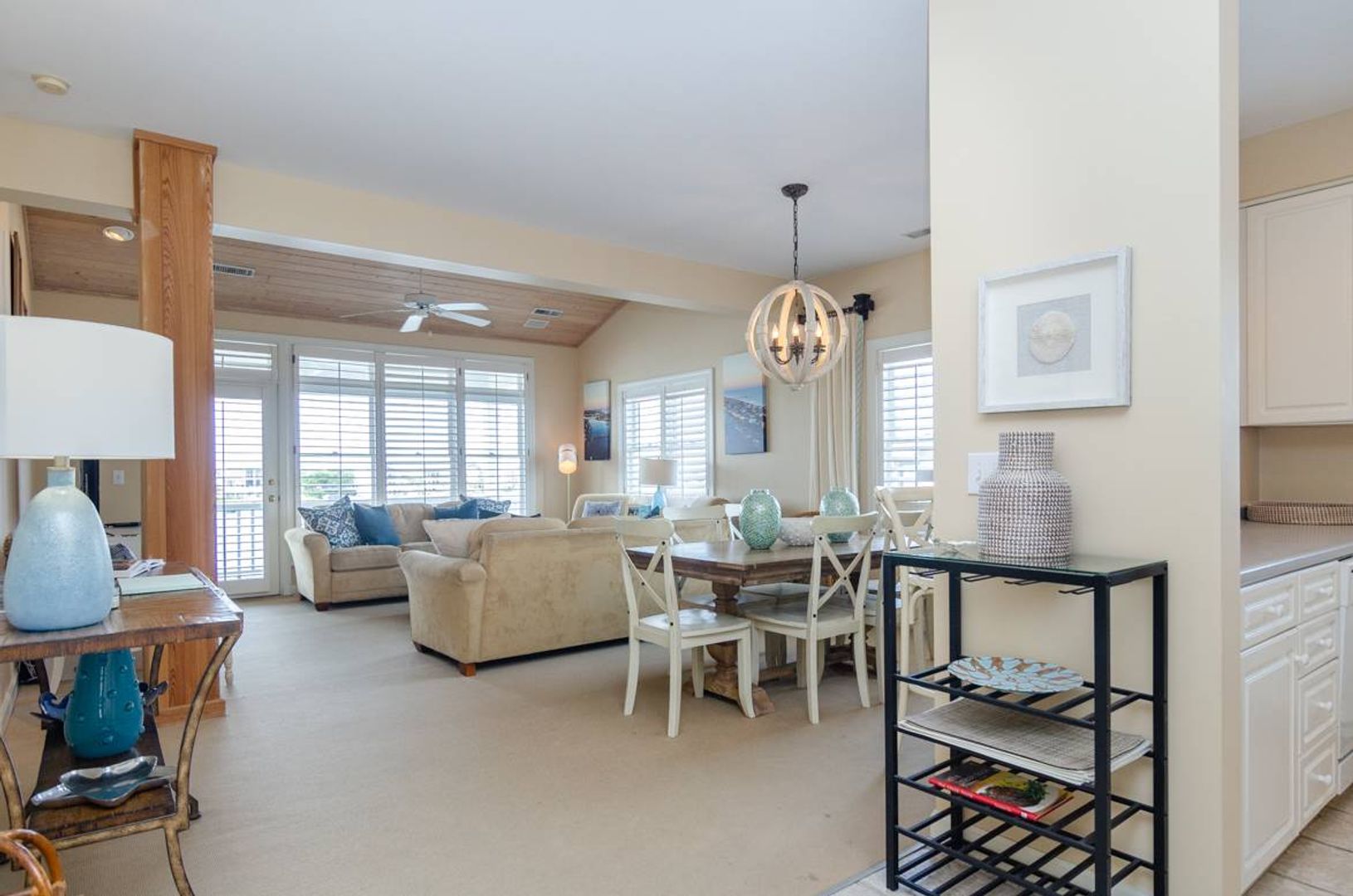 “All Decked Out" is a top floor 3-bedroom, 2-bathroom condo located at the end of Columbia Street in a quiet condo community with only four units. This third-floor property offers privacy, wonderful sound views, spectacular sunsets, and is in the center of Wrightsville Beach. Nicely decorated with a bright and airy living and dining area that opens onto a covered deck. The living room has comfortable furniture and beautiful wooden ceilings that give a modern beach feel to the space. Just off the living room is the primary suite with a king bed and a large private bath with convenient access to the sound front deck. The split floor plan offers added privacy for guests. Two guest bedrooms, one with a queen bed and the other furnished with two twin beds, are located off the main entry hall. A guest bathroom is located opposite the kitchen. The kitchen has plenty of pantry space and is easy to navigate.