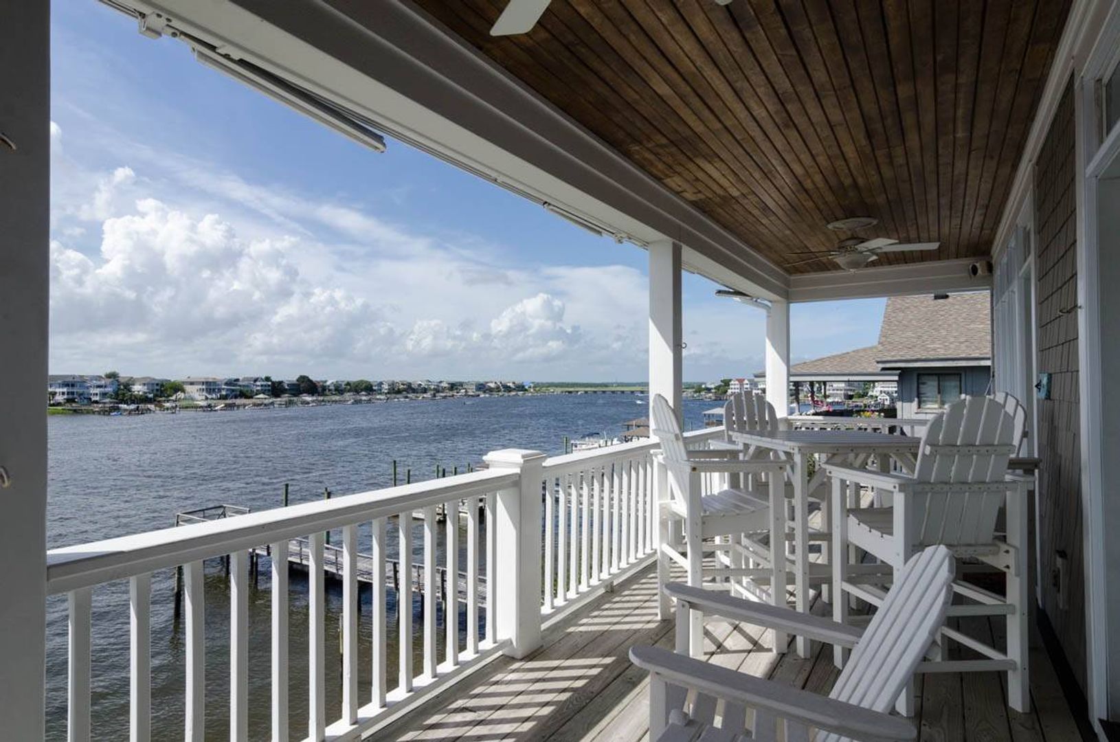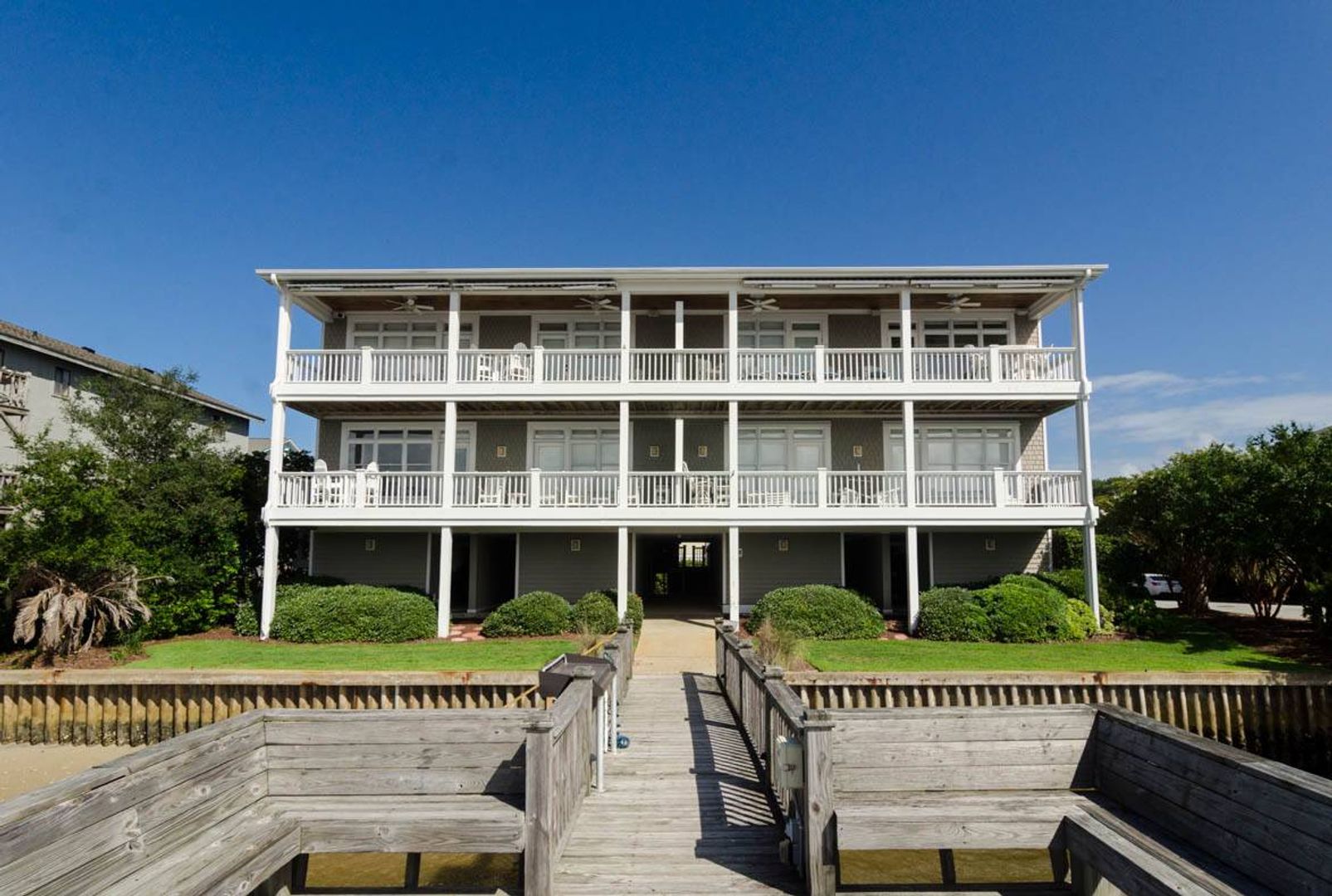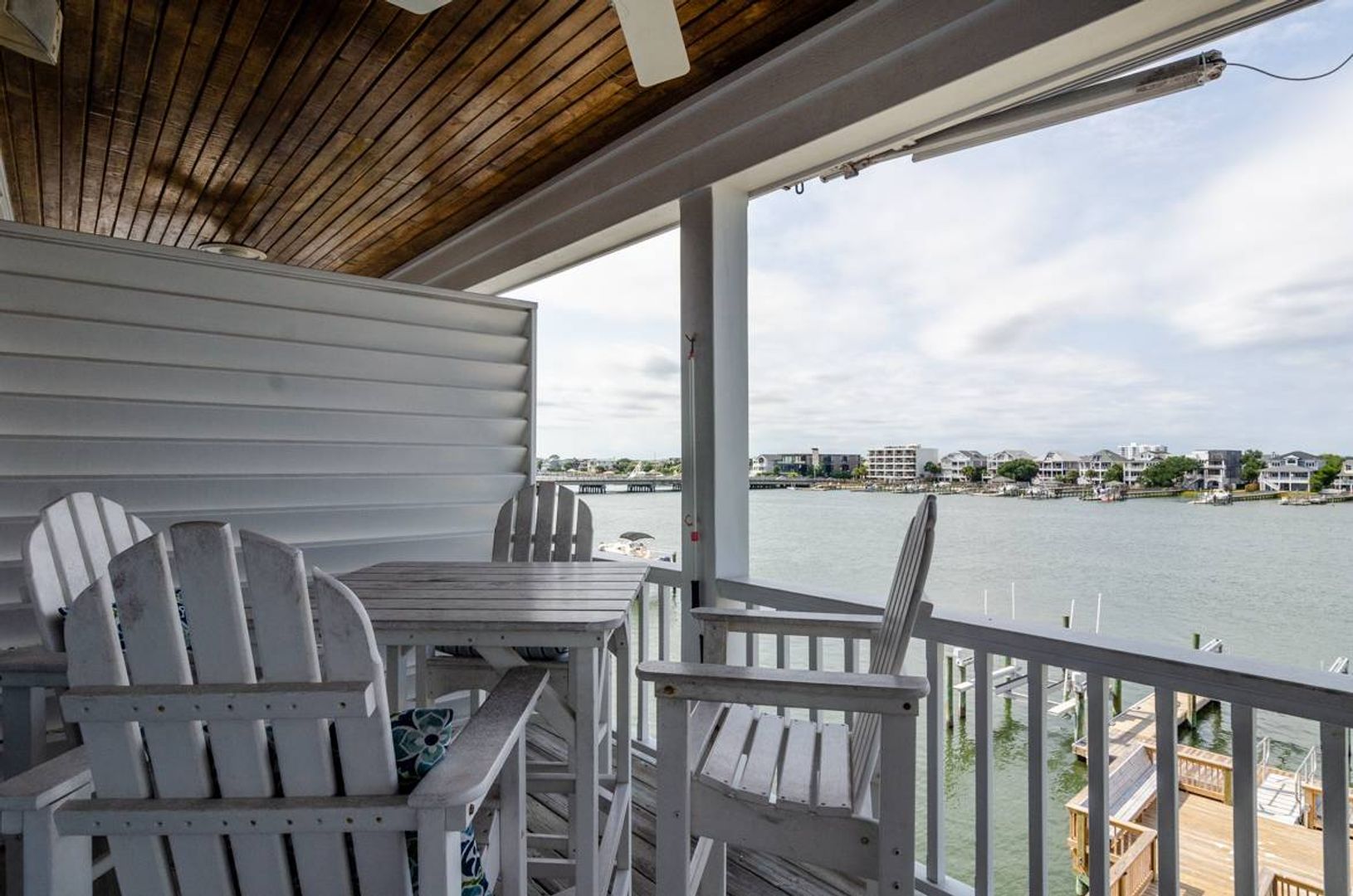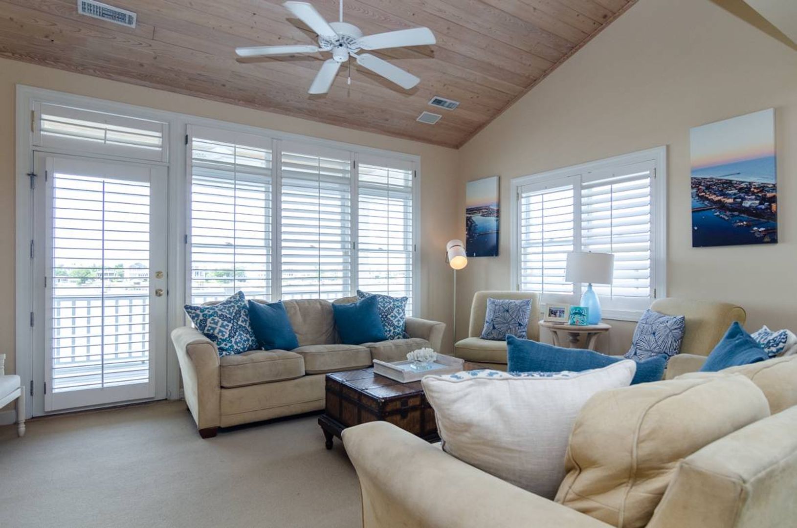 “All Decked Out" is a top floor 3-bedroom, 2-bathroom condo located at the end of Columbia Street in a quiet condo community with only four units. This third-floor property offers privacy, wonderful sound views, spectacular sunsets, and is in the center of Wrightsville Beach. Nicely decorated with a bright and airy living and dining area that opens onto a covered deck. The living room has comfortable furniture and beautiful wooden ceilings that give a modern beach feel to the space. Just off the living room is the primary suite with a king bed and a large private bath with convenient access to the sound front deck. The split floor plan offers added privacy for guests. Two guest bedrooms, one with a queen bed and the other furnished with two twin beds, are located off the main entry hall. A guest bathroom is located opposite the kitchen. The kitchen has plenty of pantry space and is easy to navigate.