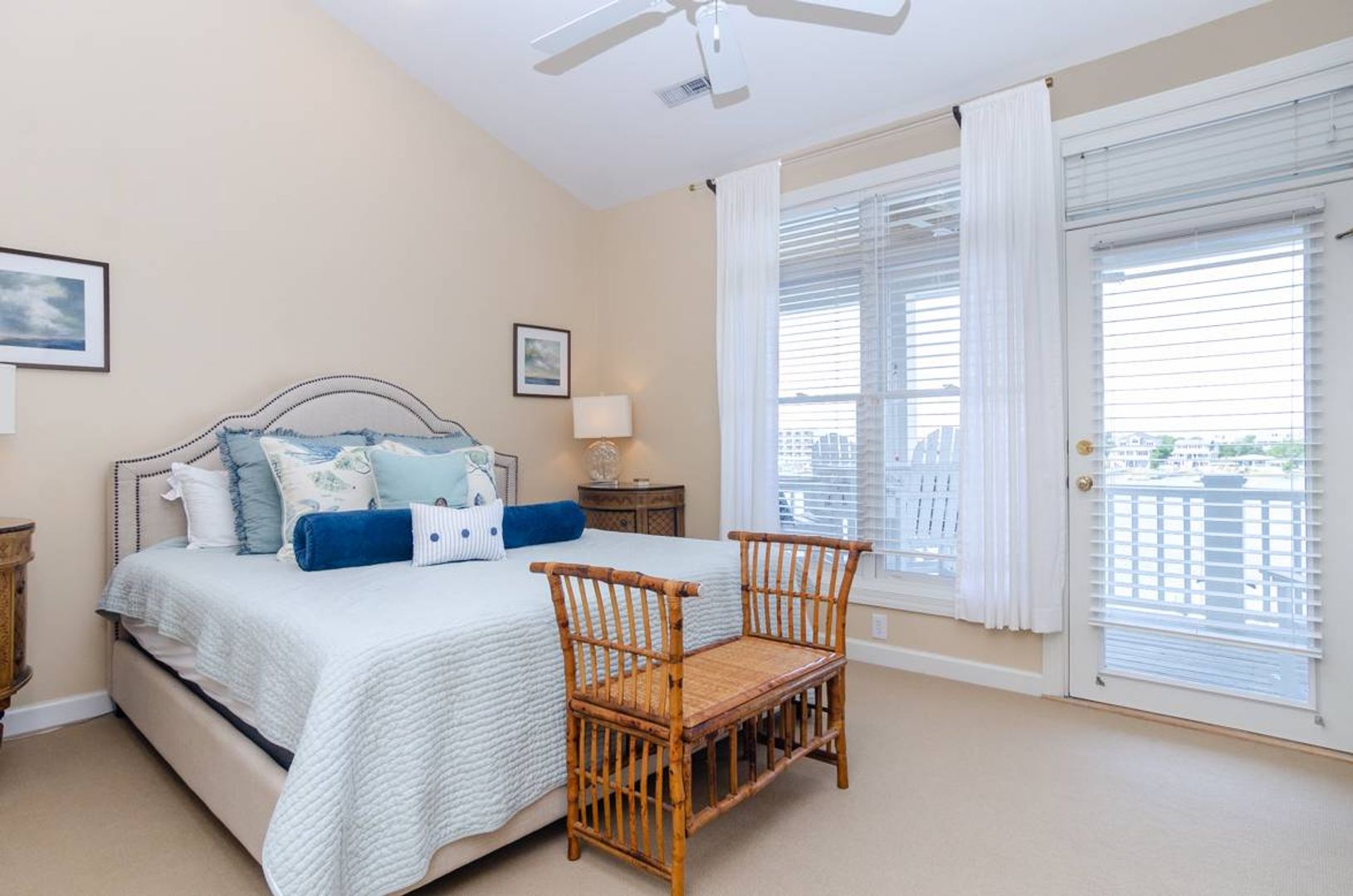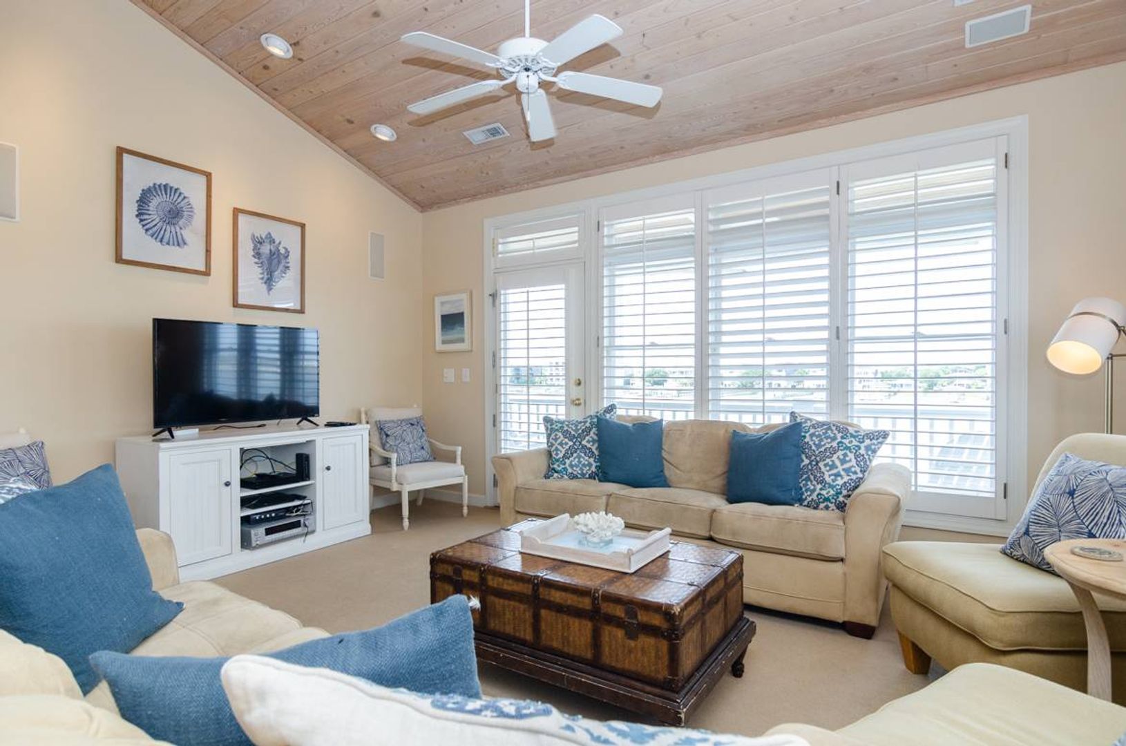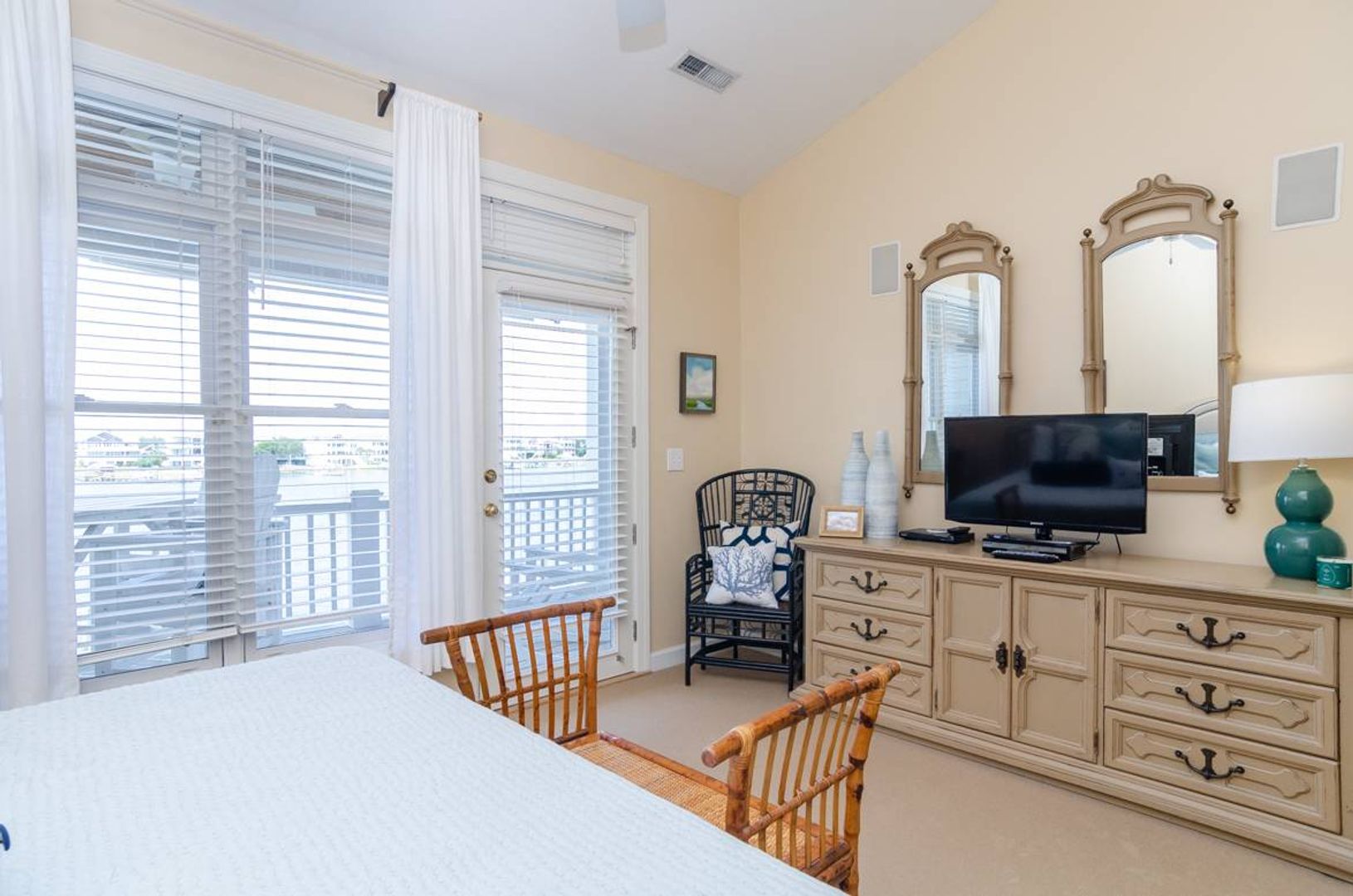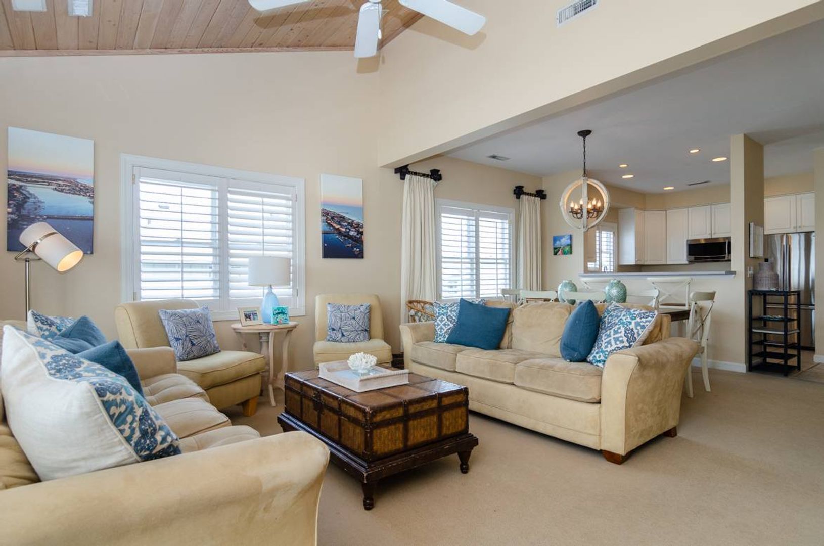 “All Decked Out" is a top floor 3-bedroom, 2-bathroom condo located at the end of Columbia Street in a quiet condo community with only four units. This third-floor property offers privacy, wonderful sound views, spectacular sunsets, and is in the center of Wrightsville Beach. Nicely decorated with a bright and airy living and dining area that opens onto a covered deck. The living room has comfortable furniture and beautiful wooden ceilings that give a modern beach feel to the space. Just off the living room is the primary suite with a king bed and a large private bath with convenient access to the sound front deck. The split floor plan offers added privacy for guests. Two guest bedrooms, one with a queen bed and the other furnished with two twin beds, are located off the main entry hall. A guest bathroom is located opposite the kitchen. The kitchen has plenty of pantry space and is easy to navigate.