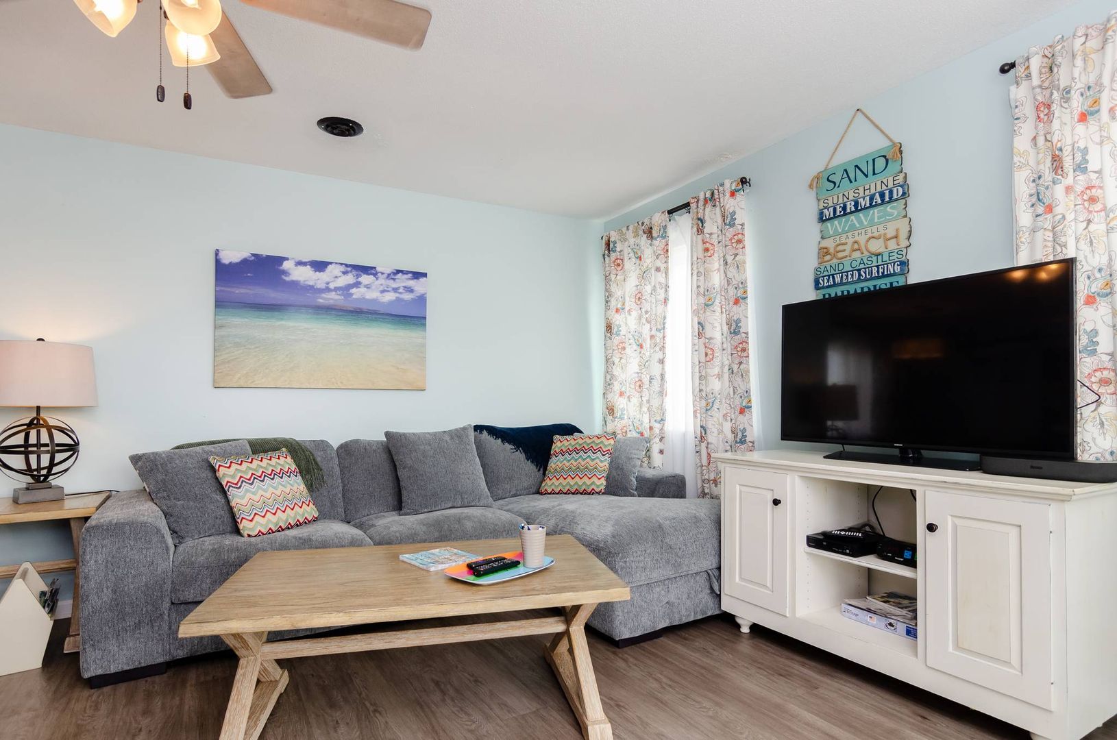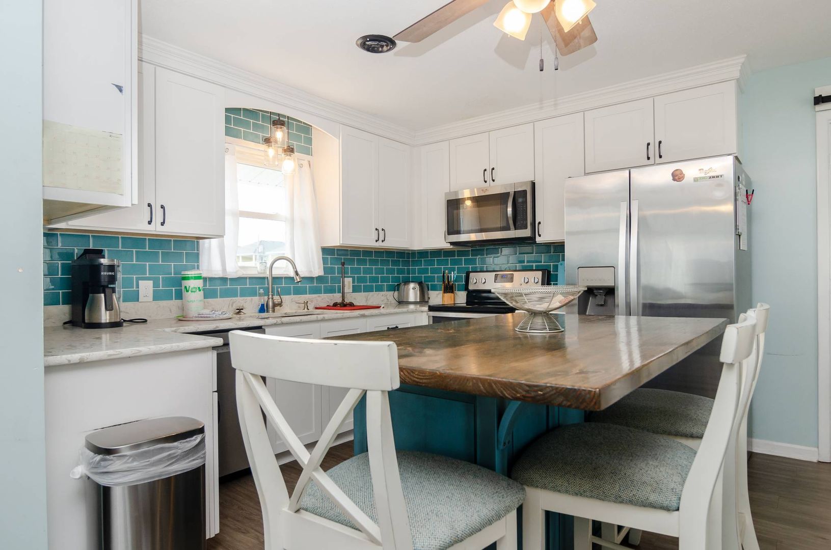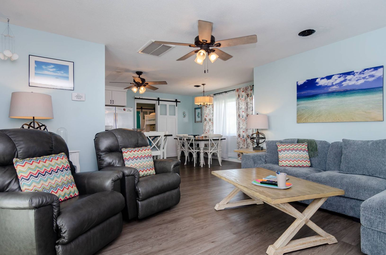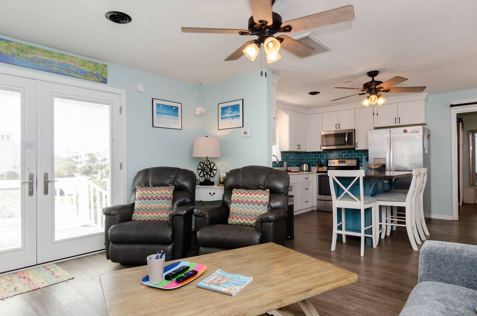 This charming second floor condo welcomes you to the beach with beautiful coastal tones and pops of color. The living room offers a sofa with chaise lounger and two recliners. Kick back, prop your feet up, and relax! This stylish sofa can convert to a queen sleeper sofa in the evenings to allow for an additional sleeping area if needed. The living area seamlessly flows to the dining area and kitchen. Beautiful teal touches run through the gorgeous tile back splash and are accented by stainless steel appliances.