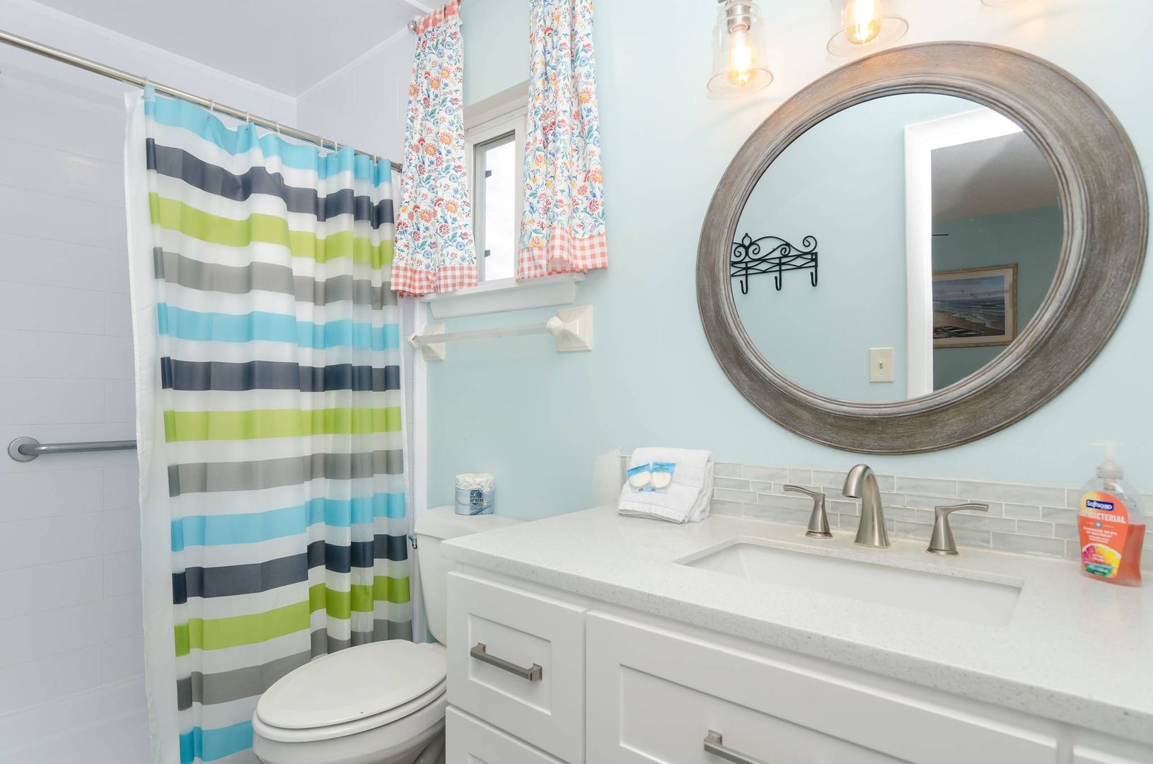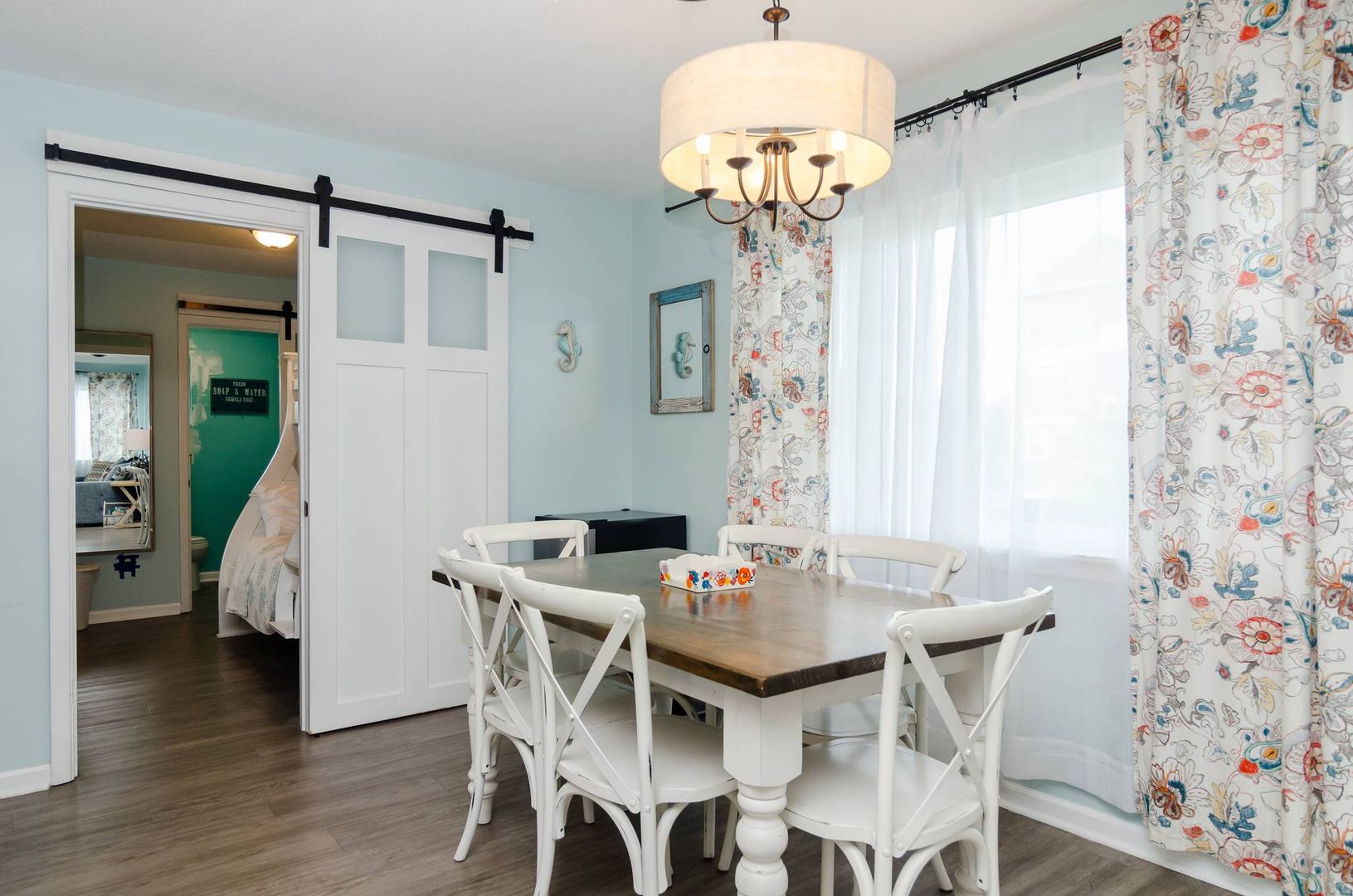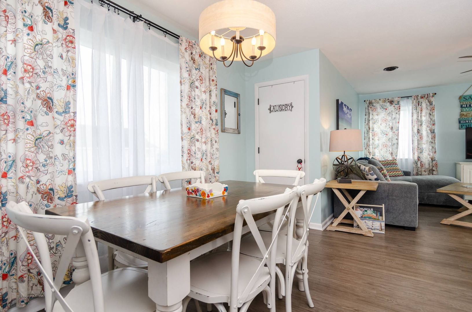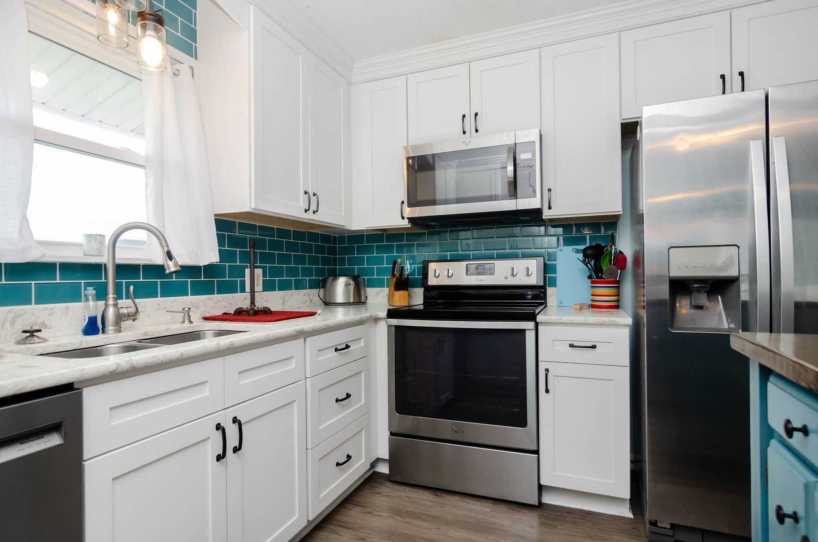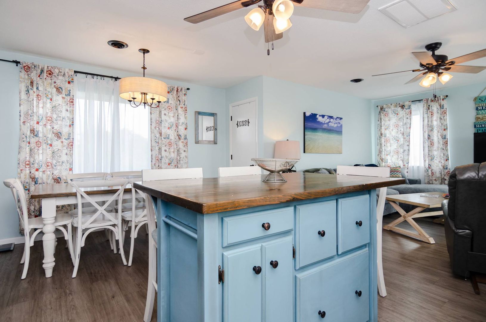 This charming second floor condo welcomes you to the beach with beautiful coastal tones and pops of color. The living room offers a sofa with chaise lounger and two recliners. Kick back, prop your feet up, and relax! This stylish sofa can convert to a queen sleeper sofa in the evenings to allow for an additional sleeping area if needed. The living area seamlessly flows to the dining area and kitchen. Beautiful teal touches run through the gorgeous tile back splash and are accented by stainless steel appliances.