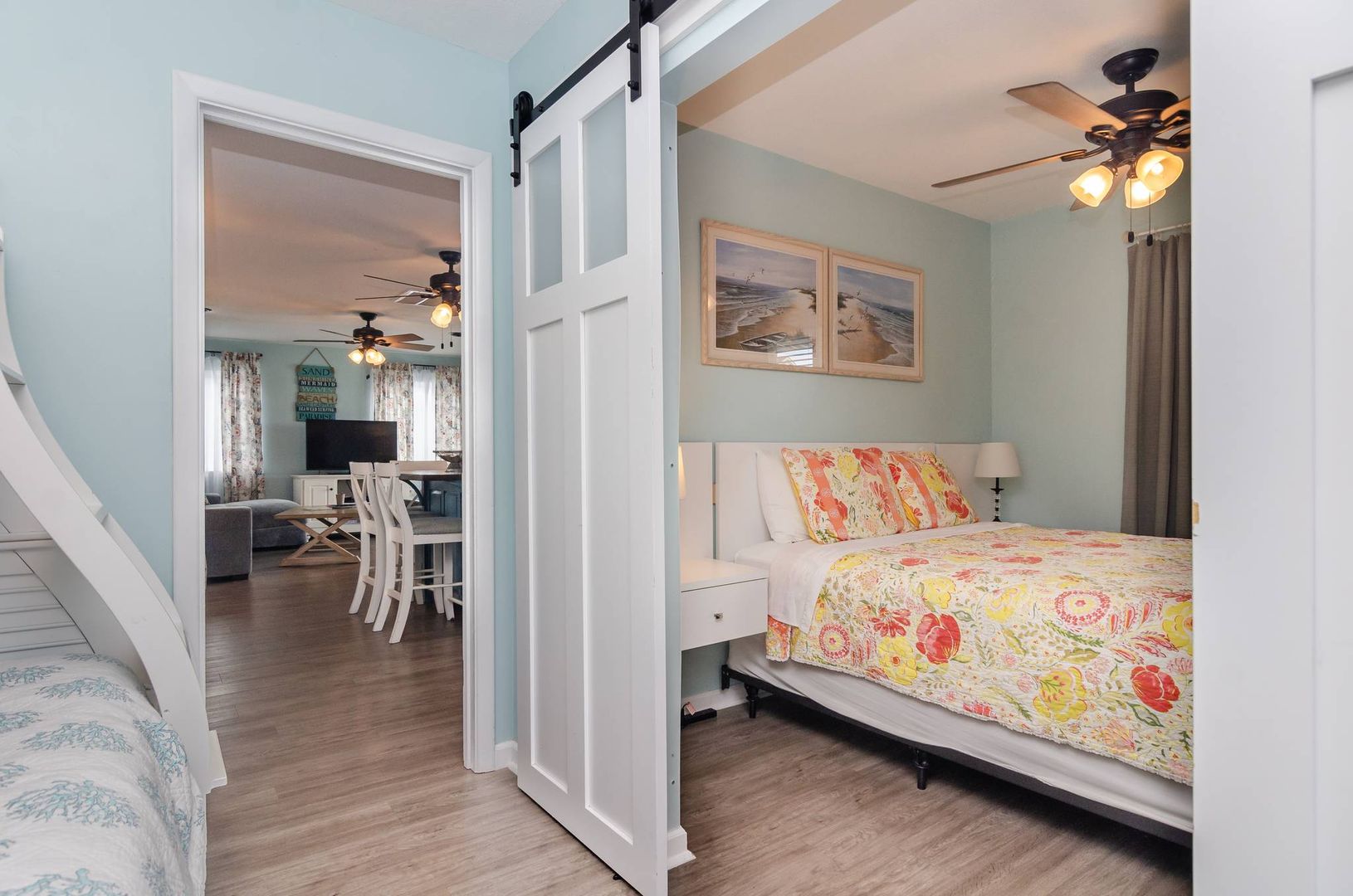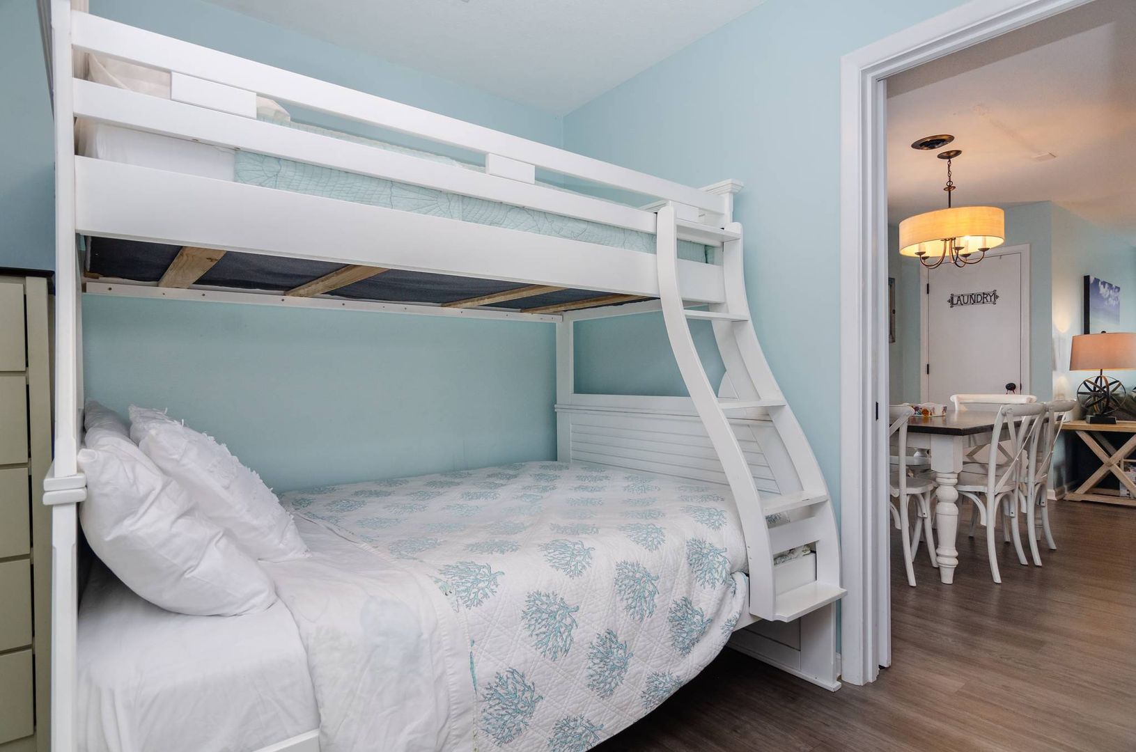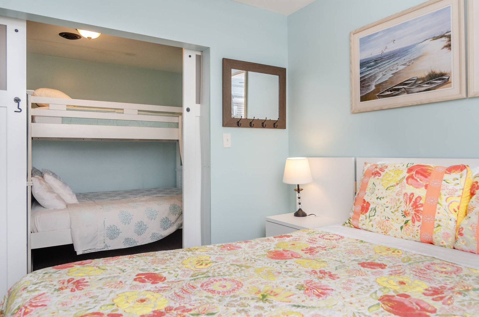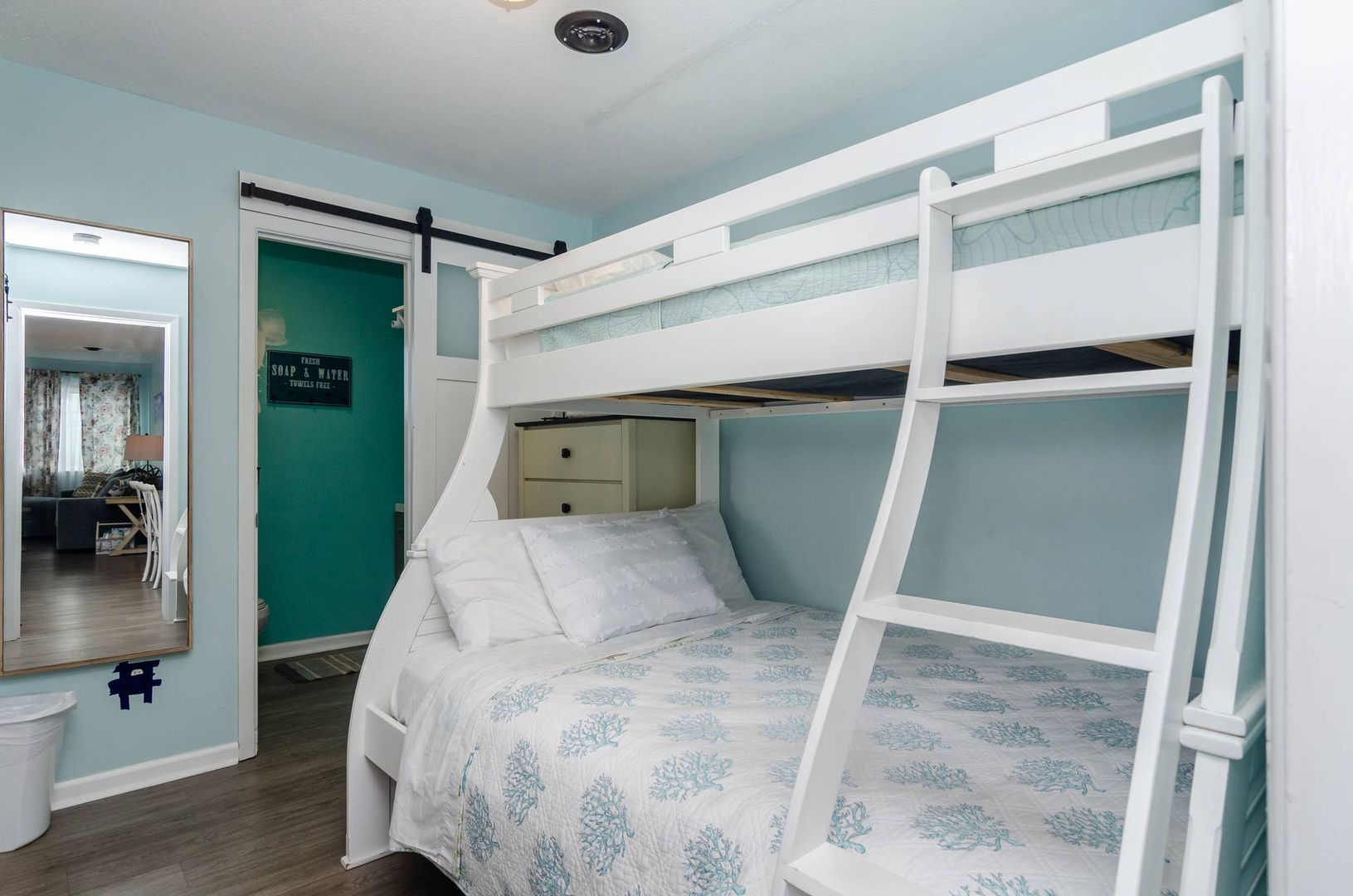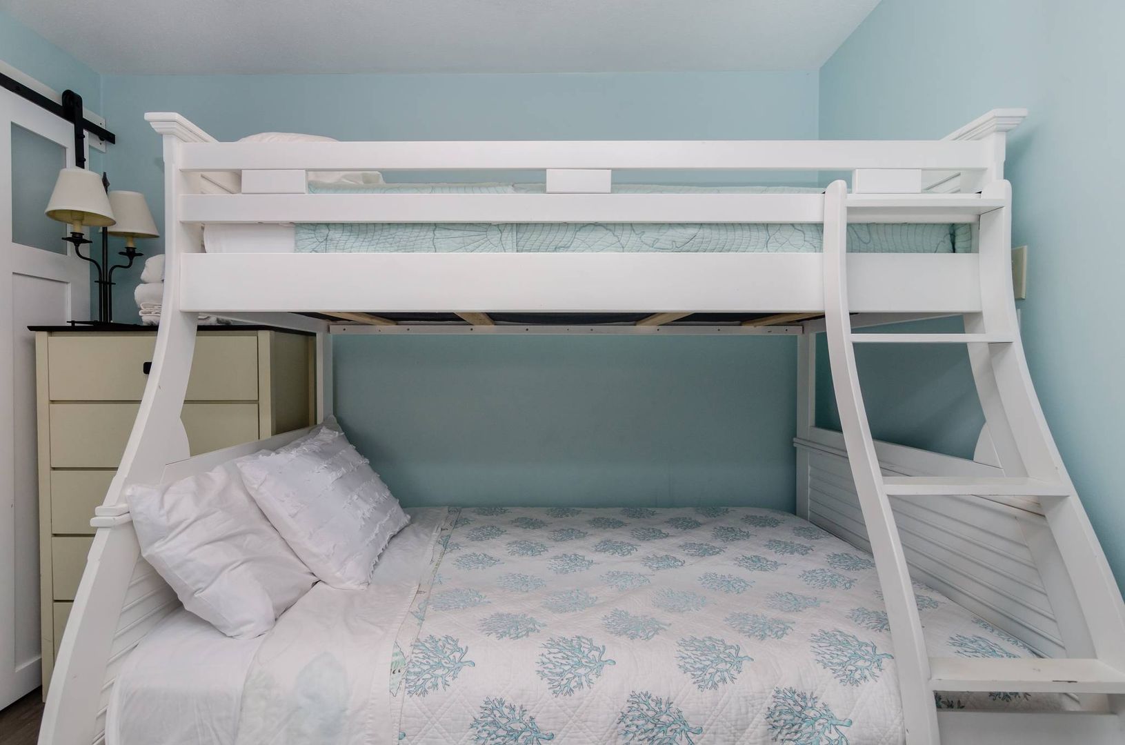 There is a guest room with a pyramid bunk (twin over full) that makes perfect accommodation for junior family members. For added convenience, there is a half bathroom attached to this bedroom. The second guest bedroom is furnished with a cozy queen bed. The full bathroom can be accessed from this bedroom and services the other guest rooms and sleeping areas.