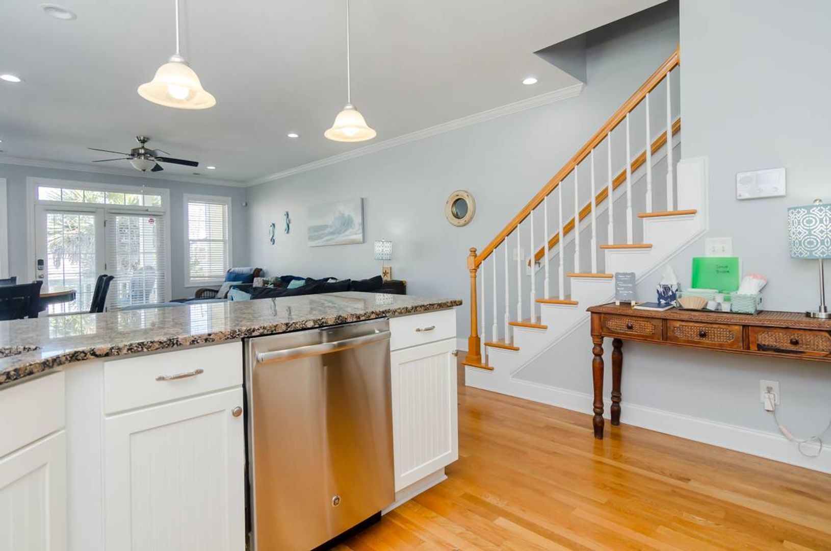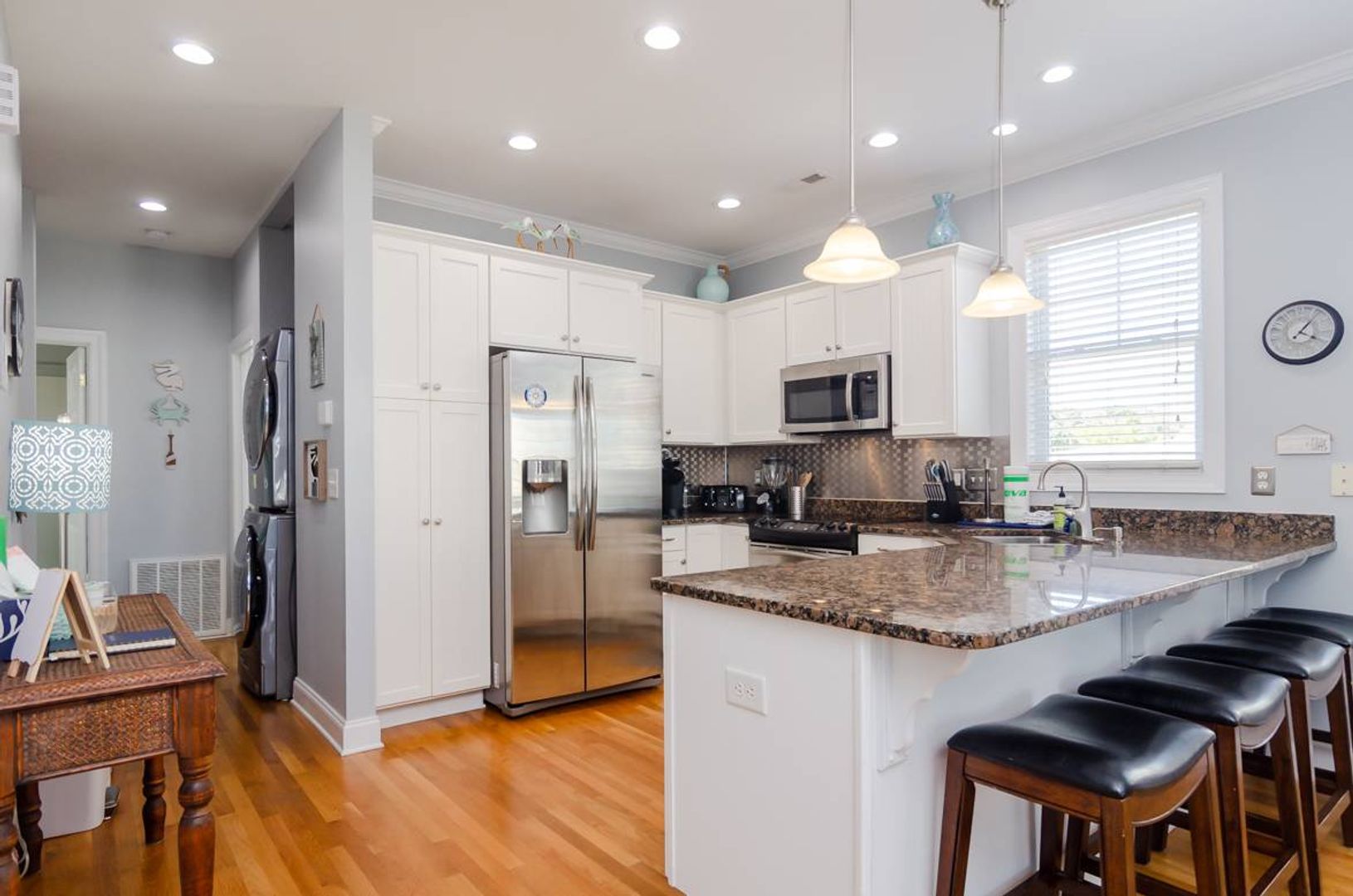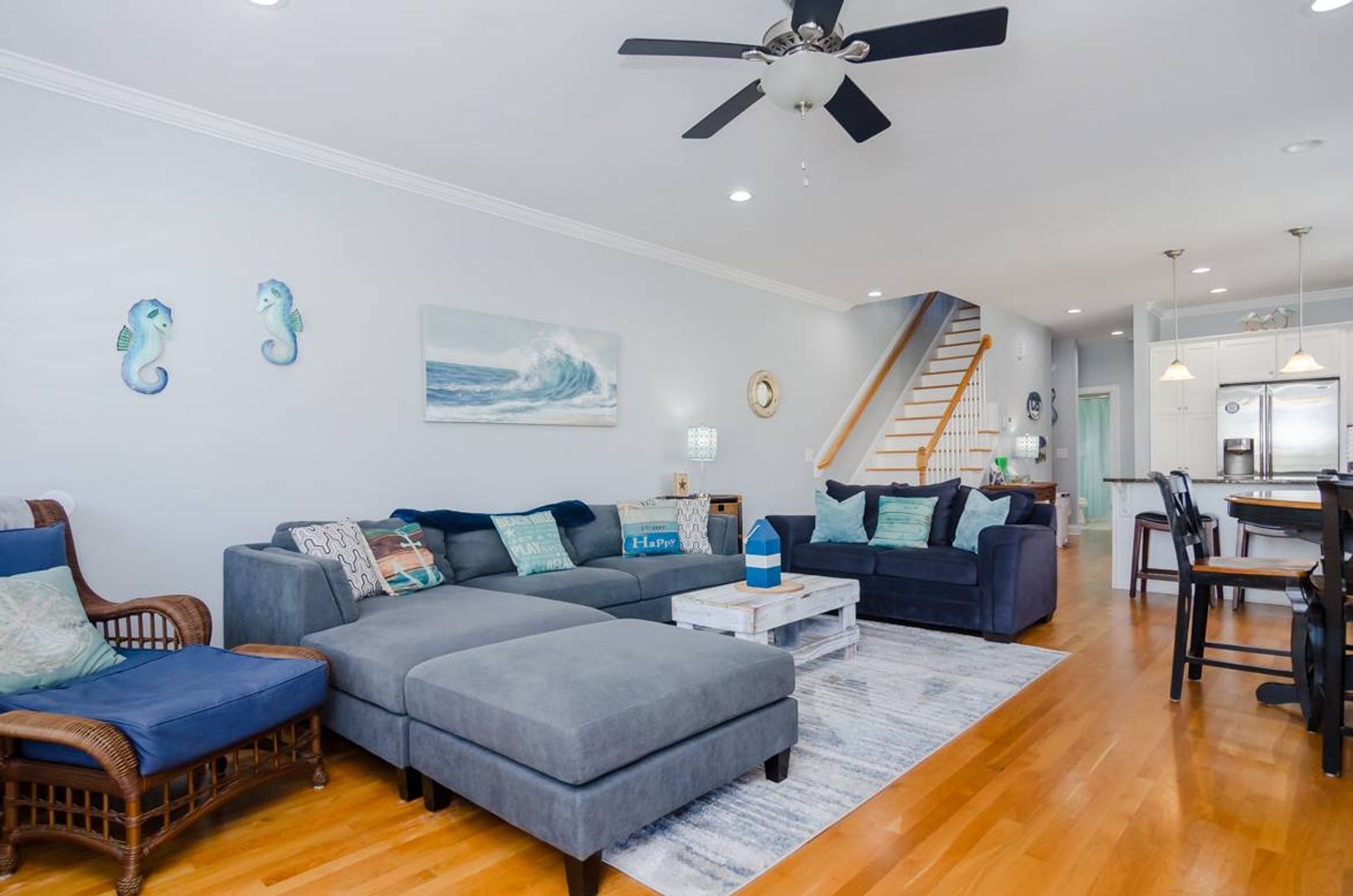 This charming 4-bedroom family friendly duplex has an amazing central location. With beautiful hardwood floors, ample parking, open living space, and an enclosed outdoor shower, this home is a great long-term option! The foyer of “Peaki Tiki” leads you up to the main living level of the home. The kitchen is lined with stainless steel appliances, coastal cabinetry, and appealing tile back splash. A nearby dinner table provides seating and there is a deck off the living room. The large sectional sofa is a cozy retreat at the end of a long day. There is a full bathroom on this living level that serves visitors and the nearby queen guest room. There is a full-size stacked washer and dryer and a gate at the top of the stairs for added convenience. The top floor of this home offers two full bathrooms and three additional bedrooms. The first guest room is furnished with two full sized beds. The next guest bedroom has a twin bed and a twin trundle, and features a smart tv and vaulted ceilings. A full bathroom in the hallways serves the guest rooms with ease. The primary suite is located at the end of the hall and is a true oasis! With a plush king size bed that overlooks the ocean, you will wake up with the sunrise and waves. There is a private deck and on suite bathroom that includes a dual vanity, soaking tub, walk in shower, and private water closet. Outside covered parking adds to the convenience of this home. There is an outdoor shower that is fully enclosed.