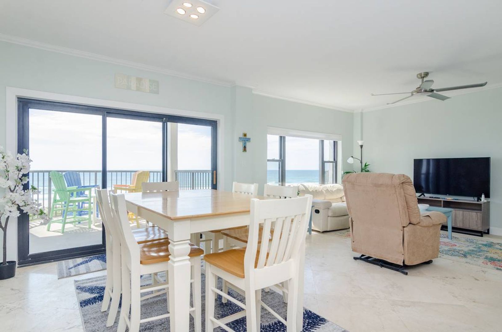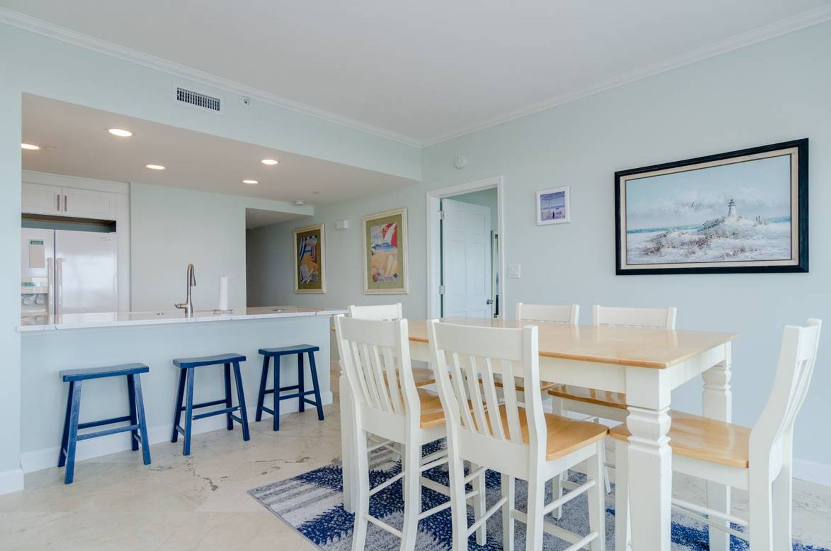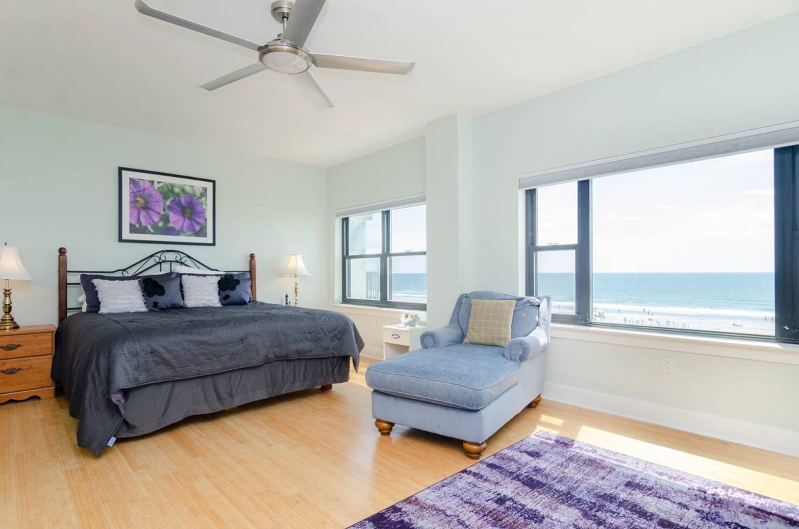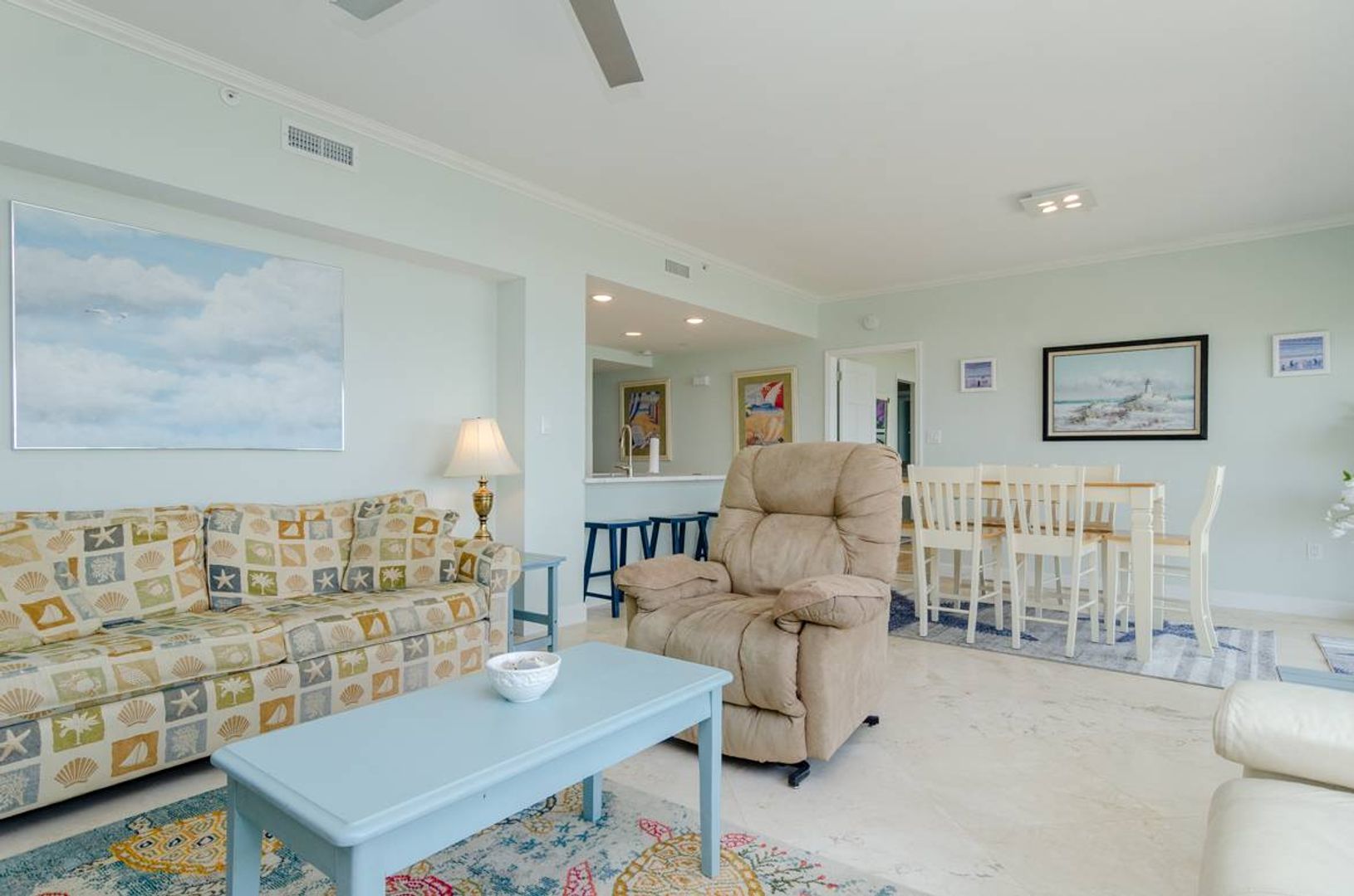 The main living area offers a comfortable living space and a beautifully renovated kitchen that opens to a spacious horseshoe balcony to maximize the ocean views. The deck is the perfect place to catch a spectacular sunrise or relax at the end of a long day. The spacious primary suite is complete with a king-sized bed, television, and updated bathroom that features a walk-in shower and large closet. There are two additional guest bedrooms at the front of the condo that overlook the marsh. A king guest room makes a wonderful accommodation for guests of any age and a nearby hall bathroom services this guest room. Across the hall is a bunk bedroom that has a pyramid bunk bed (full over full) and a private bathroom.
