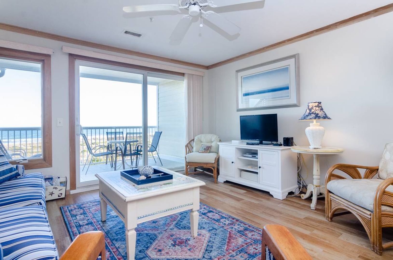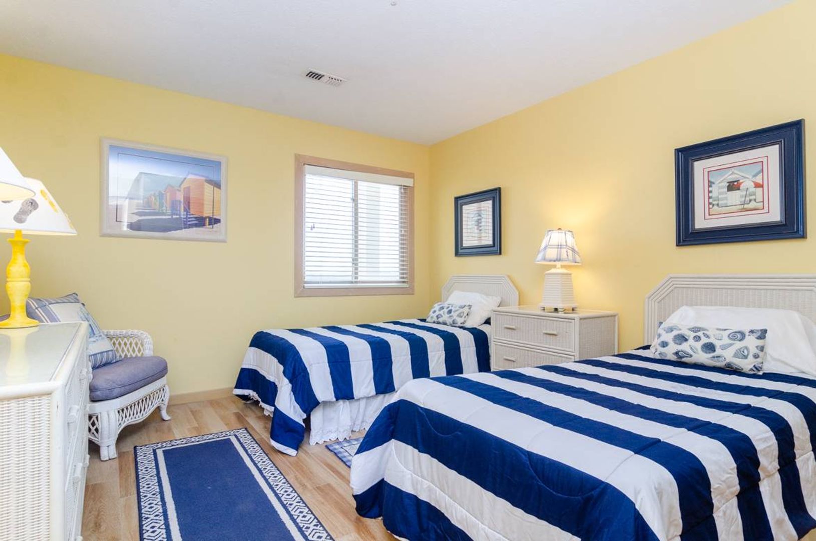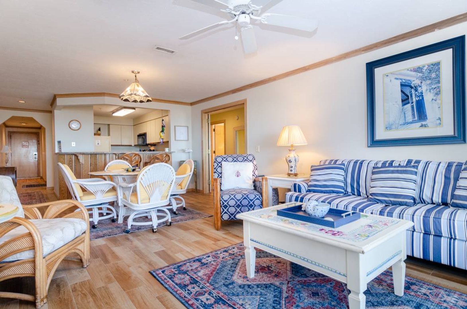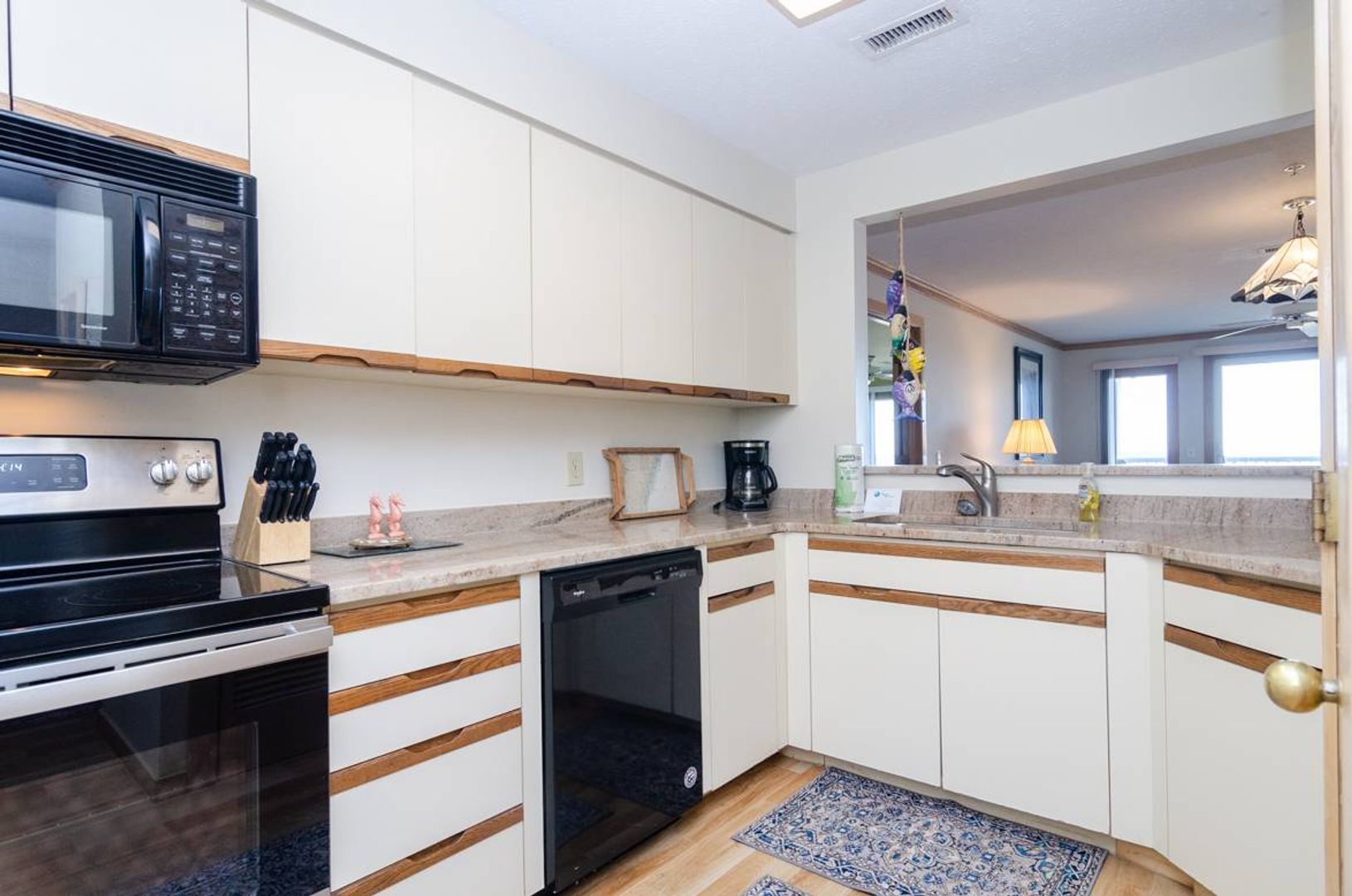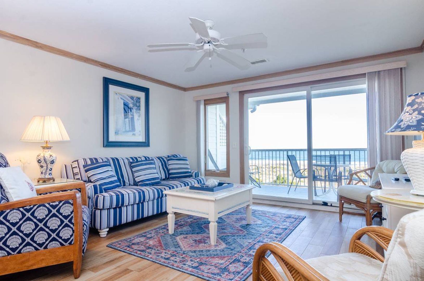 This comfortably updated 3-bedroom, 2-bathroom condo is located on the second floor of the desirable Wrightsville Dunes Complex which is on the secluded northern end of Wrightsville Beach. Once inside of the condo you will enter a hallway that opens to the beautiful ocean view. To the left there is a second hallway that leads to the two sound side guest bedrooms and the newly renovated hall bathroom. The first guest room is furnished with a queen-sized bed and neighbors the second guest bedroom with two twin size beds. At the end of the hall you will find a full bathroom that serves the guest rooms and features a tub, shower, and lovely vanity with granite counter tops. Just down the main hallway you will be welcomed by the wonderful great room that features an open concept kitchen, living, and dining area. The entire condo has been updated with gorgeous ceramic tile floors that boast an elegant wood grain finish and granite counter tops. A large sliding glass door and accented window fill the living room with natural light and entices you out to the gorgeous, covered patio facing the ocean.