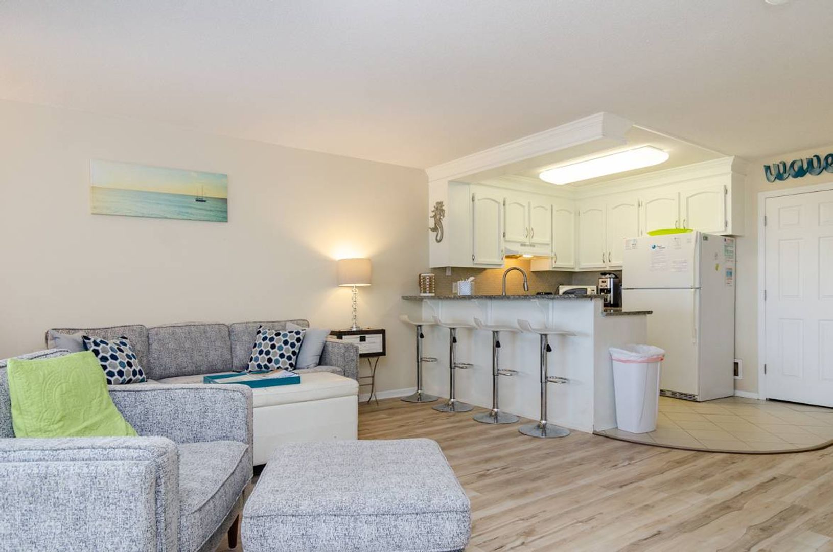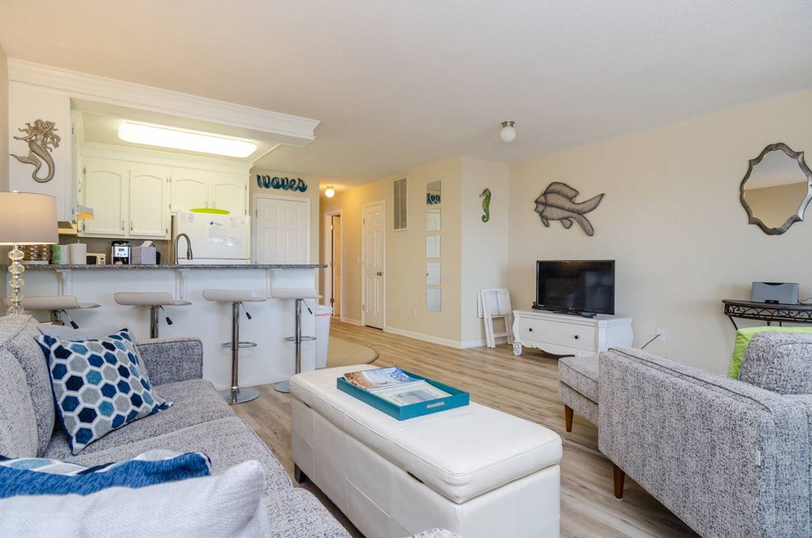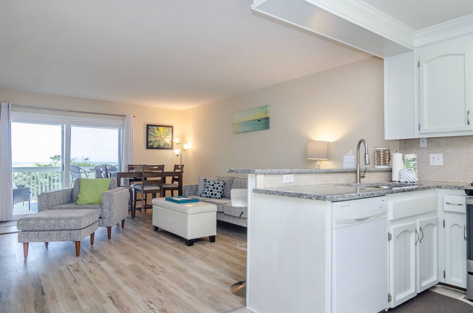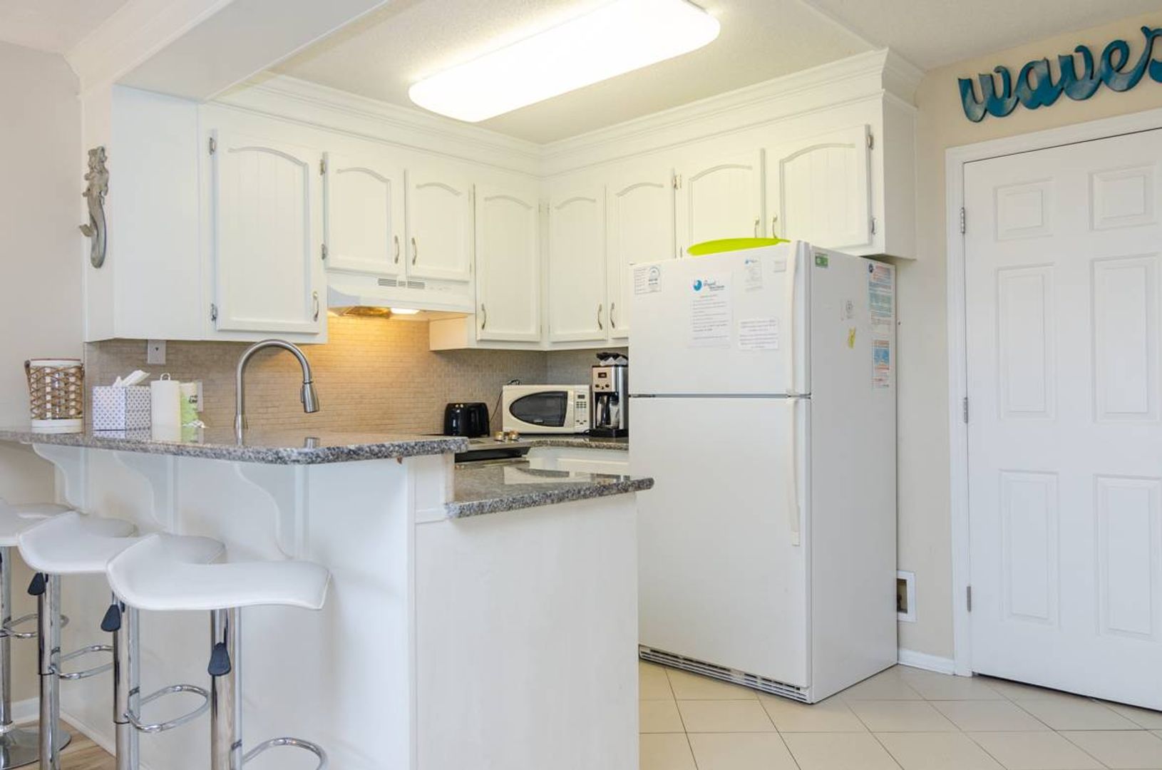 This first floor condo at Dunes II features a large combination kitchen and living room, plus a covered balcony. Recently remodeled, "Connally's Salty Daze" has two bedrooms and two full baths - one bedroom with a King bed, and one with a Queen. The unit features WiFi with live streaming through Hulu Live instead of cable TV. There is private beach access directly behind the building.